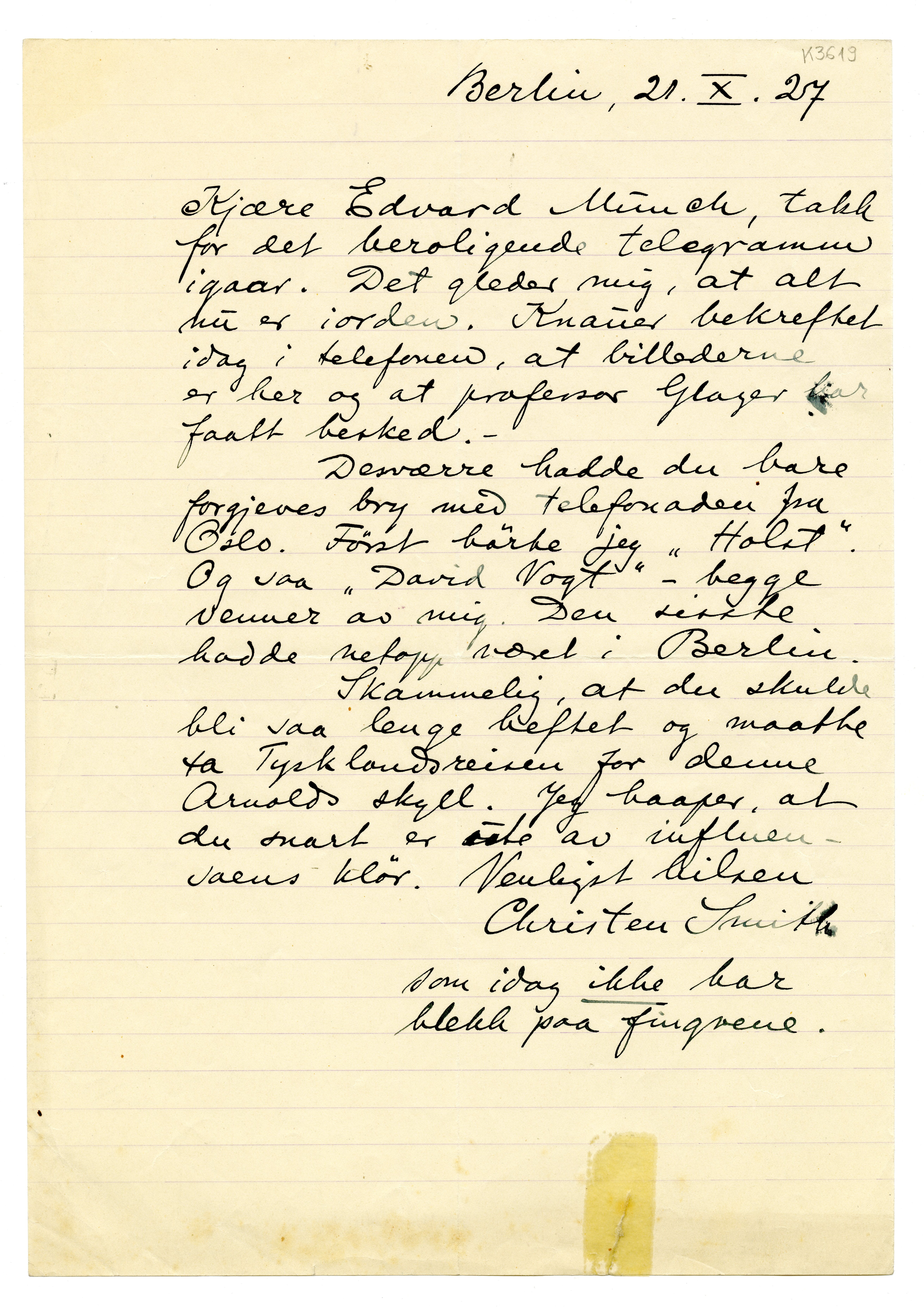 MM K 3619, Munchmuseet. Datert 21.10.1927. Brev fra Christen Smith.