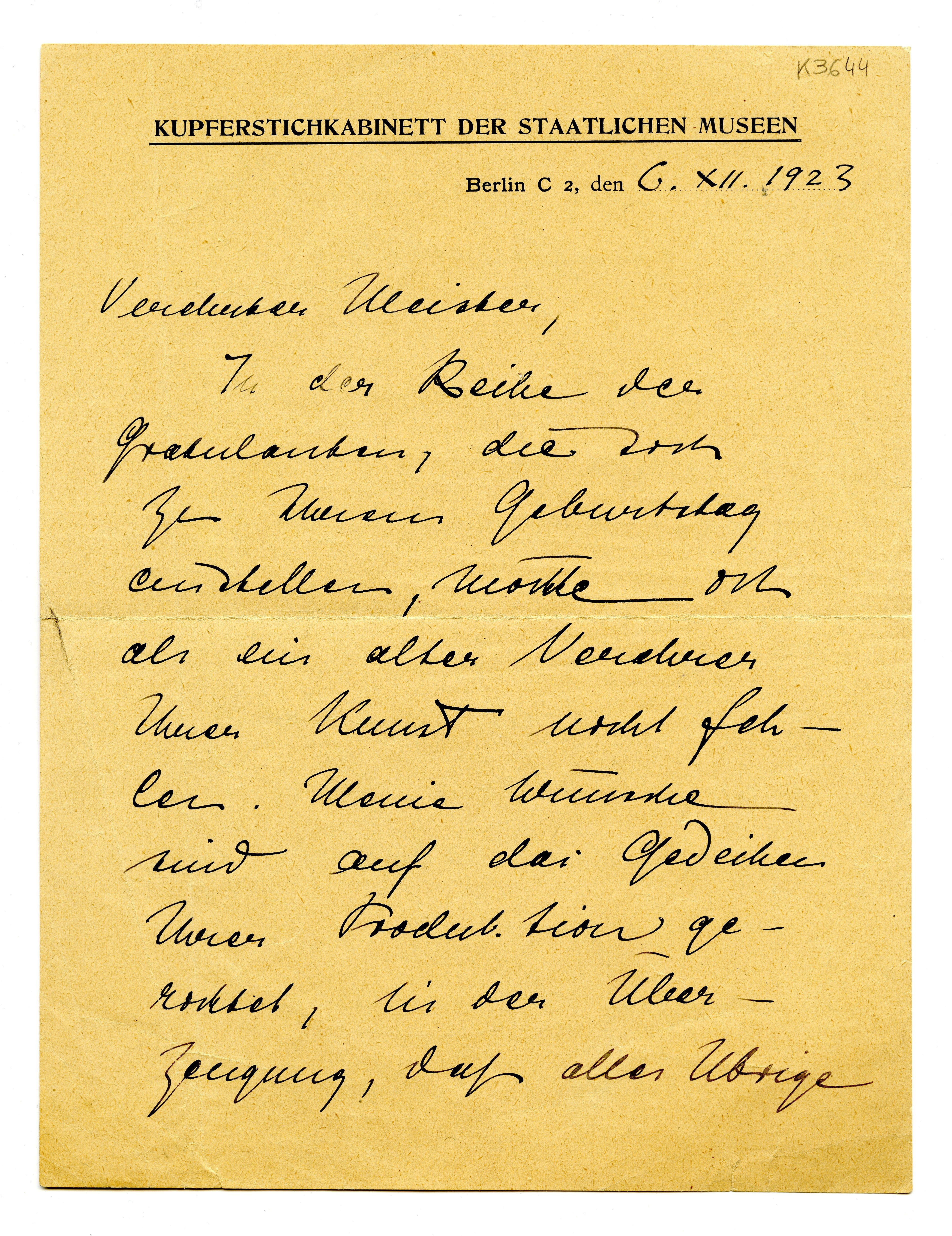 MM K 3644, Munchmuseet. Datert 06.12.1923. Brev fra Max I. Friedländer, Staatliche Museen (Königliche Museen).