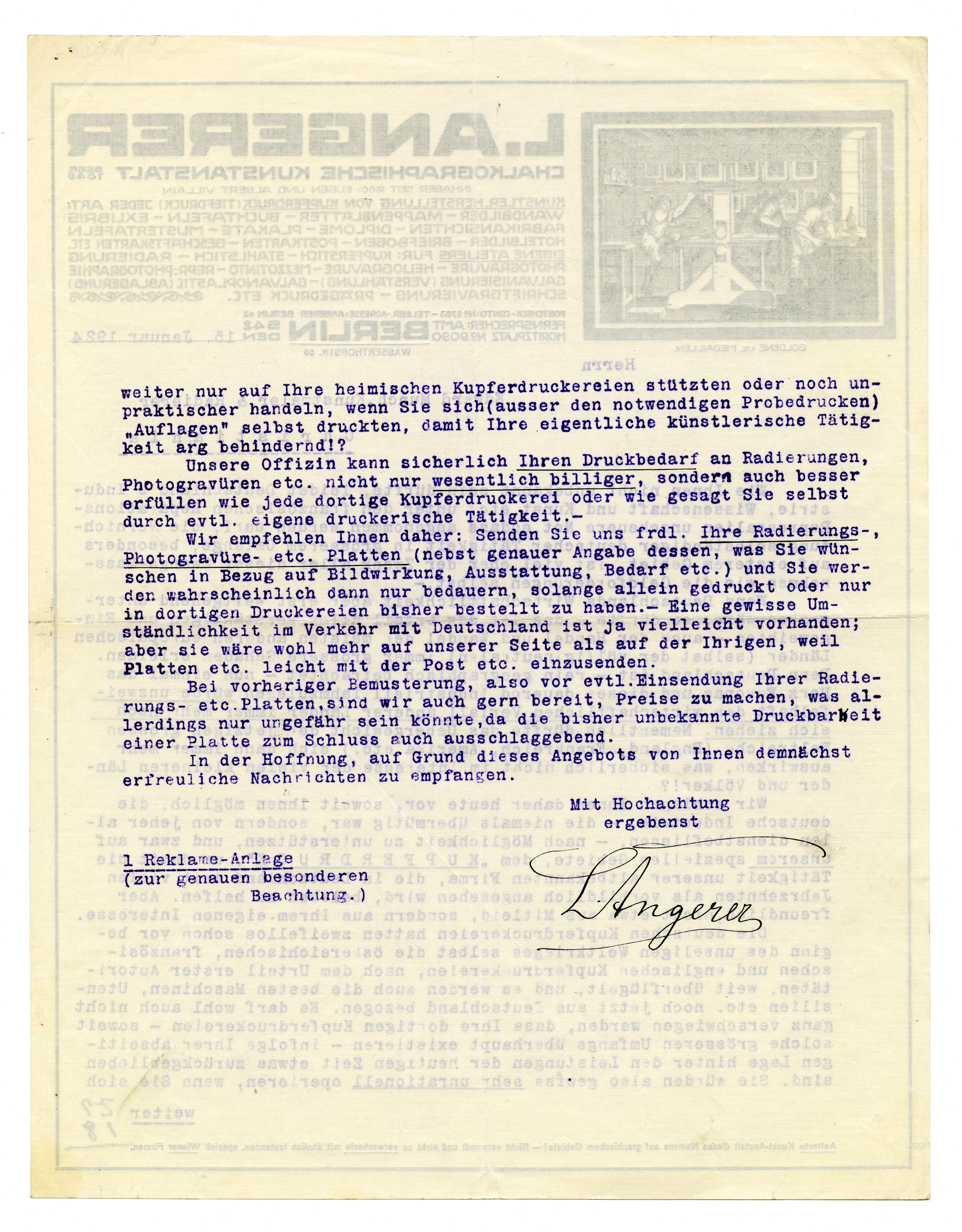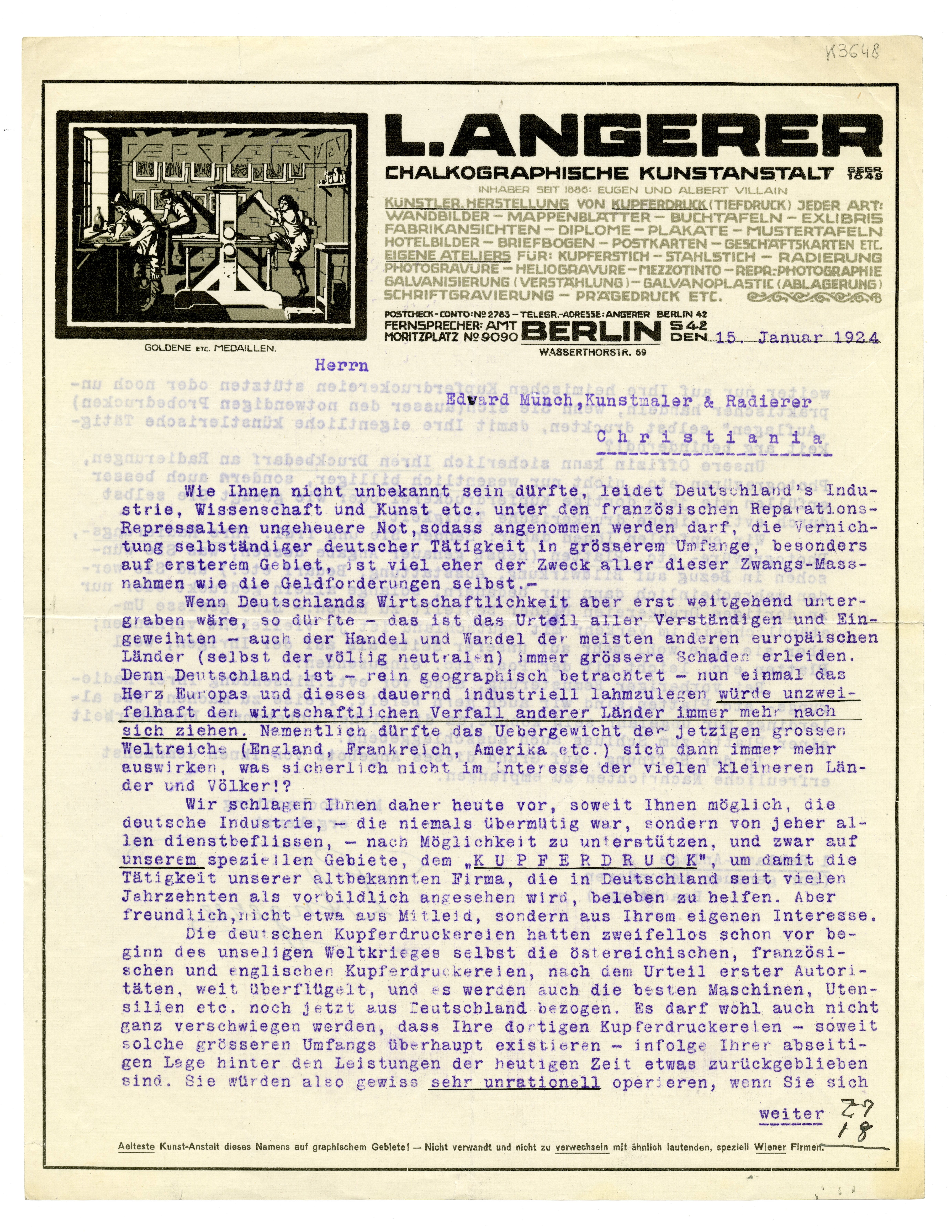 MM K 3648, Munchmuseet. Datert 15.01.1924. Brev fra L. Angerer Chalkographische Kunstanstalt.