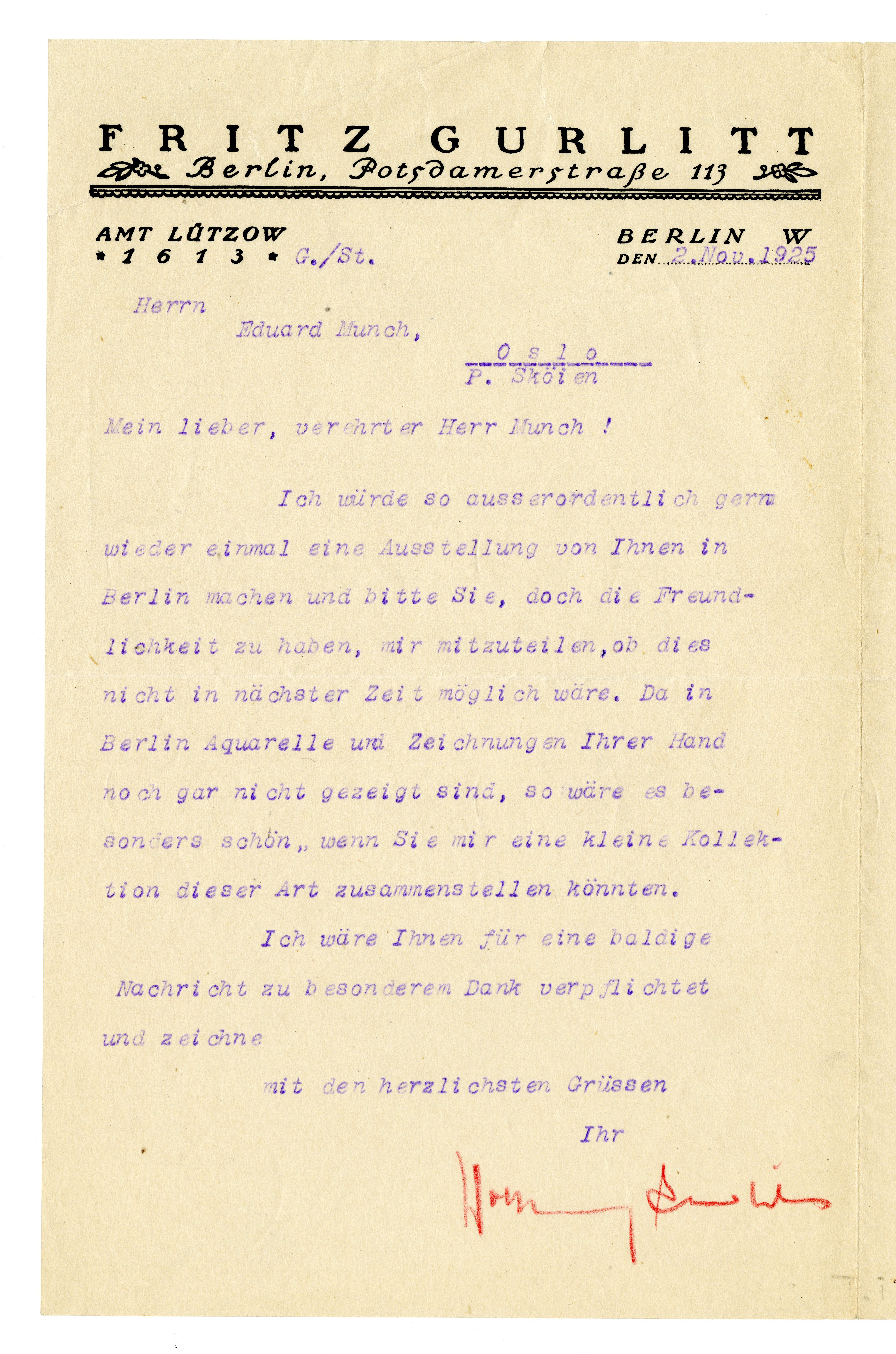 MM K 3660, Munchmuseet. Datert 02.11.1925. Brev fra Wolfgang Gurlitt, Fritz Gurlitt.
