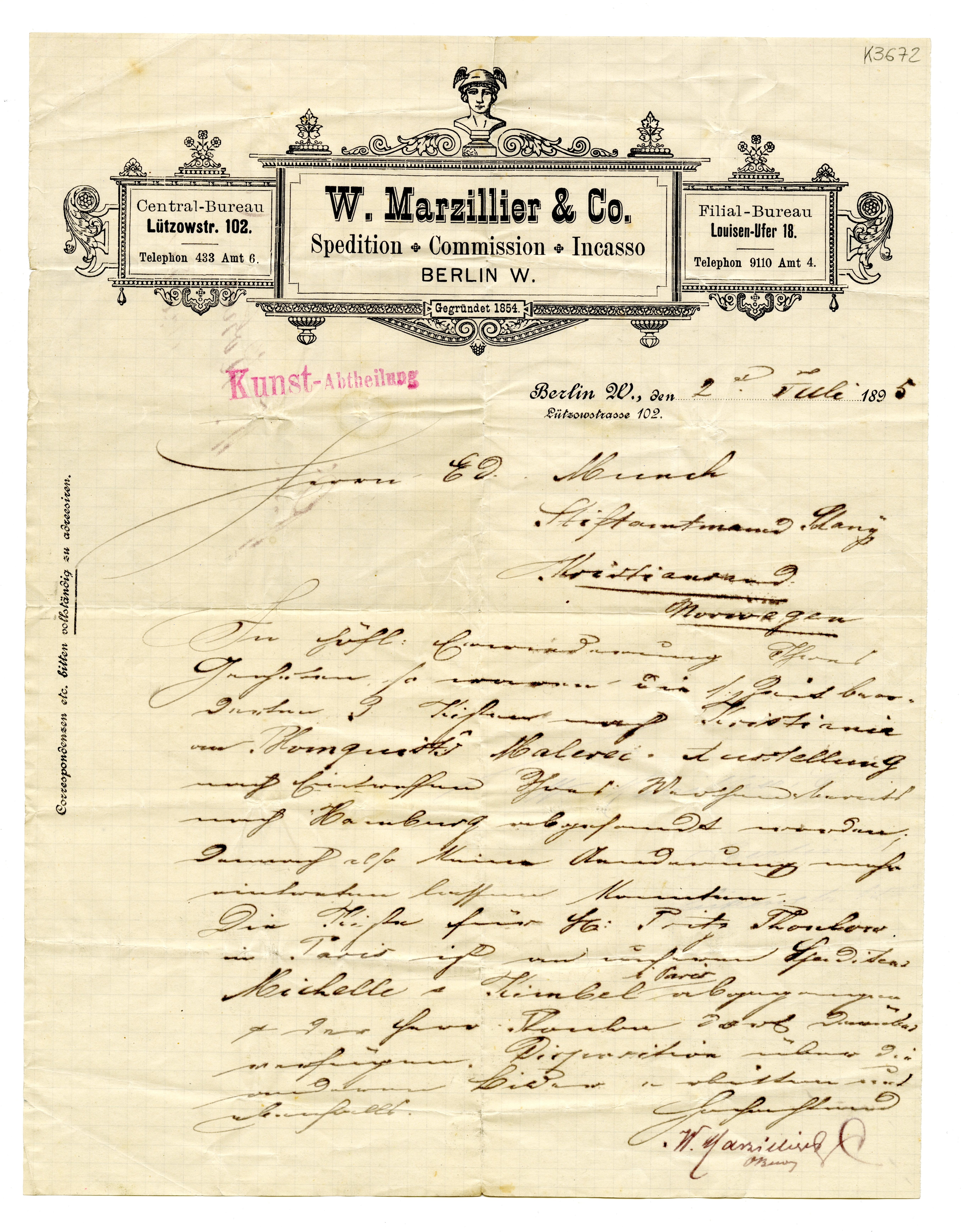 MM K 3672, Munchmuseet. Datert 02.07.1895. Brev fra W.& Co. Spedition - Commission - Incasso Marzillier.