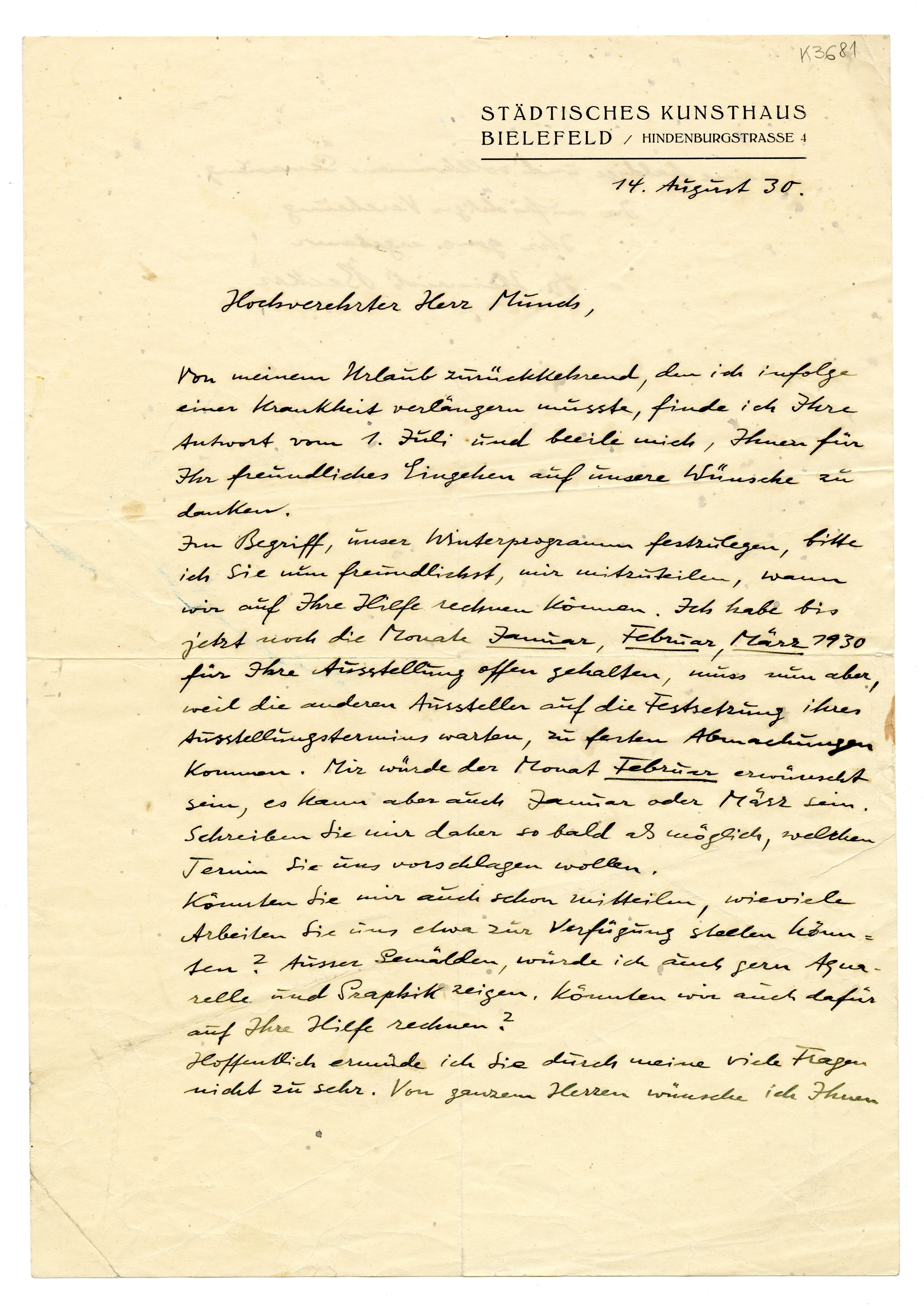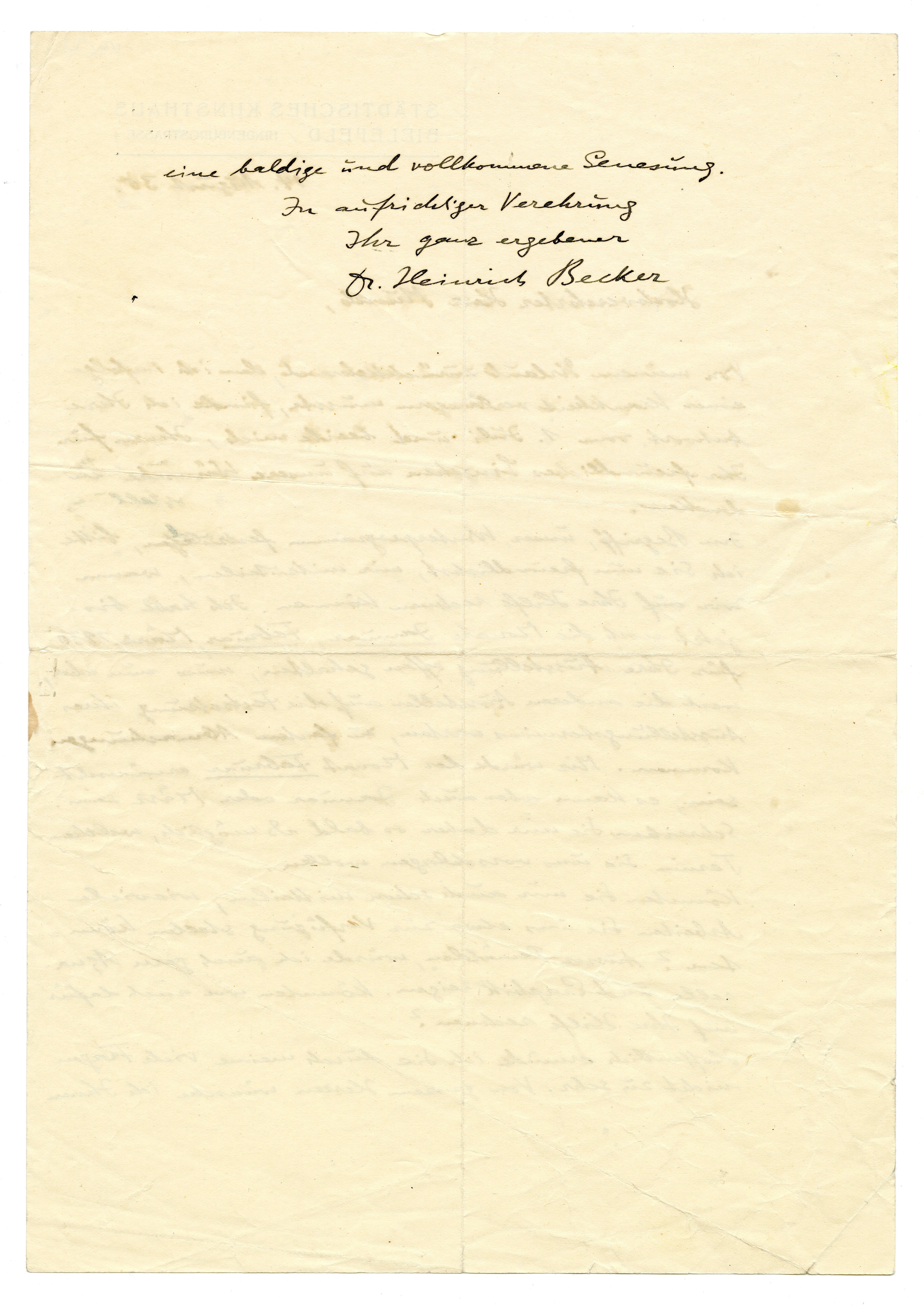 MM K 3681, Munchmuseet. Datert 14.08.1930. Brev fra Heinrich Becker, Städtisches Kunsthaus.