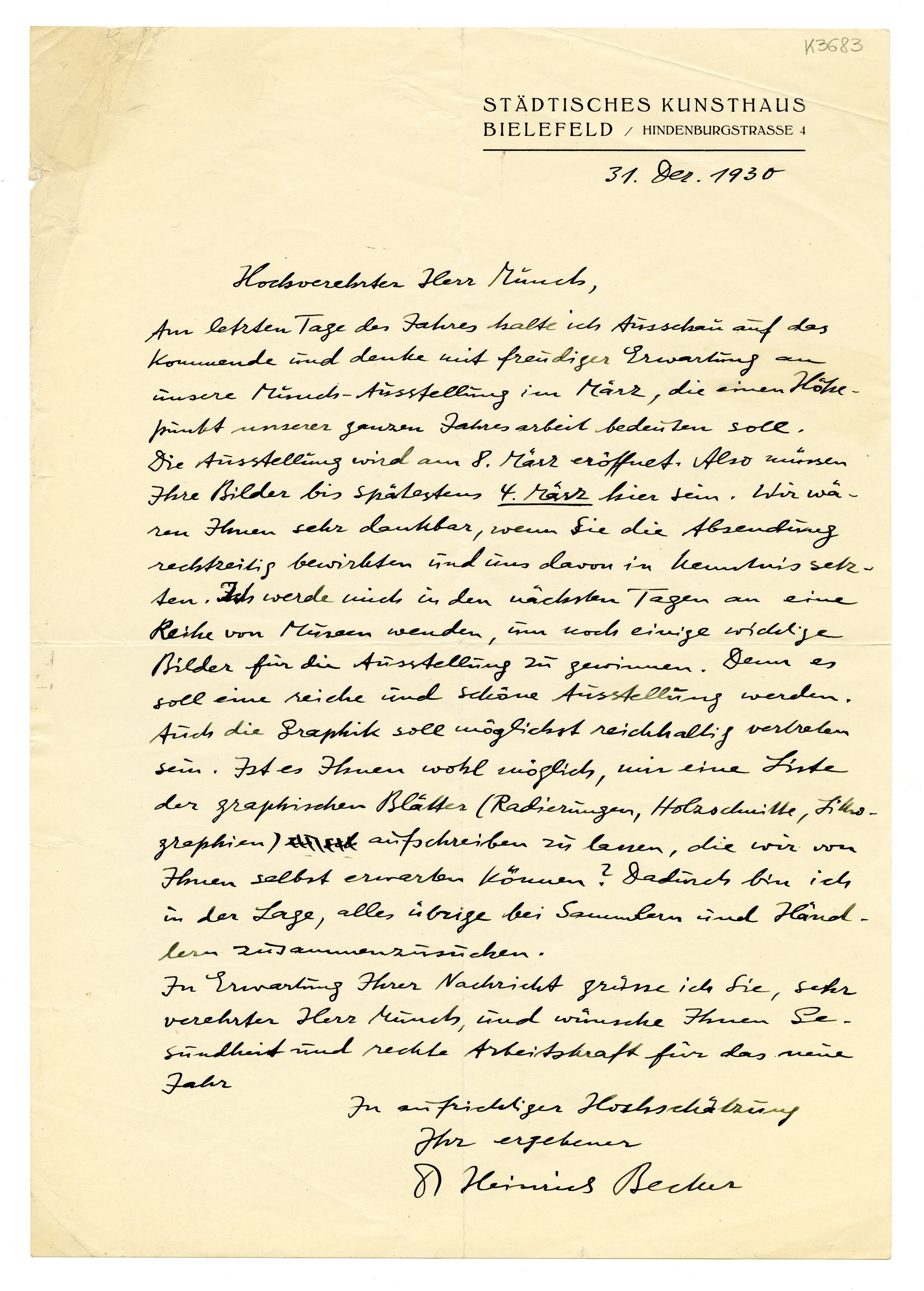 MM K 3683, Munchmuseet. Datert 31.12.1930. Brev fra Heinrich Becker, Städtisches Kunsthaus.
