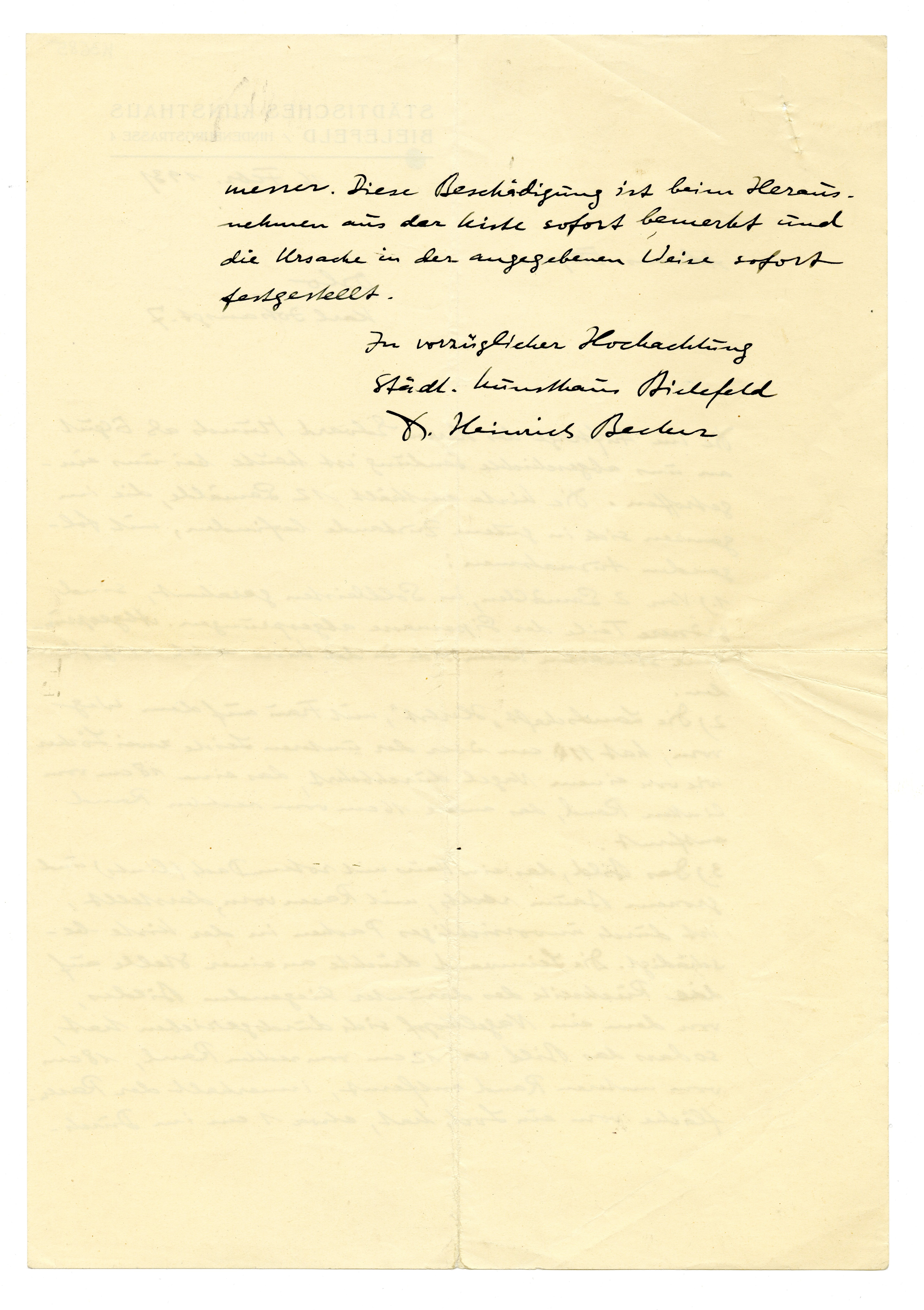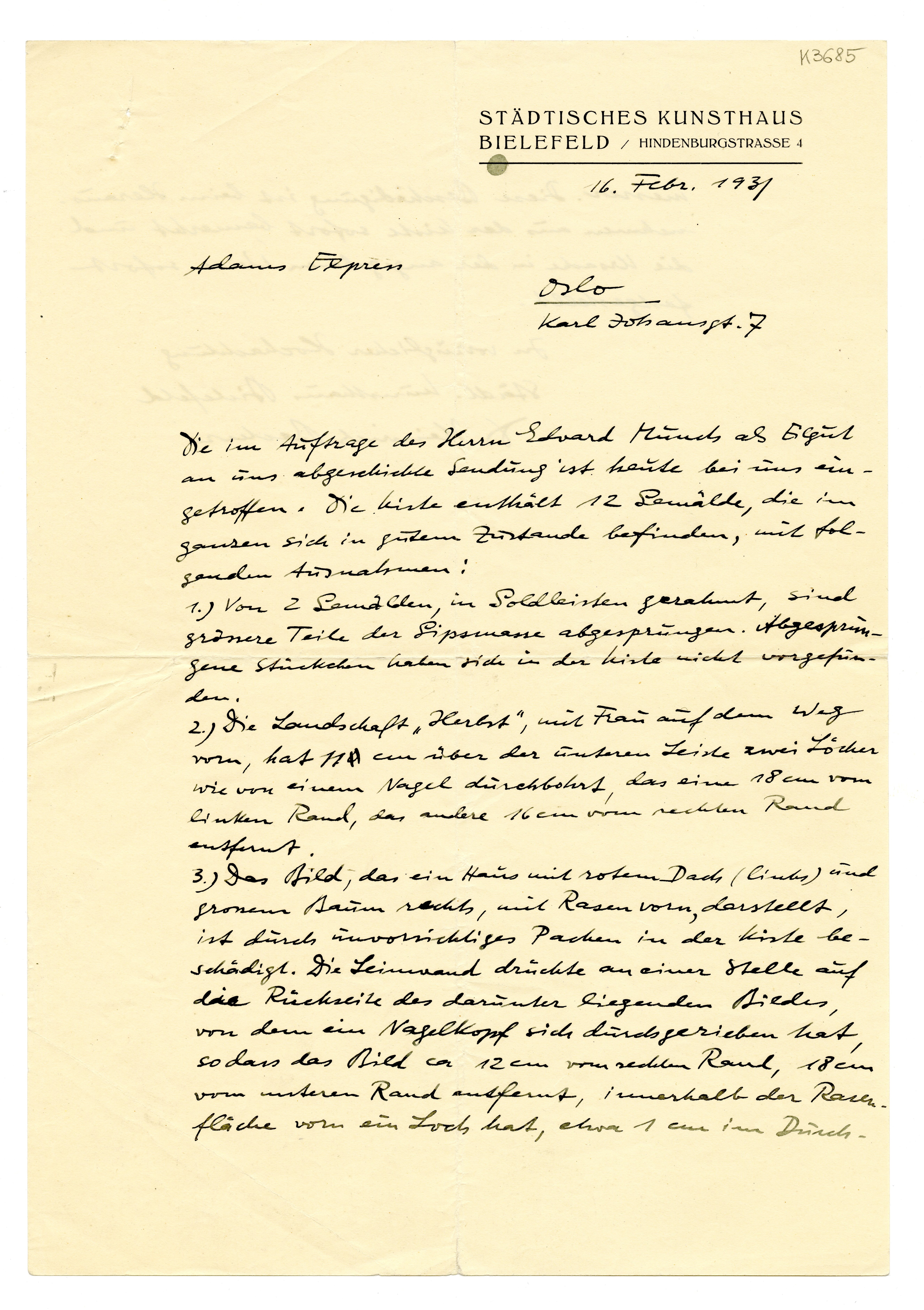 MM K 3685, Munchmuseet. Datert 16.02.1931. Brev fra Heinrich Becker, Städtisches Kunsthaus.