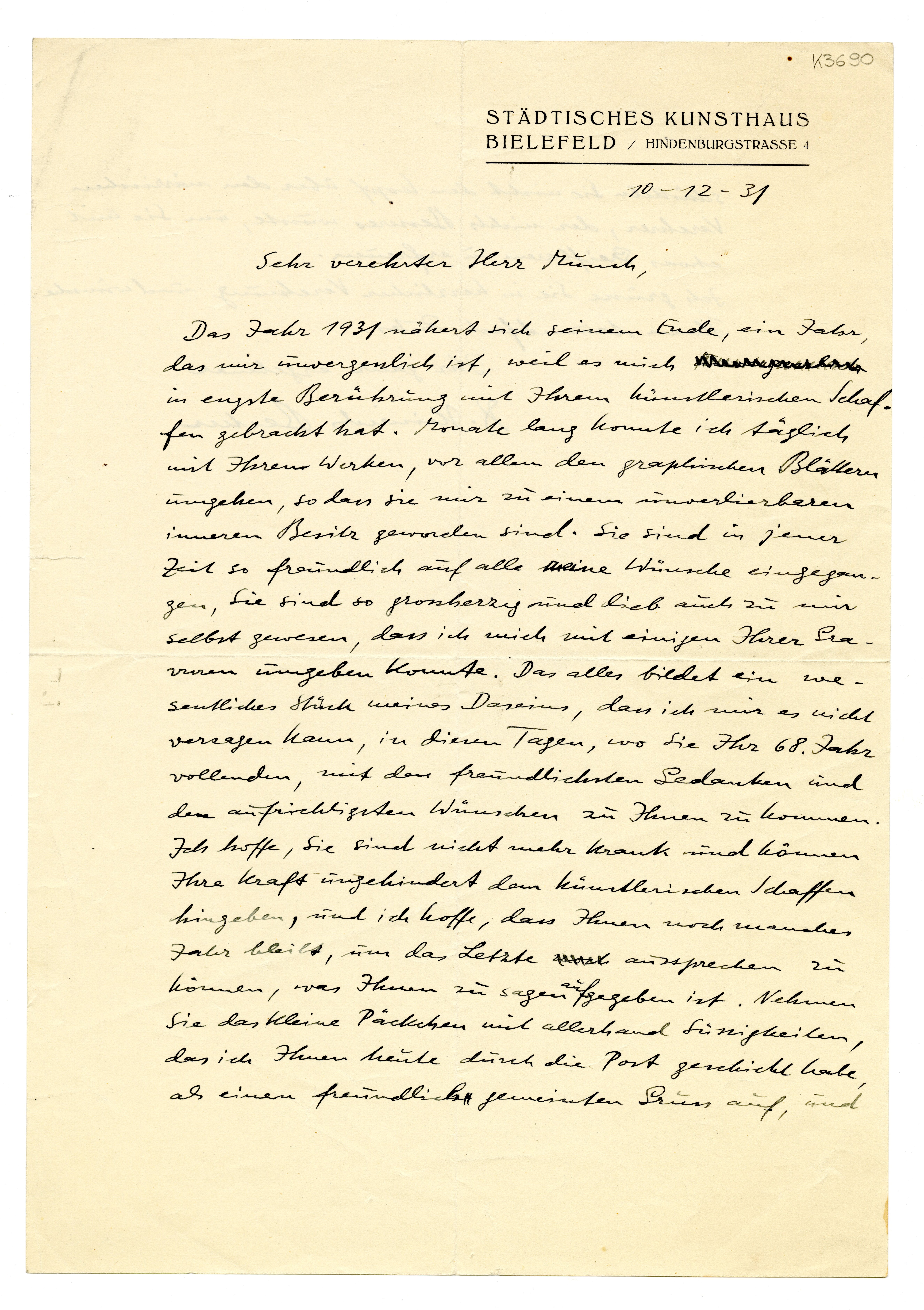 MM K 3690, Munchmuseet. Datert 10.12.1931. Brev fra Heinrich Becker, Städtisches Kunsthaus.