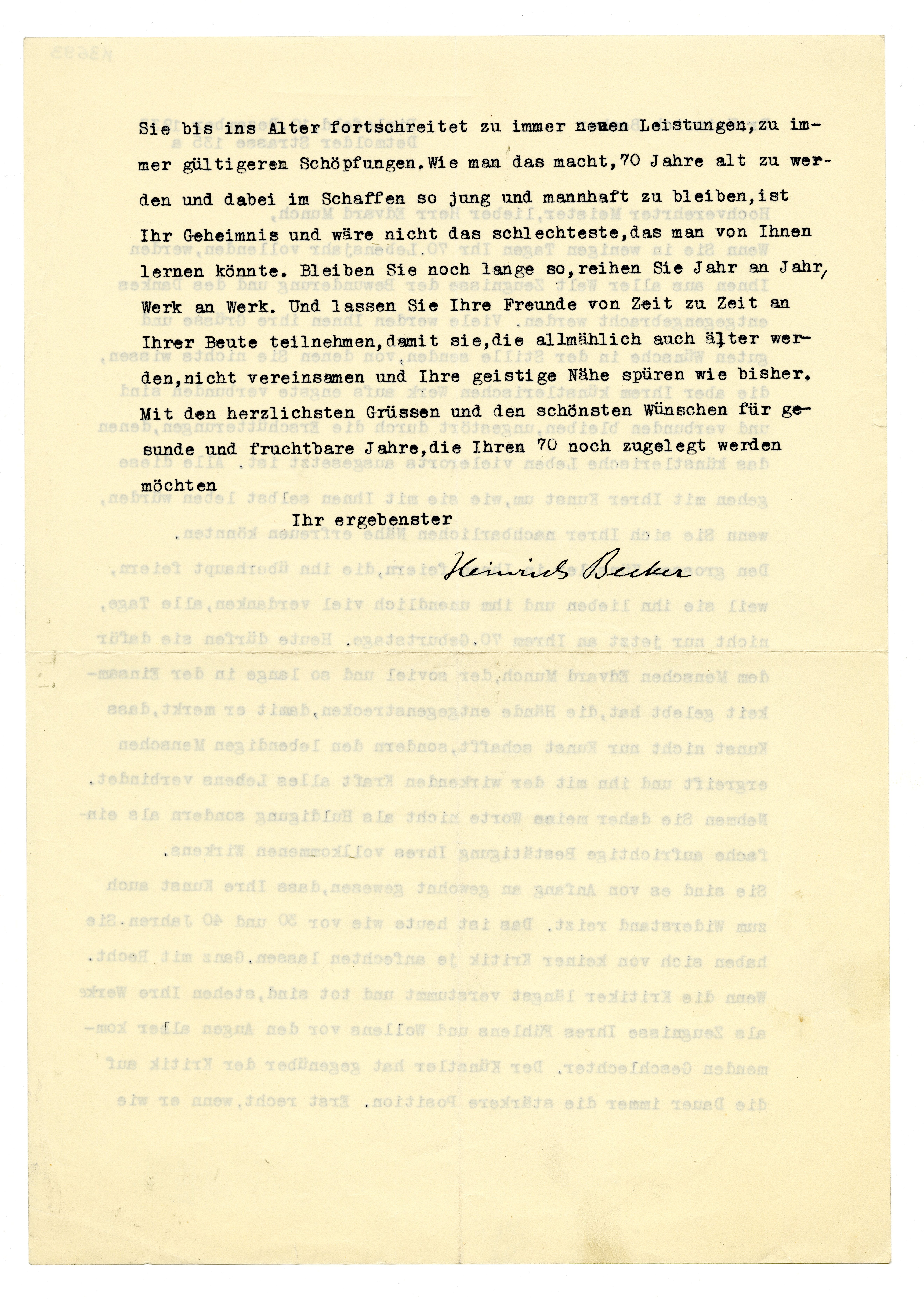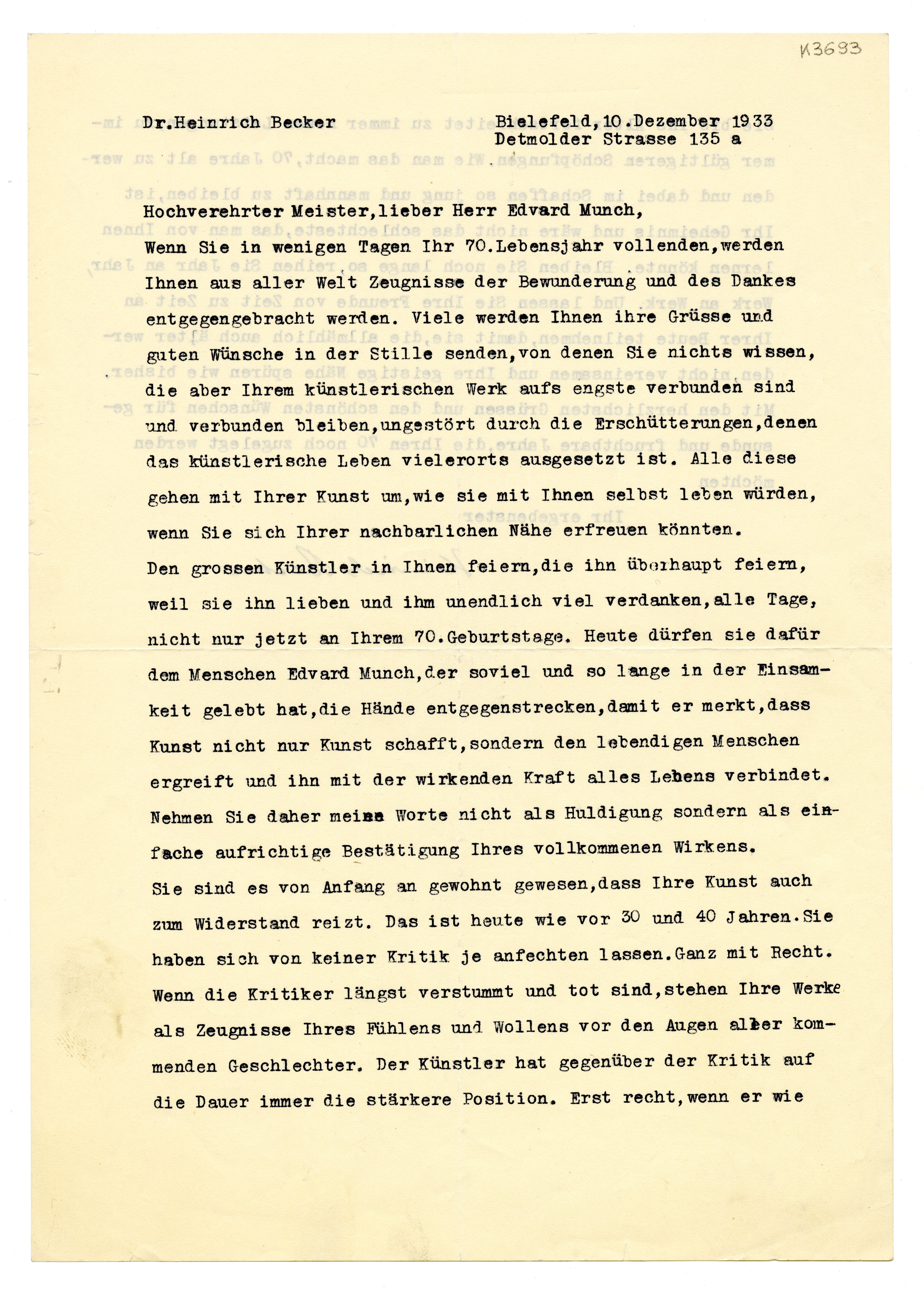 MM K 3693, Munchmuseet. Datert 10.12.1933. Brev fra Heinrich Becker, Städtisches Kunsthaus.