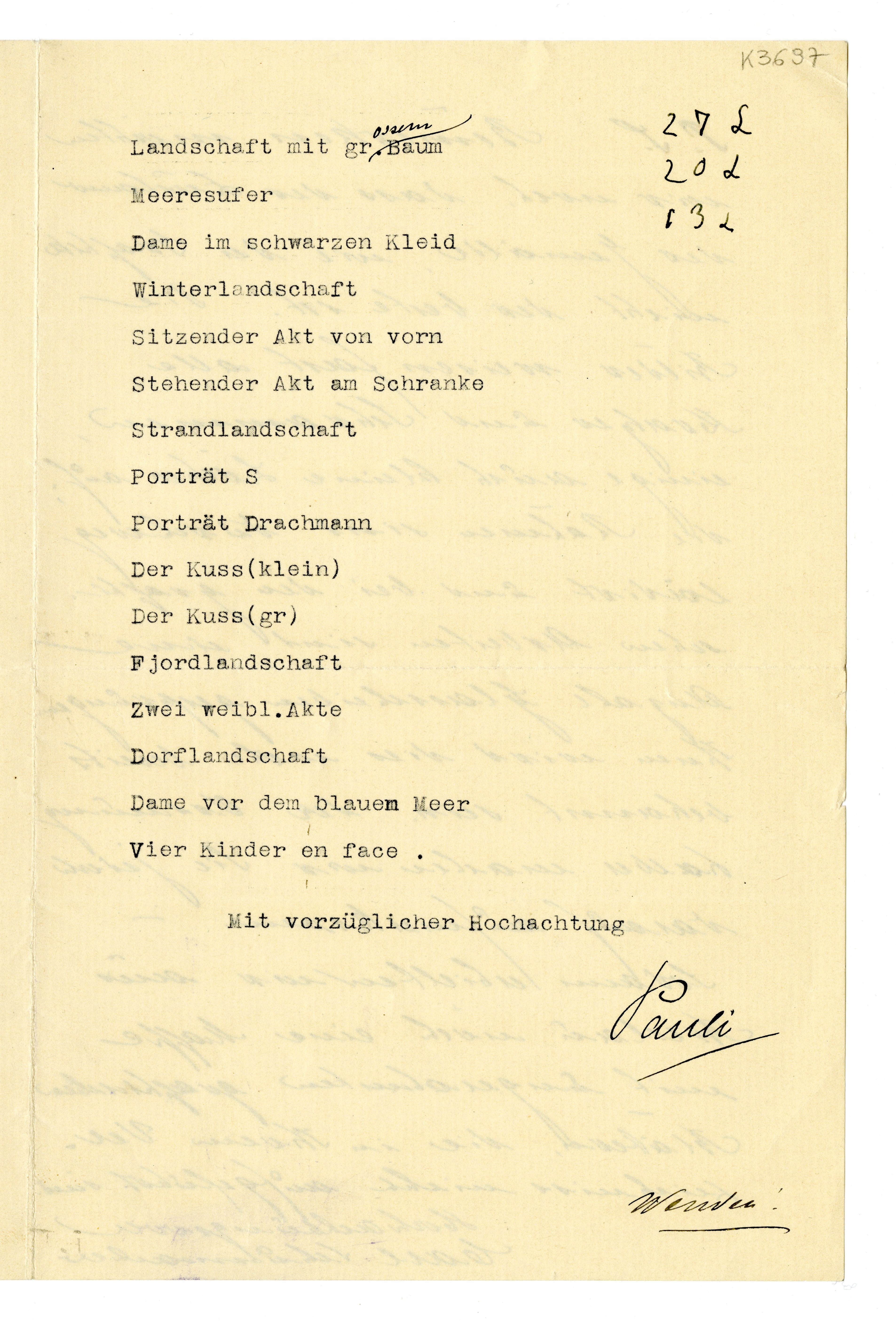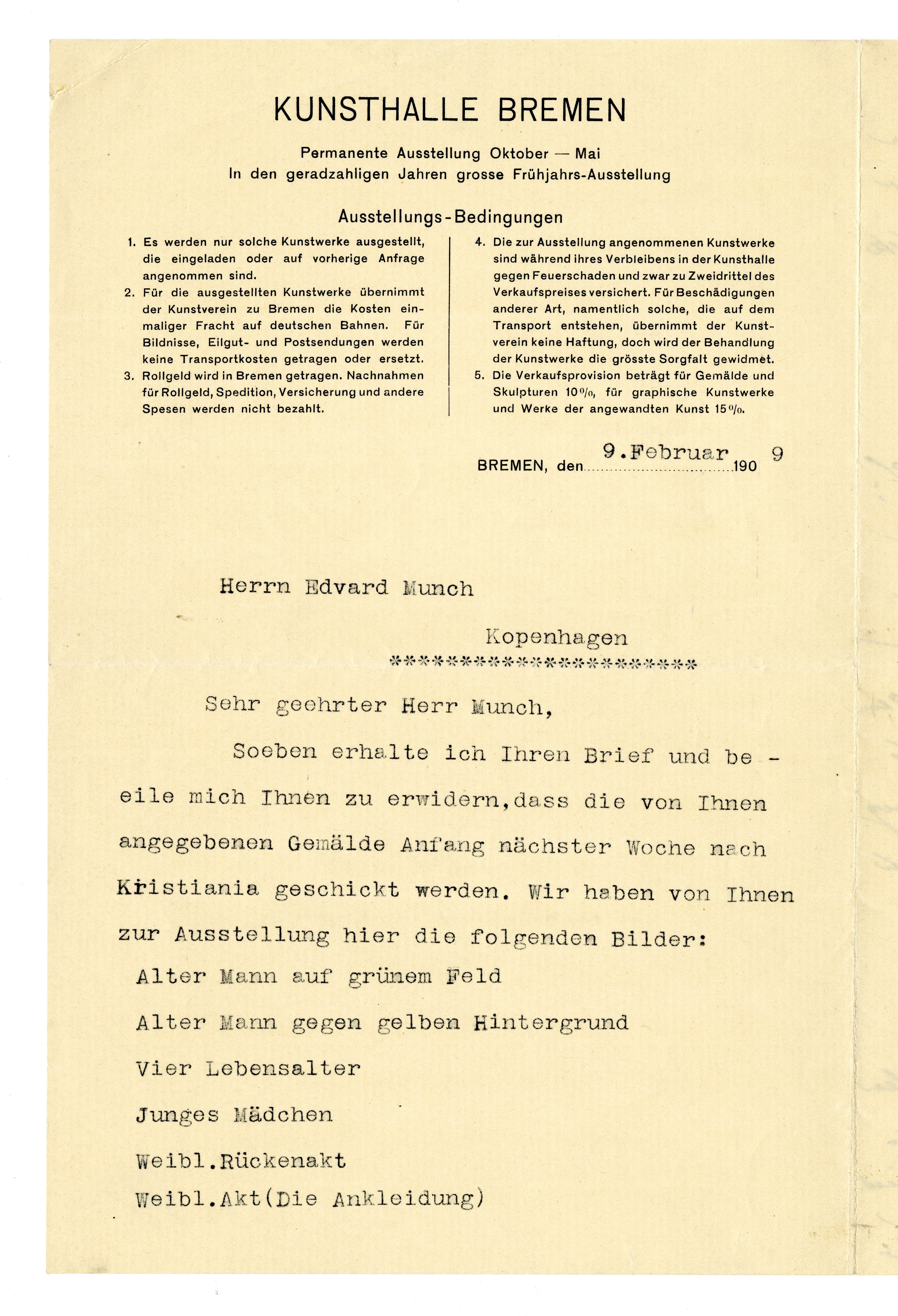 MM K 3697, Munchmuseet. Datert 09.02.1909. Brev fra Gustav Pauli, Carl Schumacher, Kunsthalle Bremen.