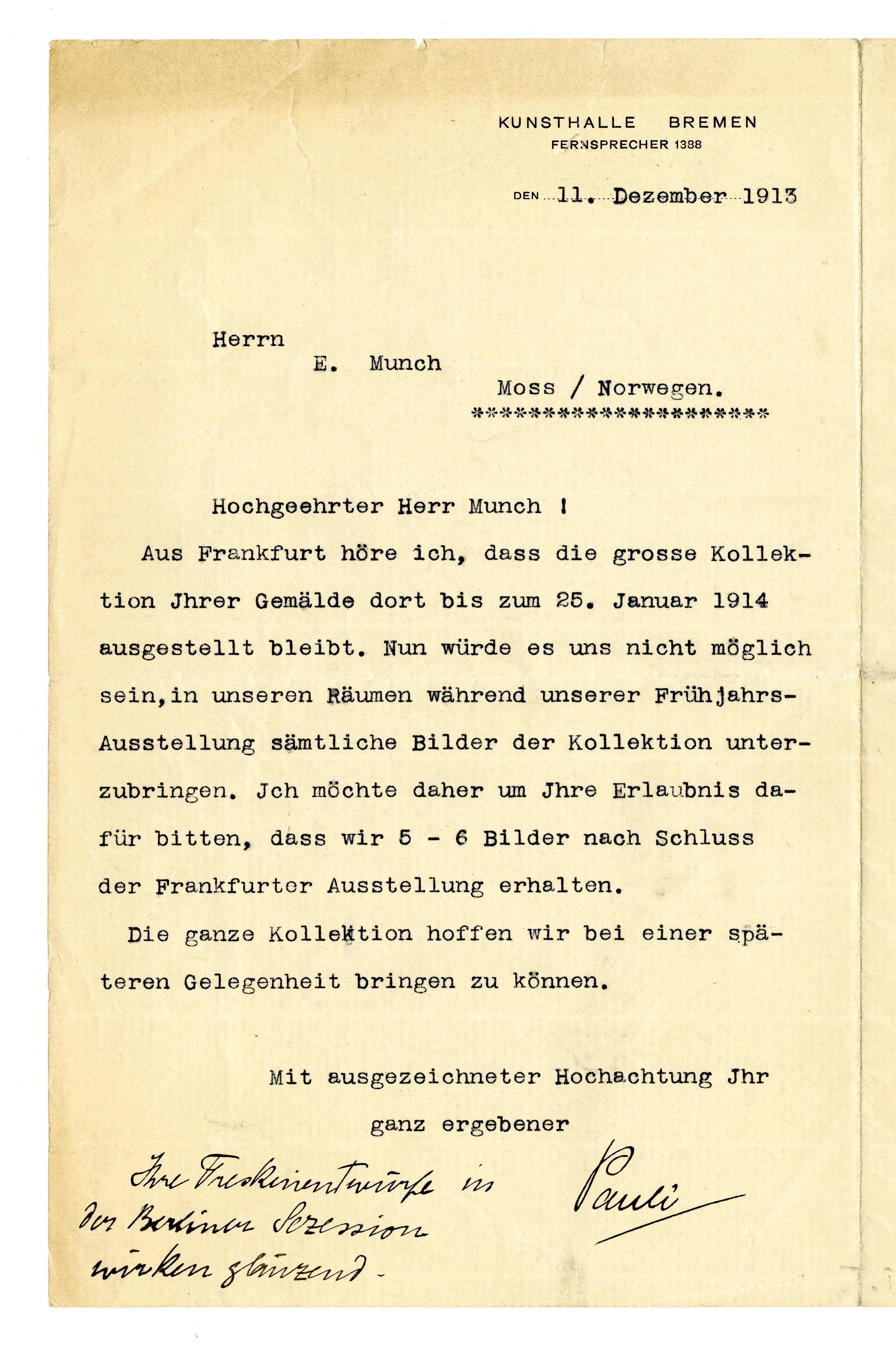 MM K 3701, Munchmuseet. Datert 11.12.1913. Brev fra Gustav Pauli, Kunsthalle Bremen.