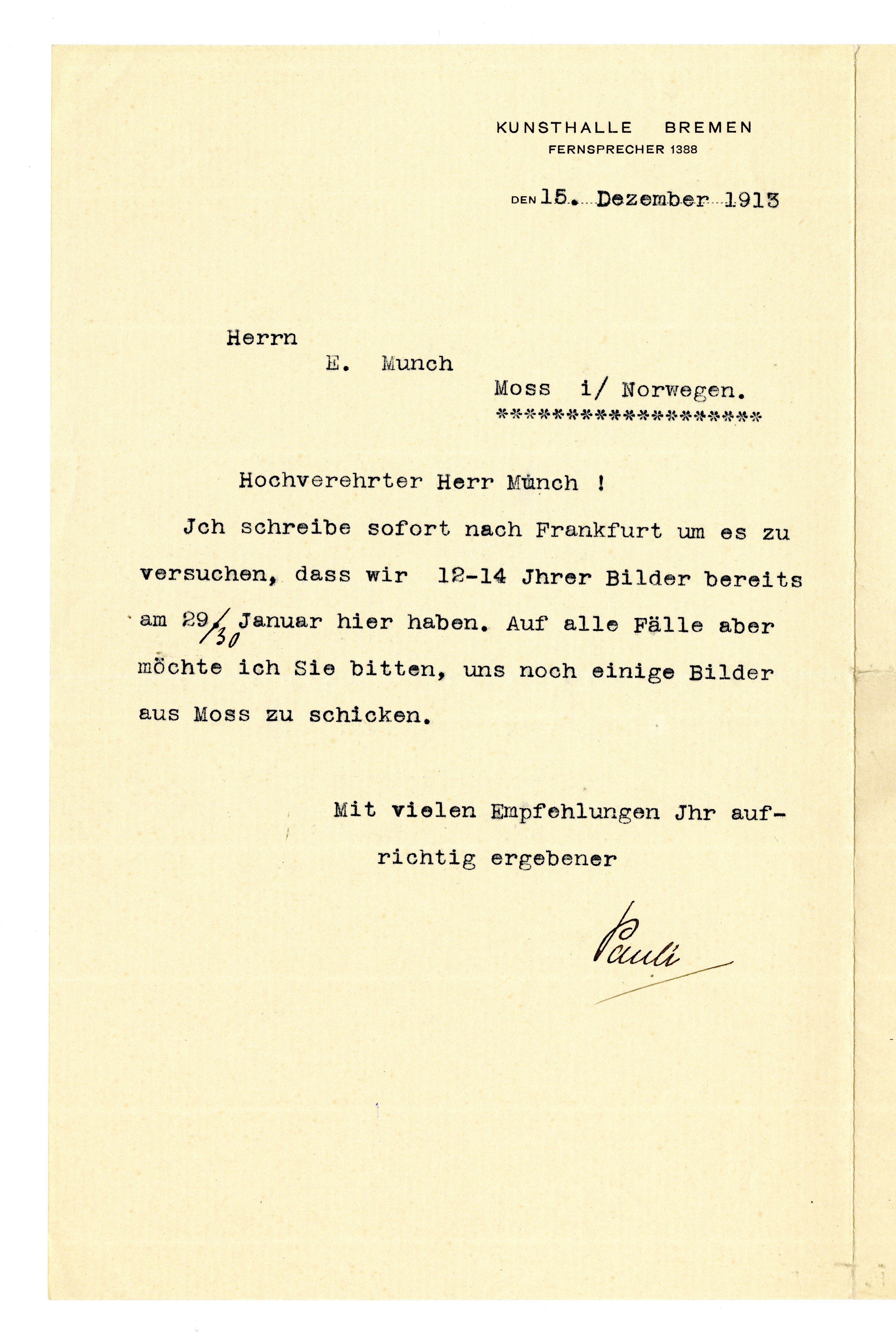 MM K 3702, Munchmuseet. Datert 15.12.1913. Brev fra Gustav Pauli, Kunsthalle Bremen.