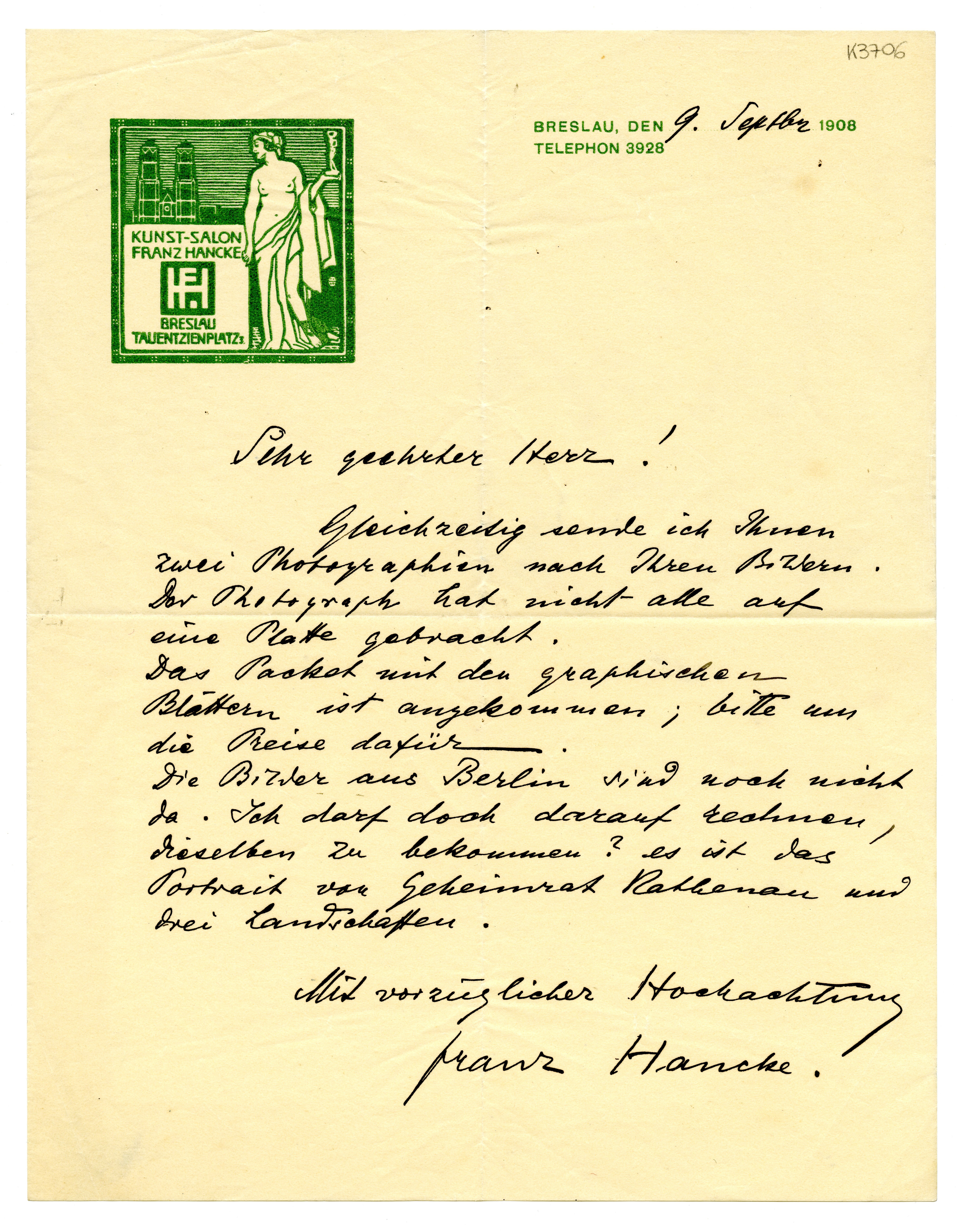 MM K 3706, Munchmuseet. Datert 09.09.1908. Brev fra Franz Hancke, Kunst-Salon Franz Hancke.