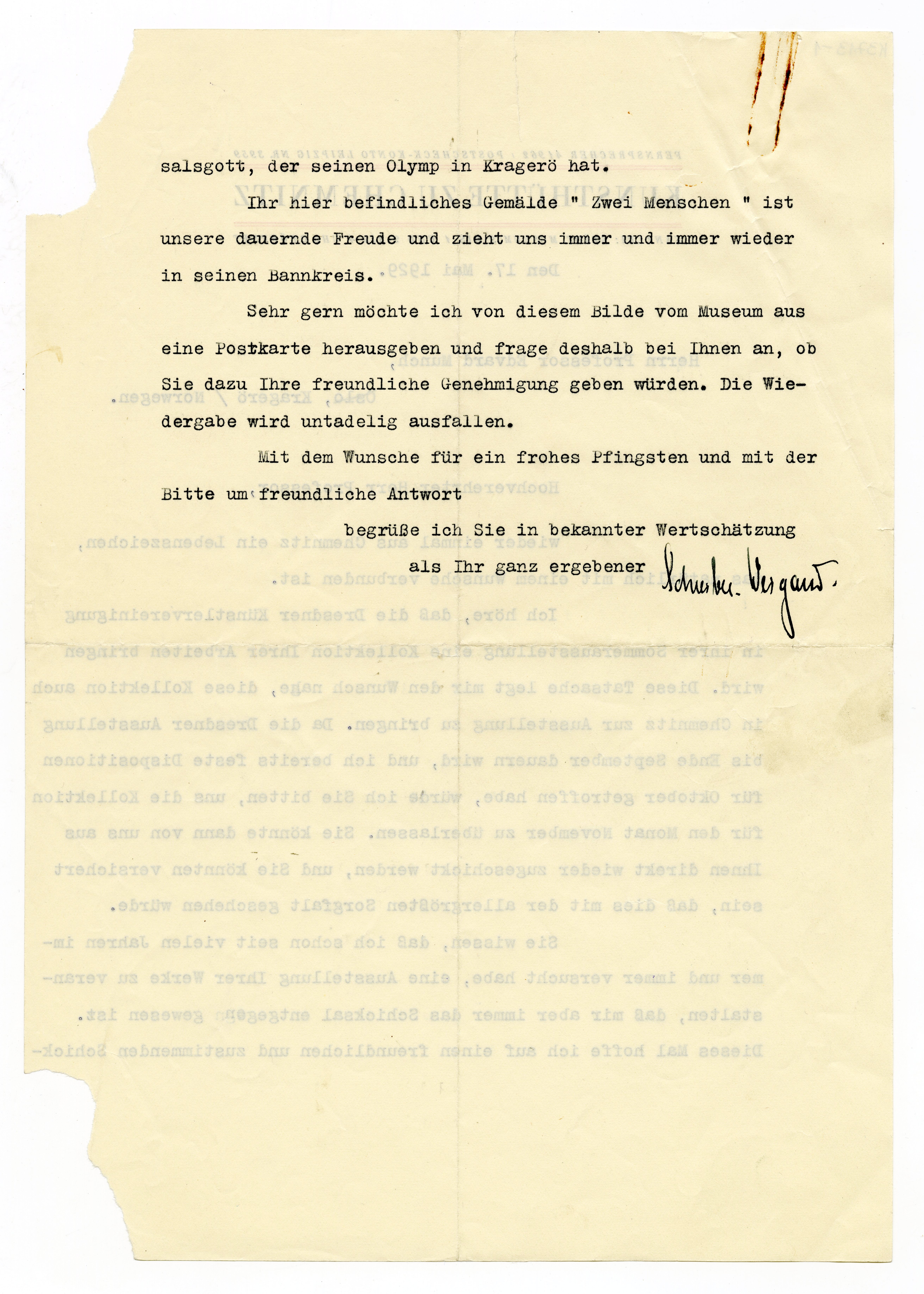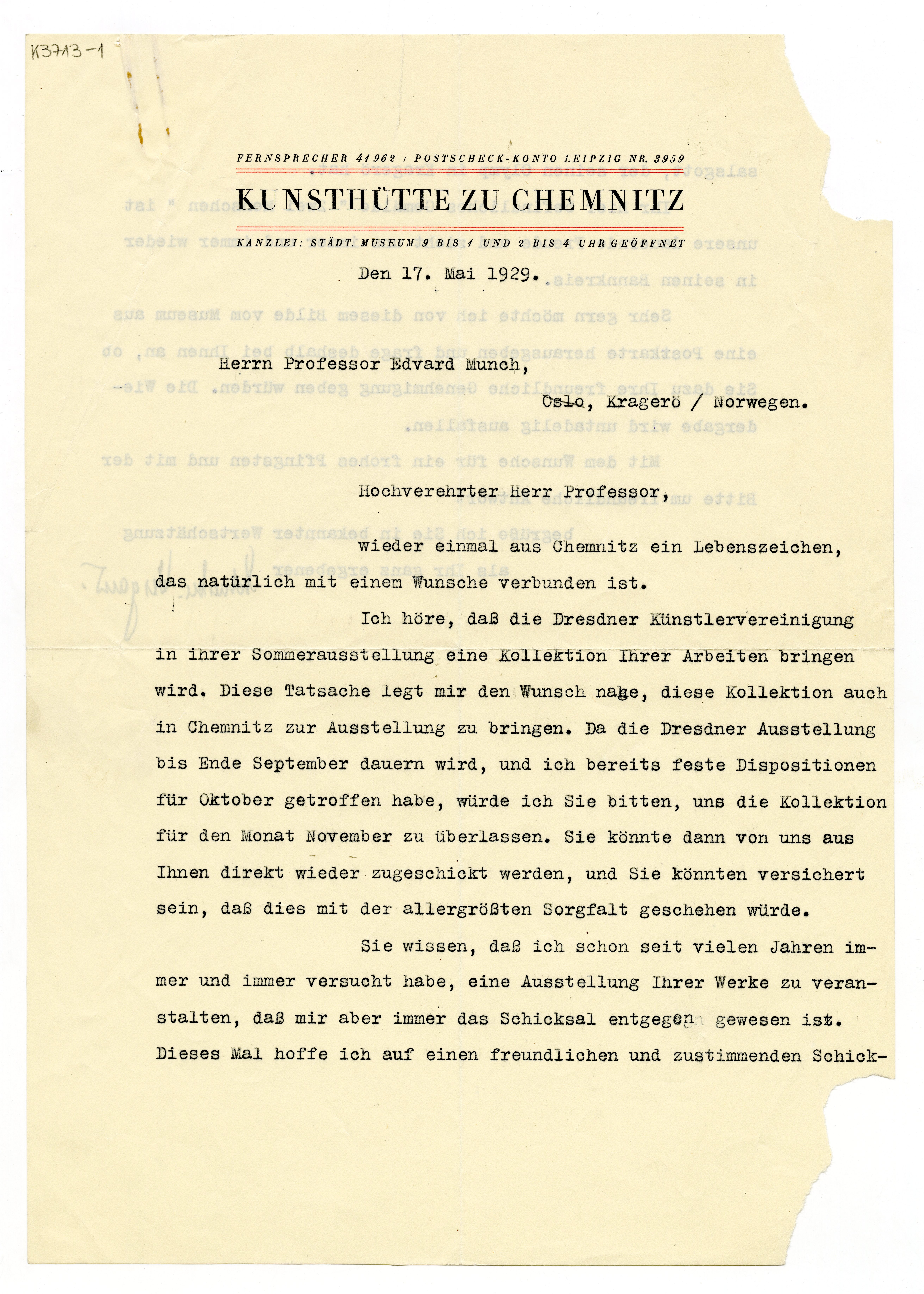 MM K 3713, Munchmuseet. Datert 17.05.1929. Brev fra Friedrich Schreiber-Weigand, Kunsthütte zu Chemnitz.
