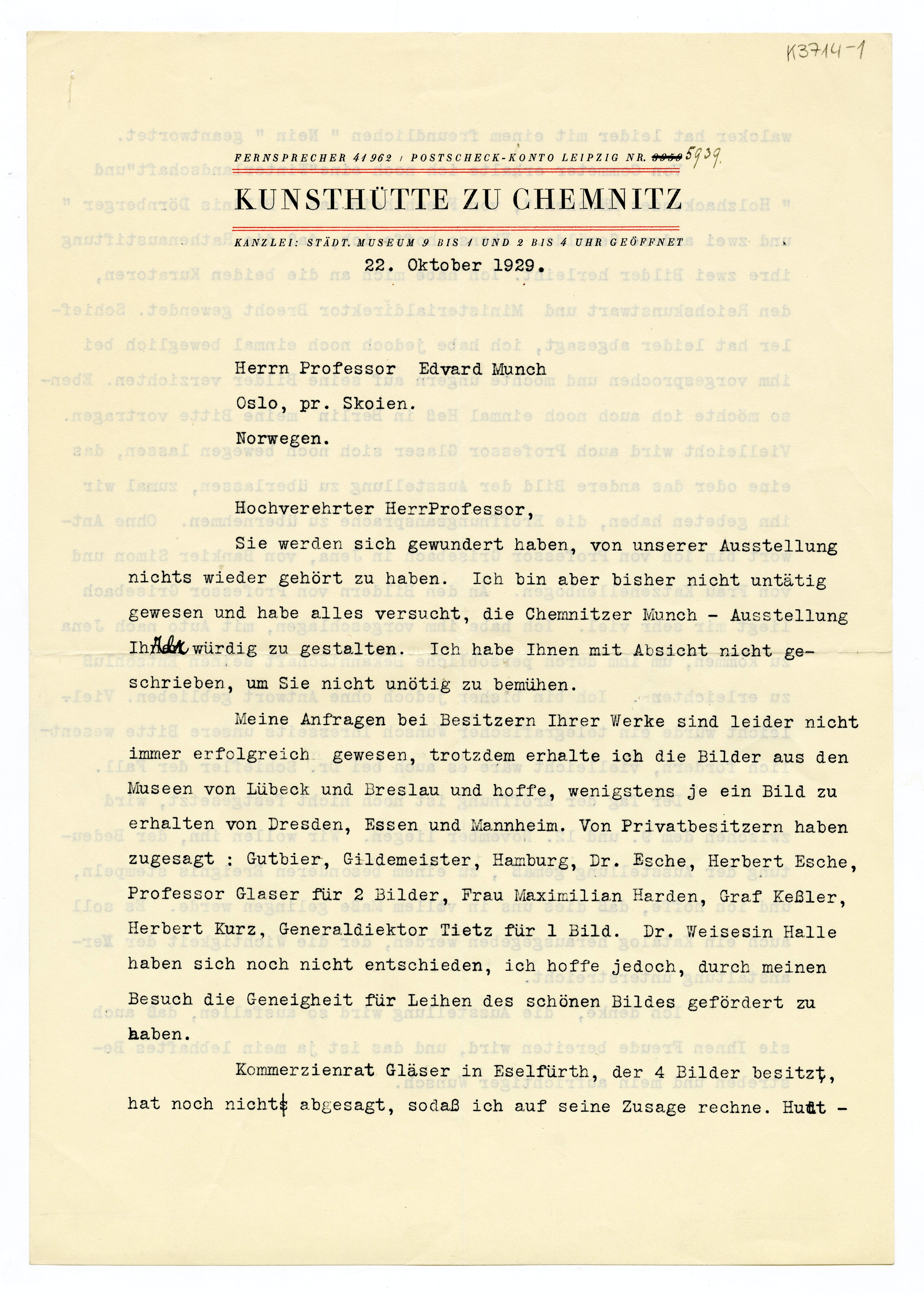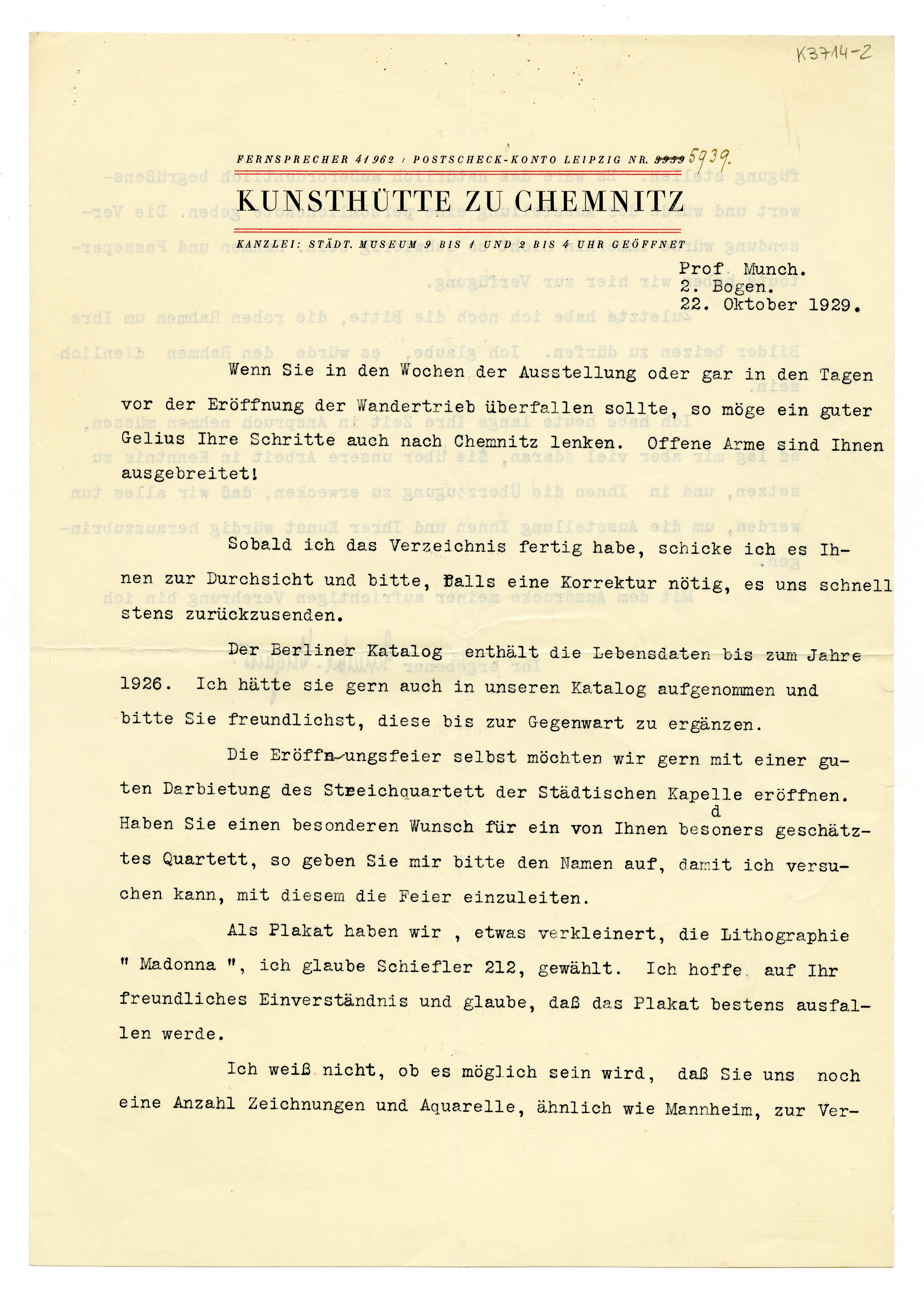MM K 3714, Munchmuseet. Datert 22.10.1929. Brev fra Friedrich Schreiber-Weigand, Kunsthütte zu Chemnitz.