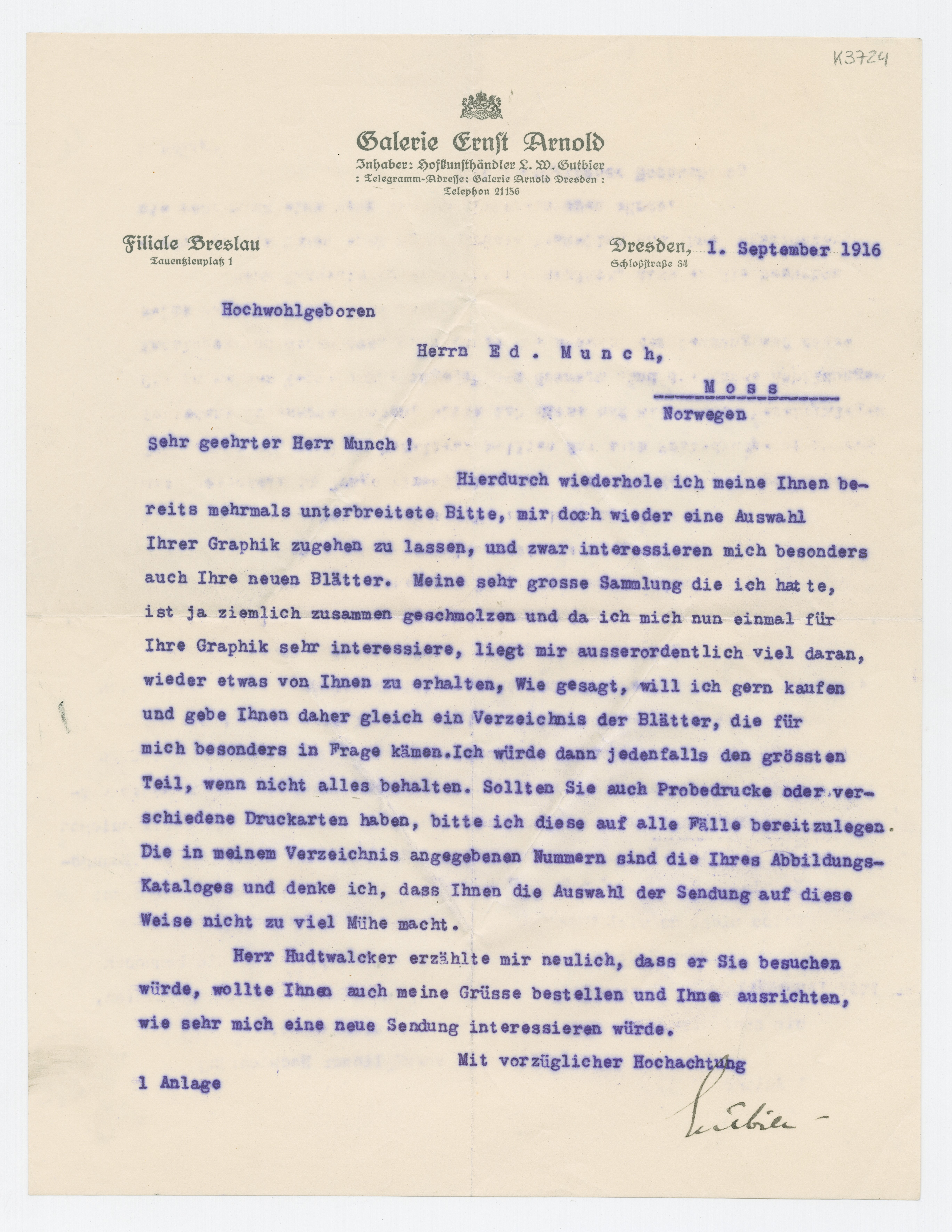 MM K 3724, Munchmuseet. Datert 01.09.1916. Brev fra Ludwig Wilhelm Gutbier, Galerie Ernst Arnold.