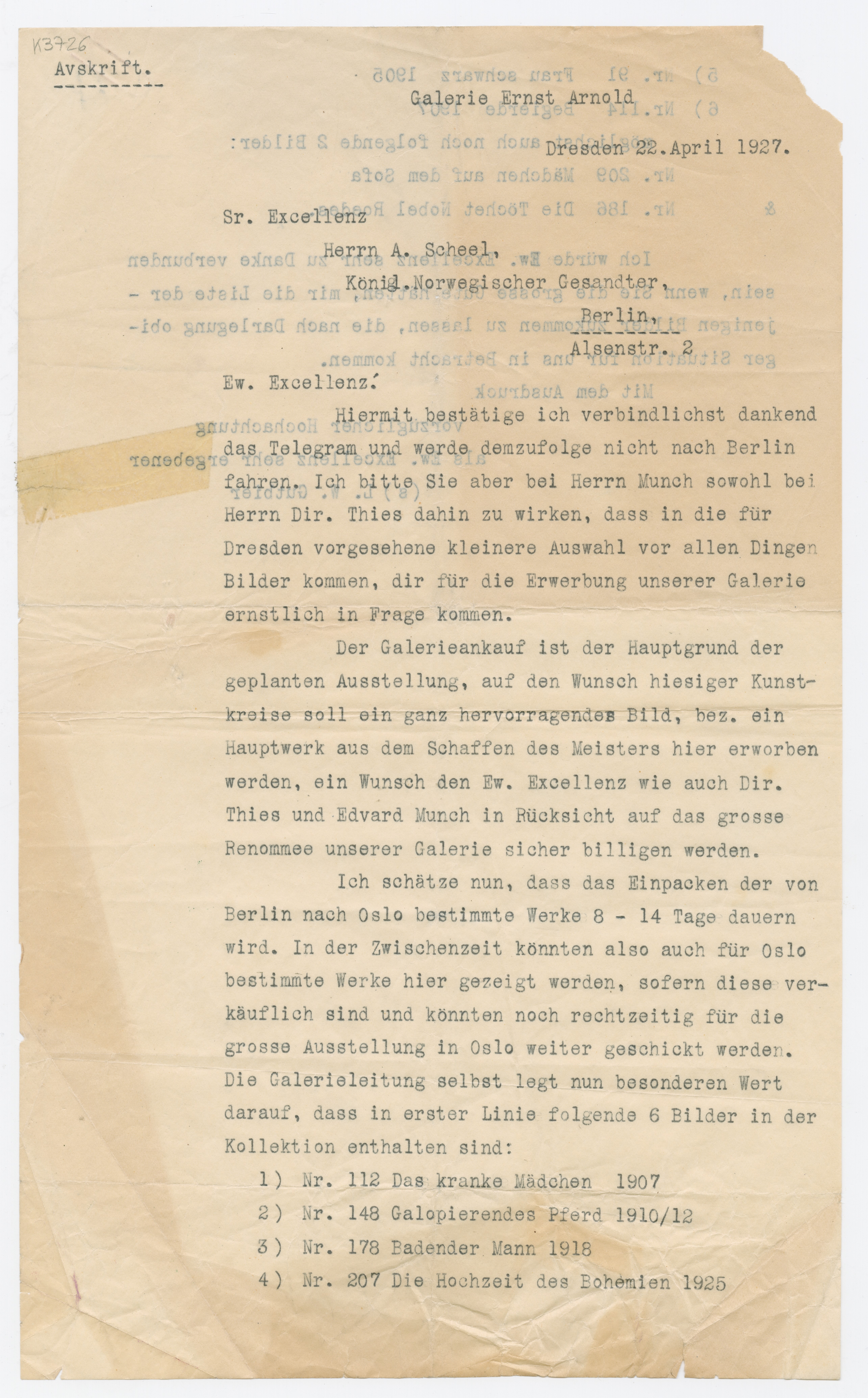 MM K 3726, Munchmuseet. Datert 22.04.1927. Brev fra Ludwig Wilhelm Gutbier, Galerie Ernst Arnold.