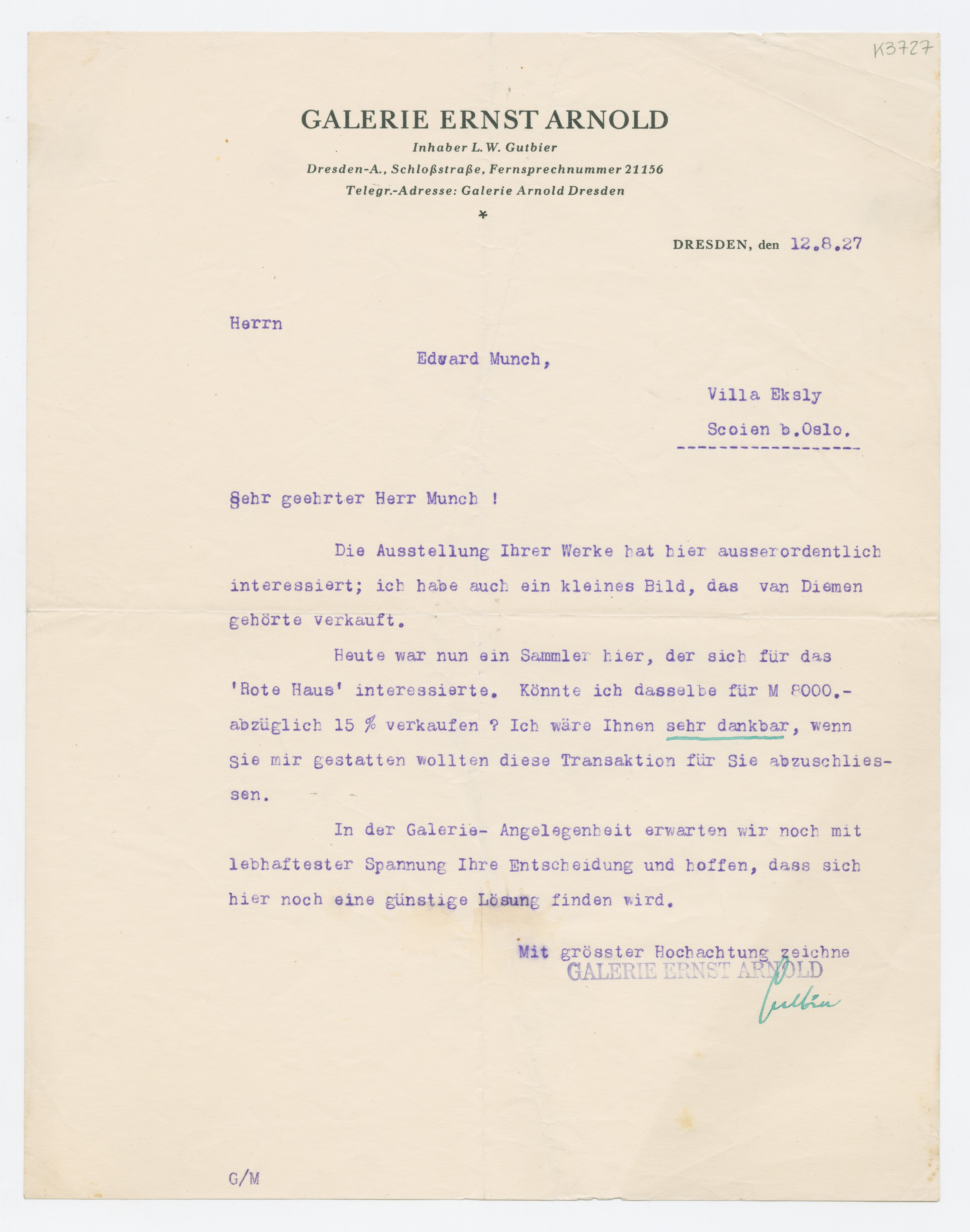 MM K 3727, Munchmuseet. Datert 12.08.1927. Brev fra Ludwig Wilhelm Gutbier, Galerie Ernst Arnold.