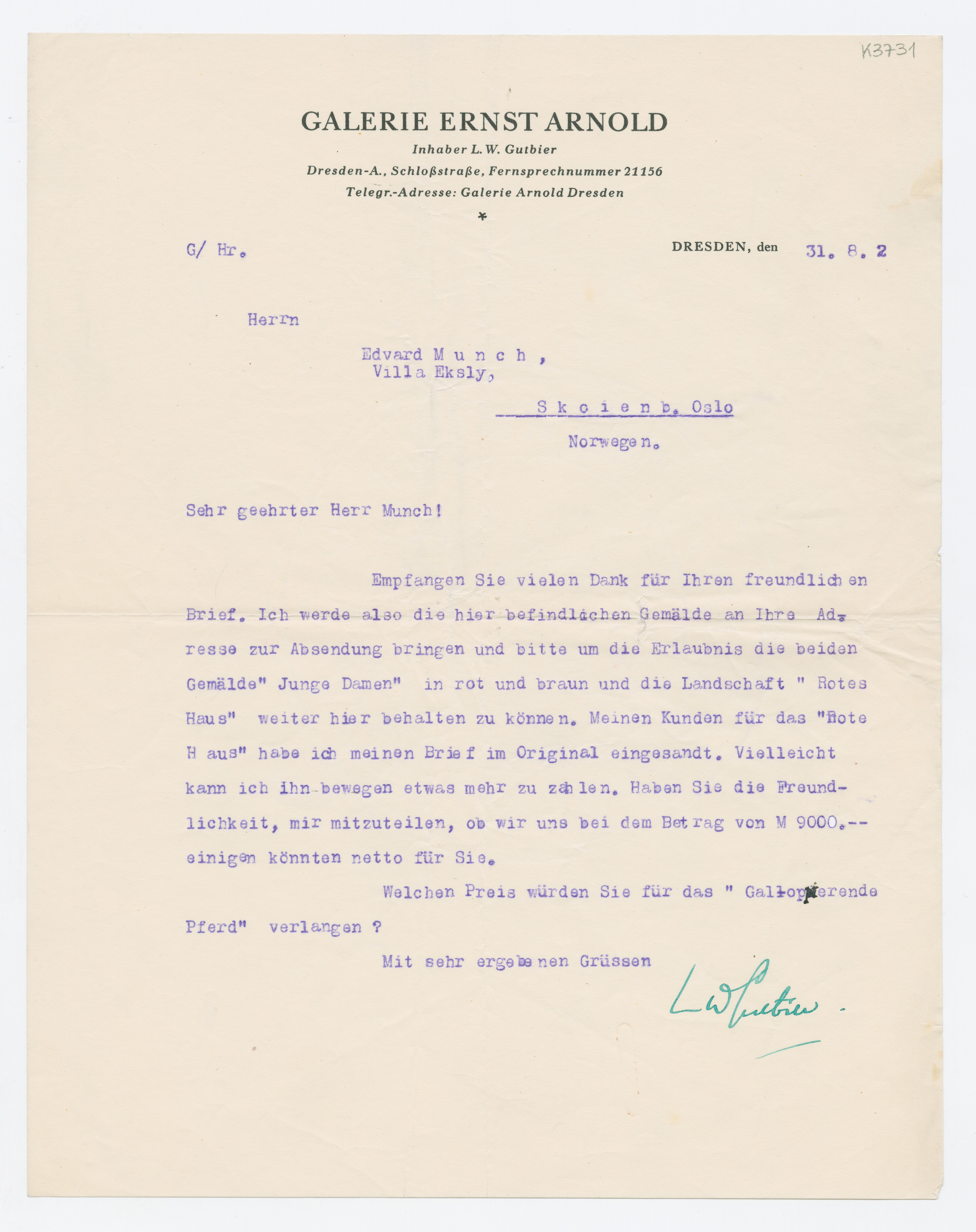 MM K 3731, Munchmuseet. Datert 31.08.192[?]. Brev fra Ludwig Wilhelm Gutbier, Galerie Ernst Arnold.