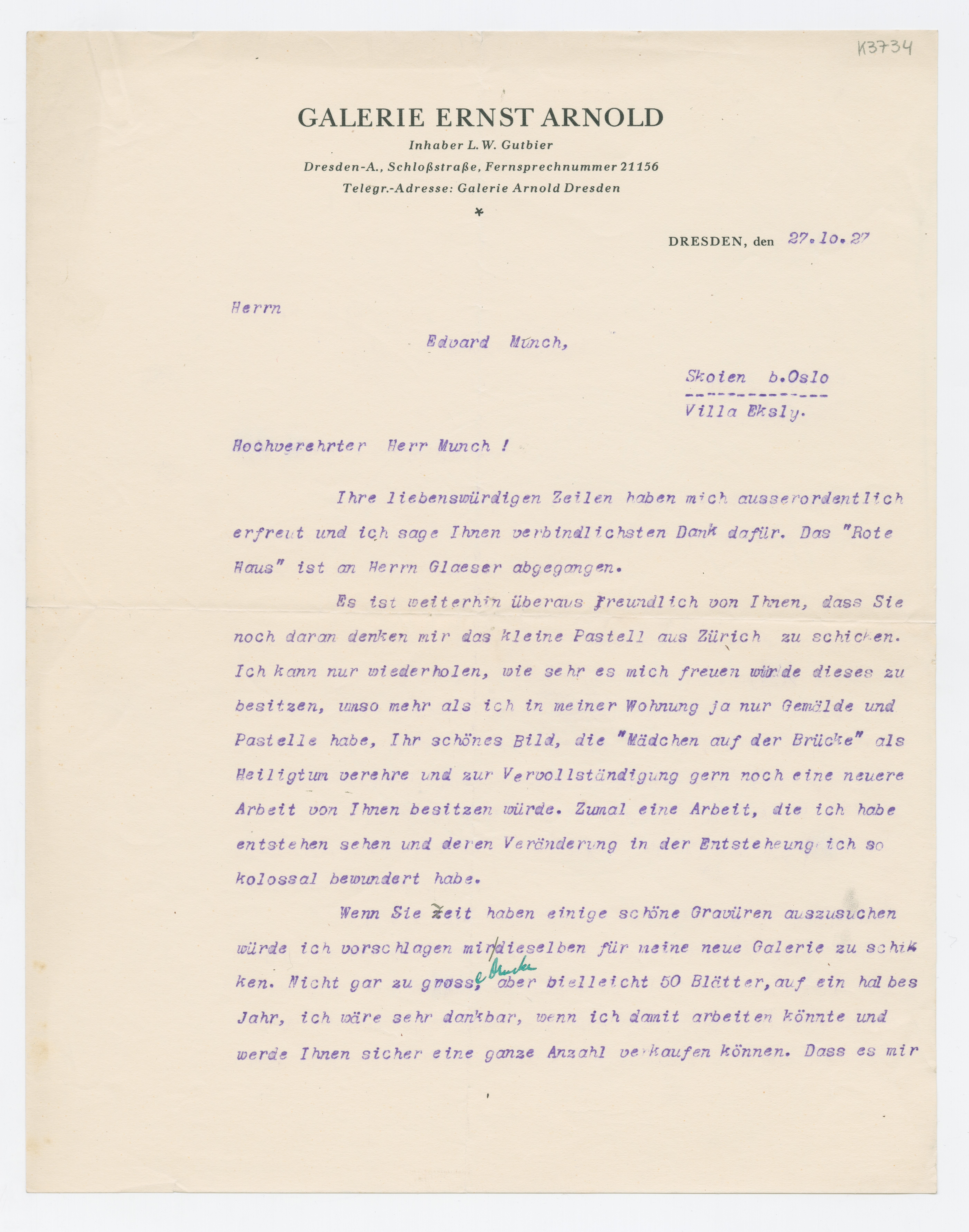 MM K 3734, Munchmuseet. Datert 27.10.1927. Brev fra Ludwig Wilhelm Gutbier, Galerie Ernst Arnold.