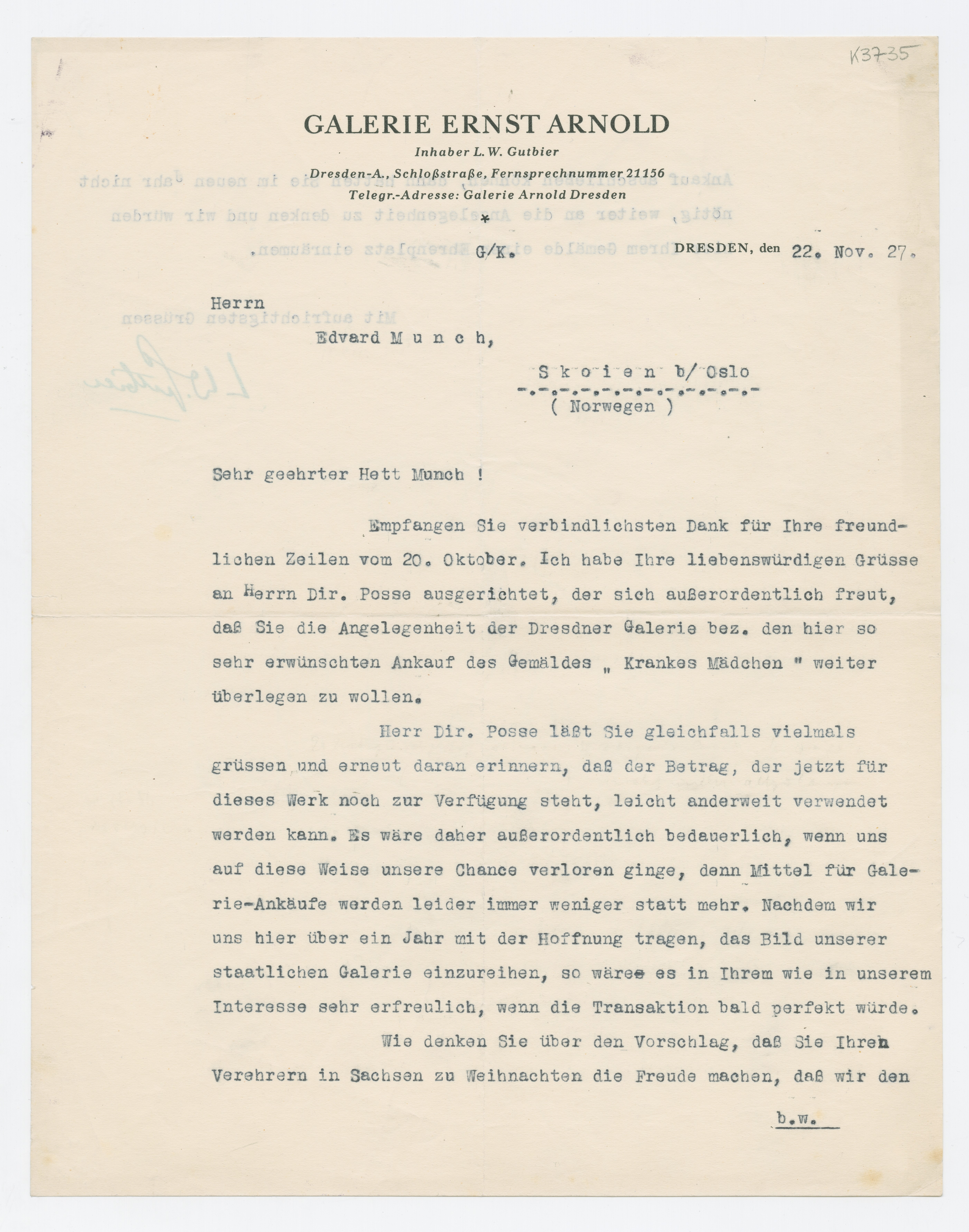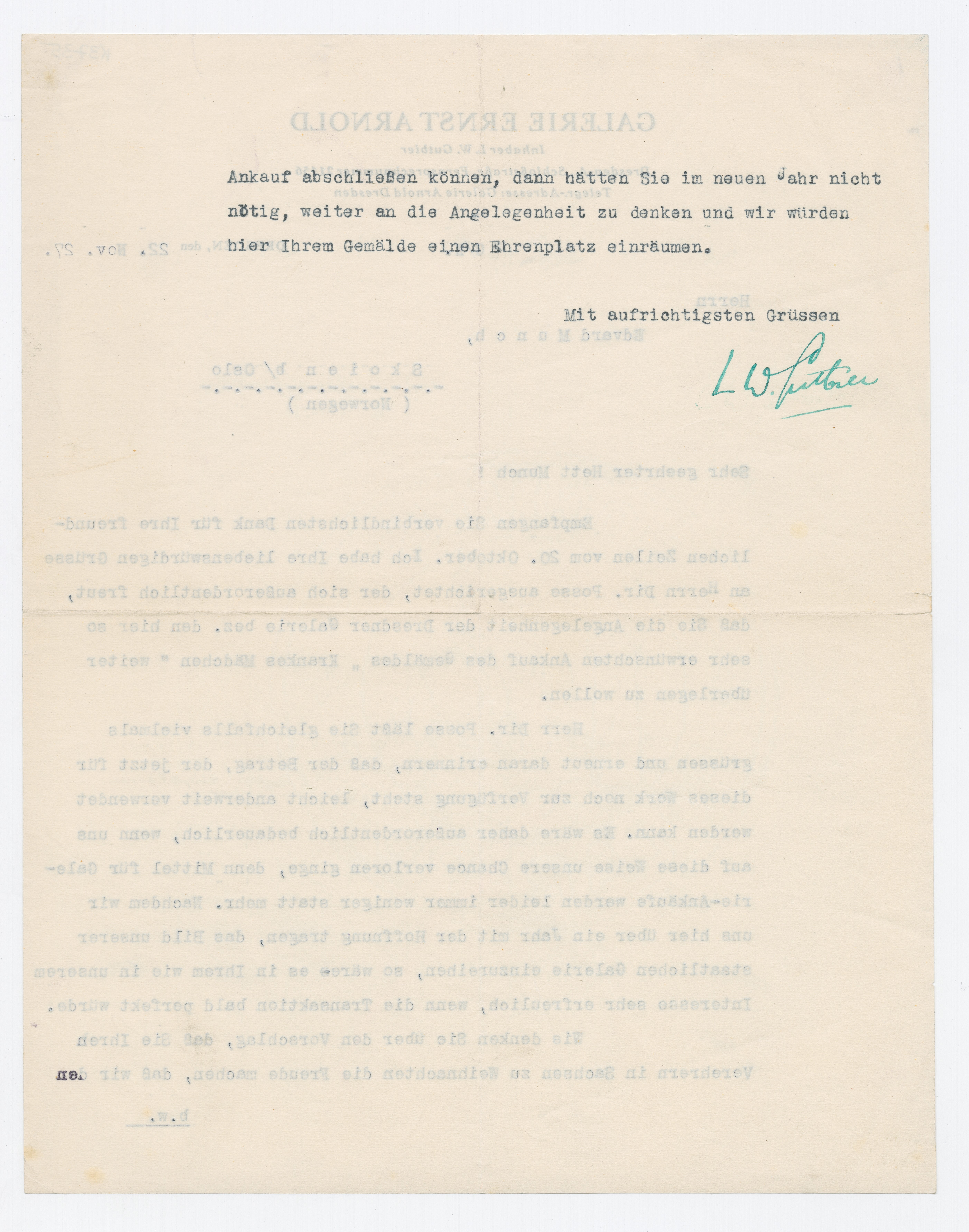 MM K 3735, Munchmuseet. Datert 22.11.1927. Brev fra Ludwig Wilhelm Gutbier, Galerie Ernst Arnold.