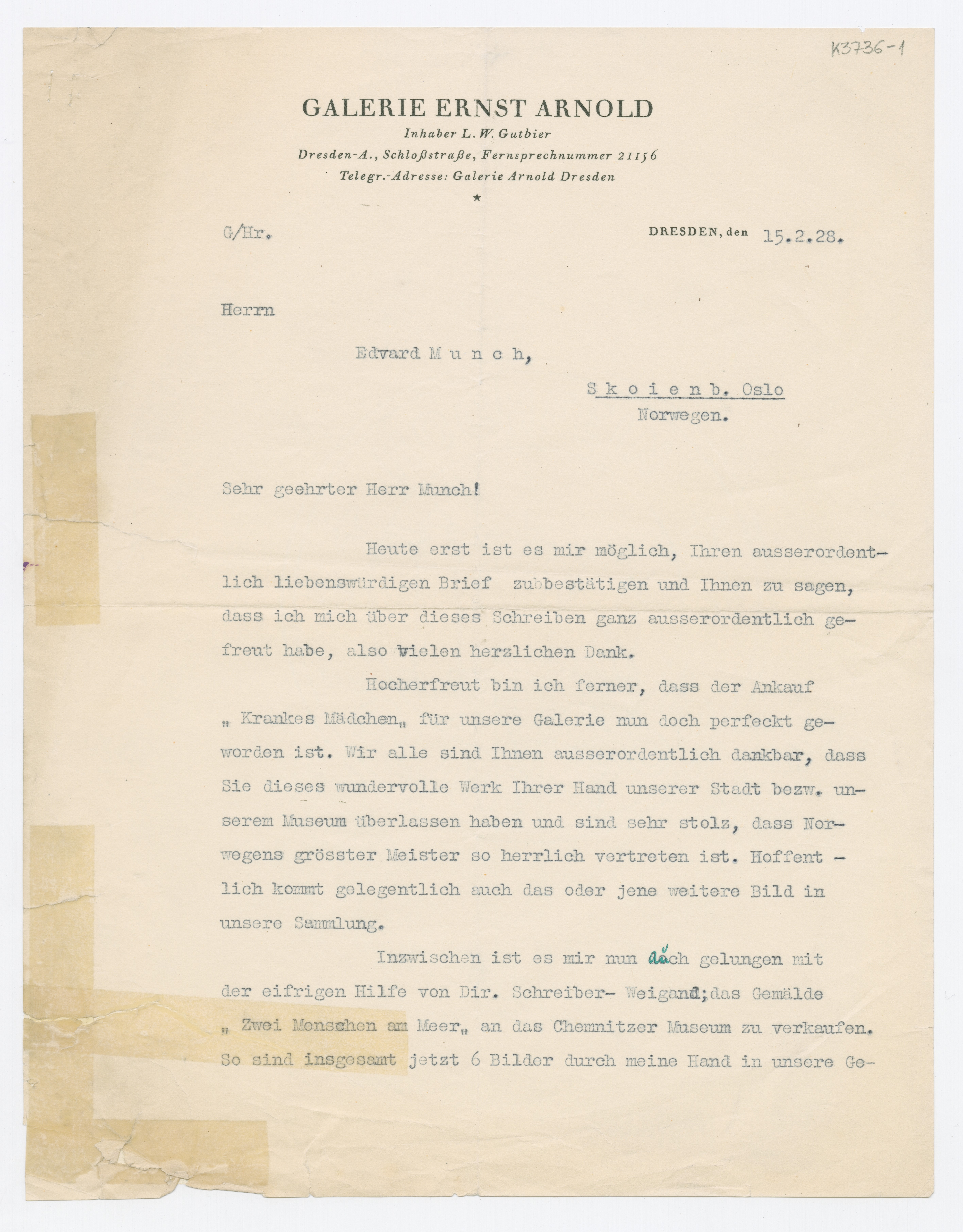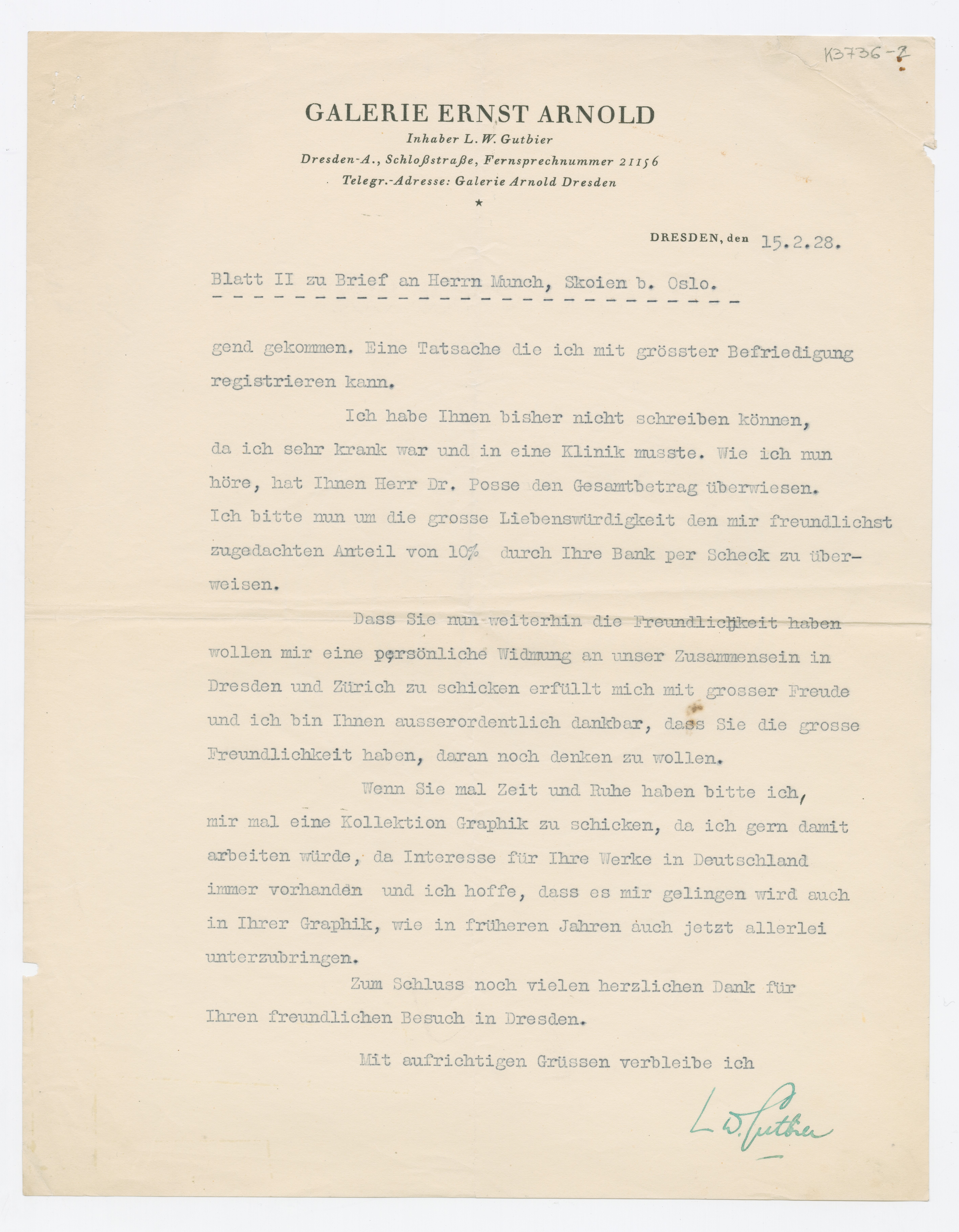 MM K 3736, Munchmuseet. Datert 15.02.1928. Brev fra Ludwig Wilhelm Gutbier, Galerie Ernst Arnold.
