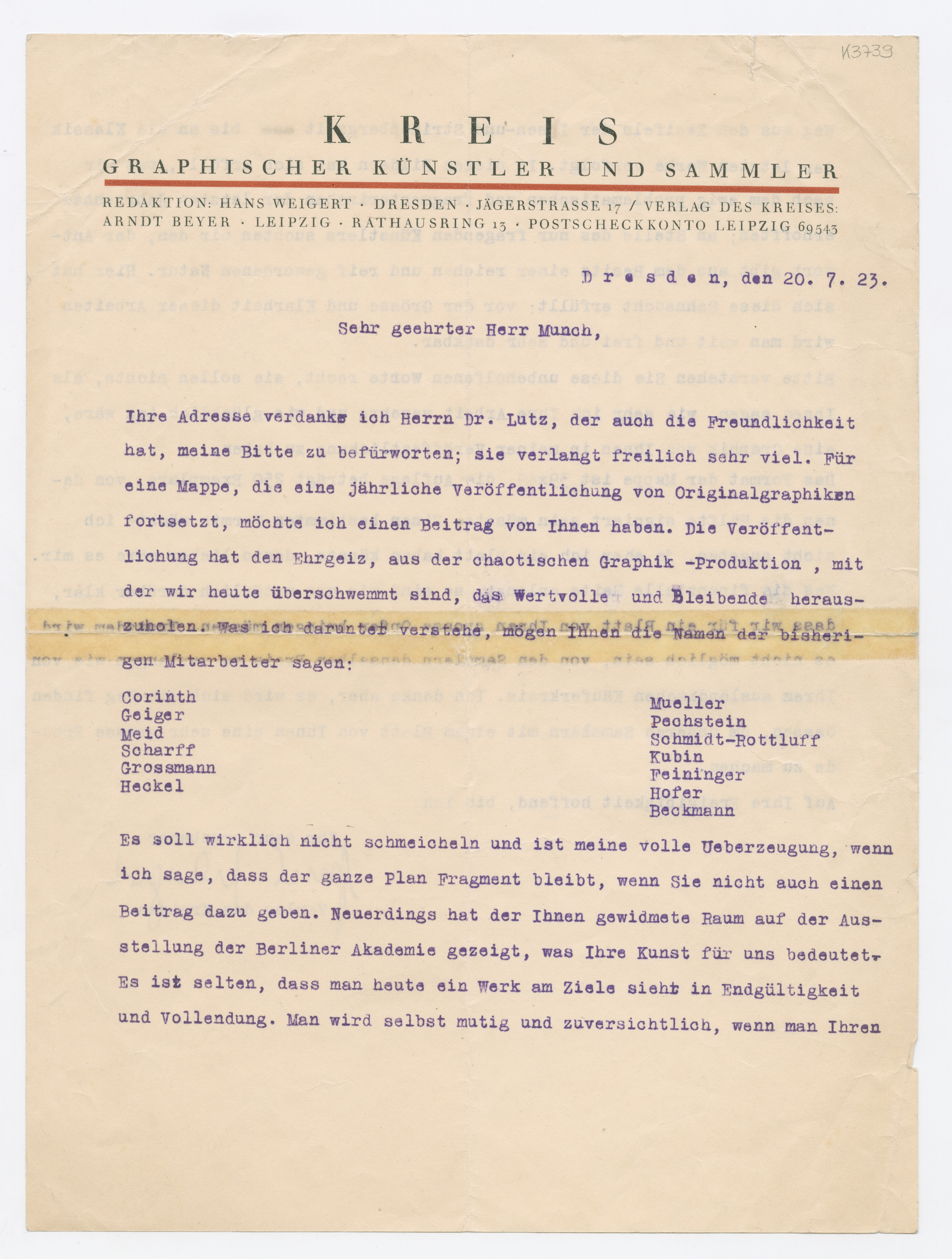 MM K 3739, Munchmuseet. Datert 20.07.1923. Brev fra Verlag des Kreises, Kreis Graphischer Künstler und Sammler.