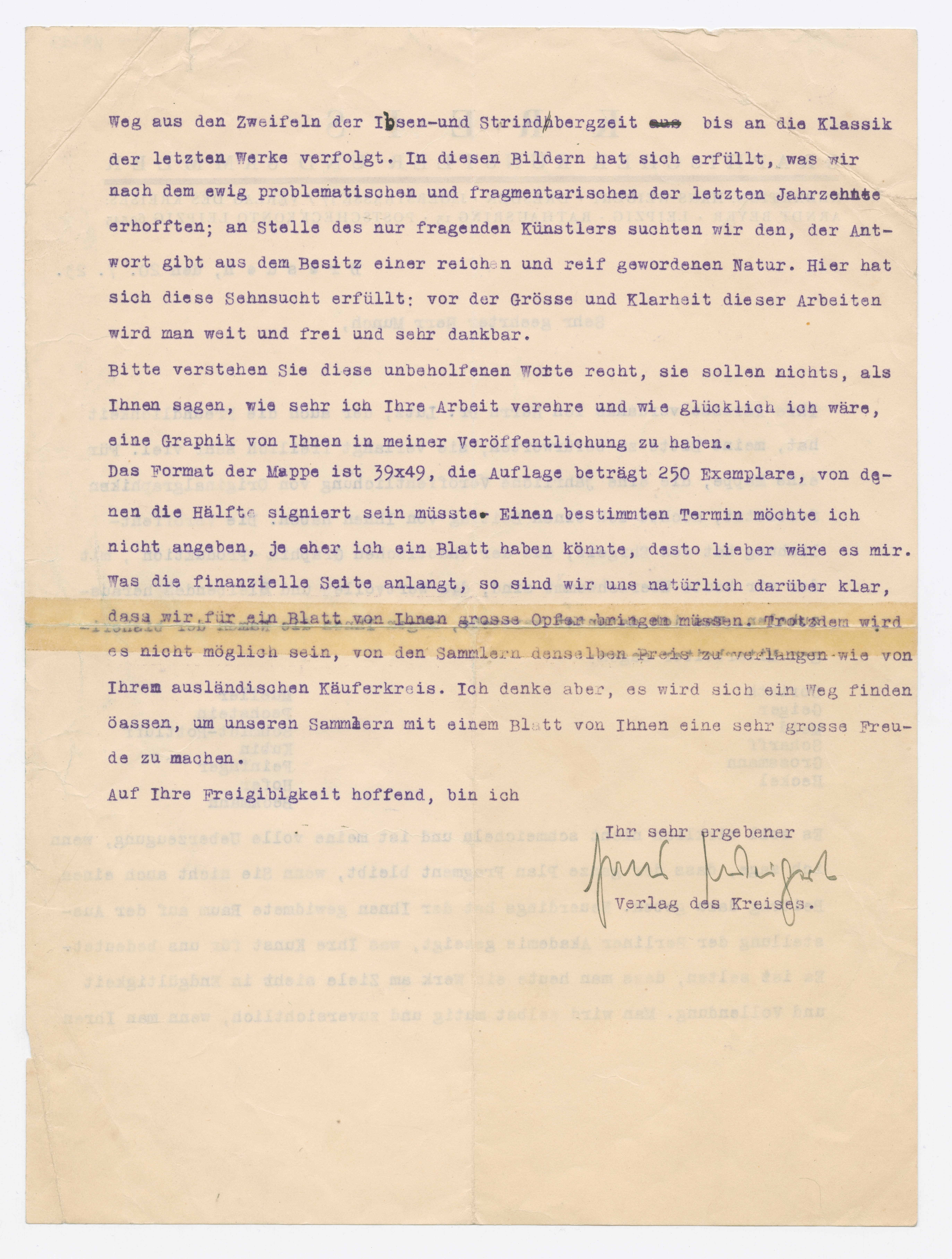 Brev fra Verlag des Kreises, Kreis Graphischer Künstler und Sammler.