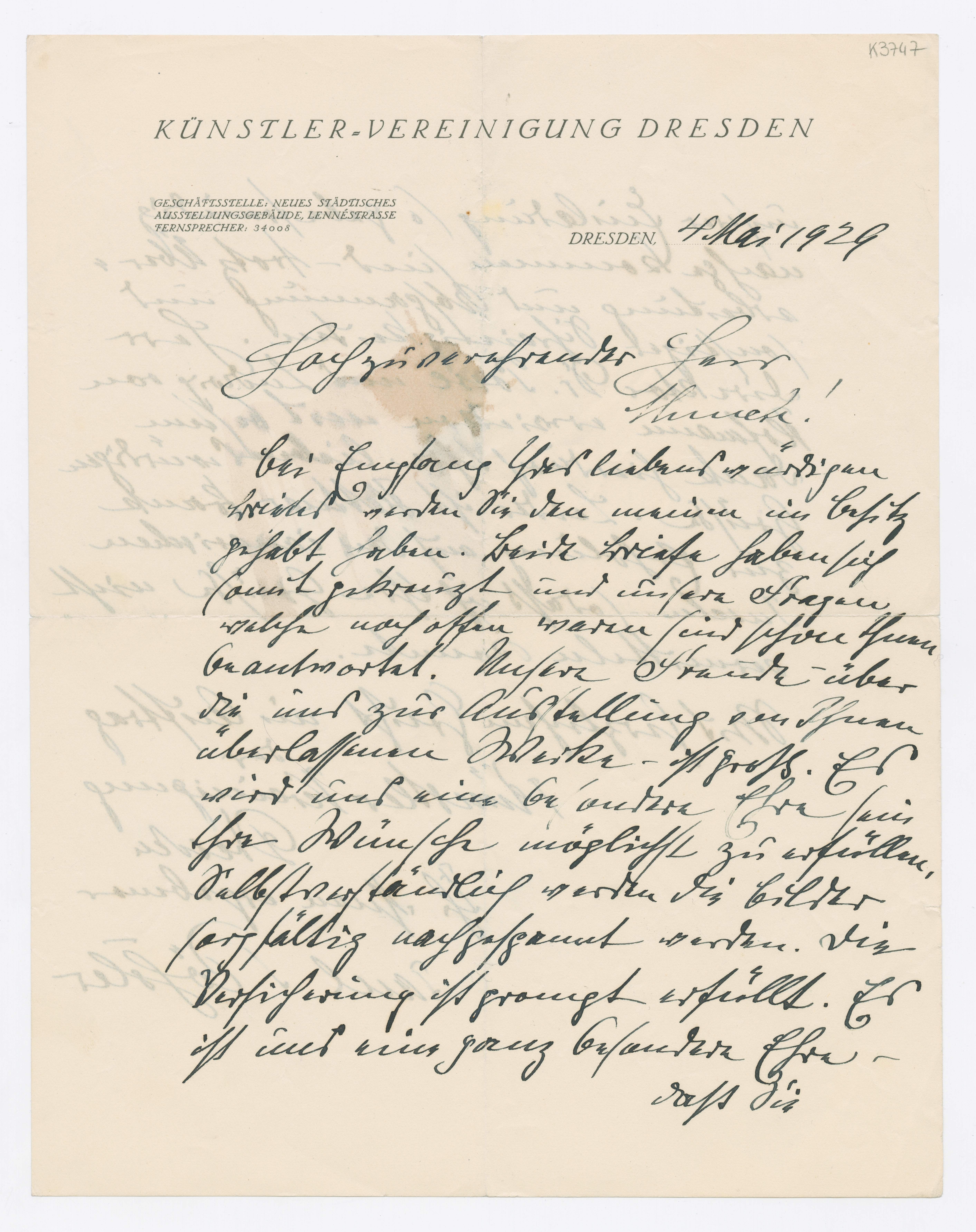MM K 3747, Munchmuseet. Datert 04.05.1929. Brev fra Künstler-Vereinigung Dresden, Paul Rössler.