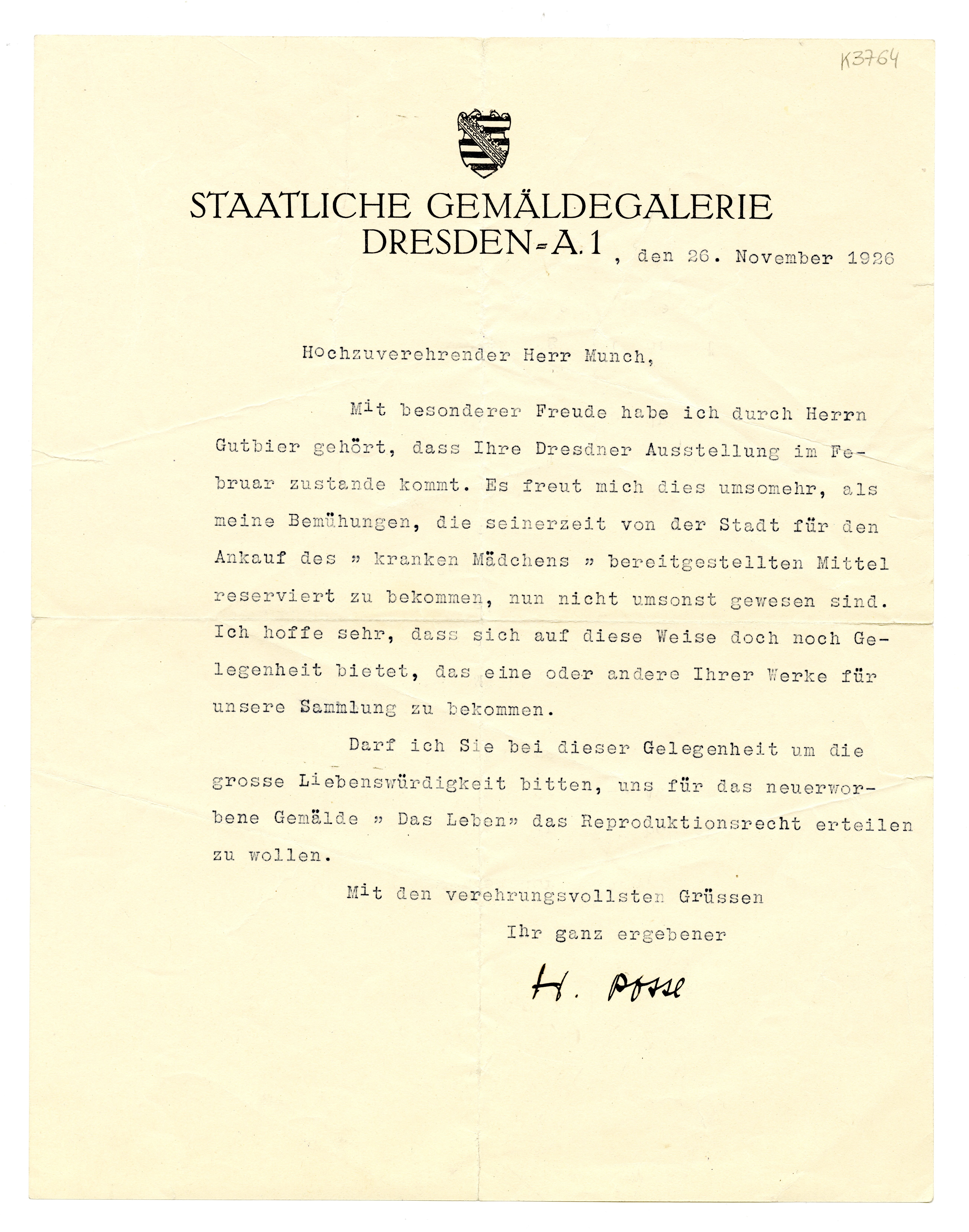 MM K 3764, Munchmuseet. Datert 26.11.1926. Brev fra Hans Posse, Staatliche Gemäldegalerie og Internationale Kunstausstellung 1926.