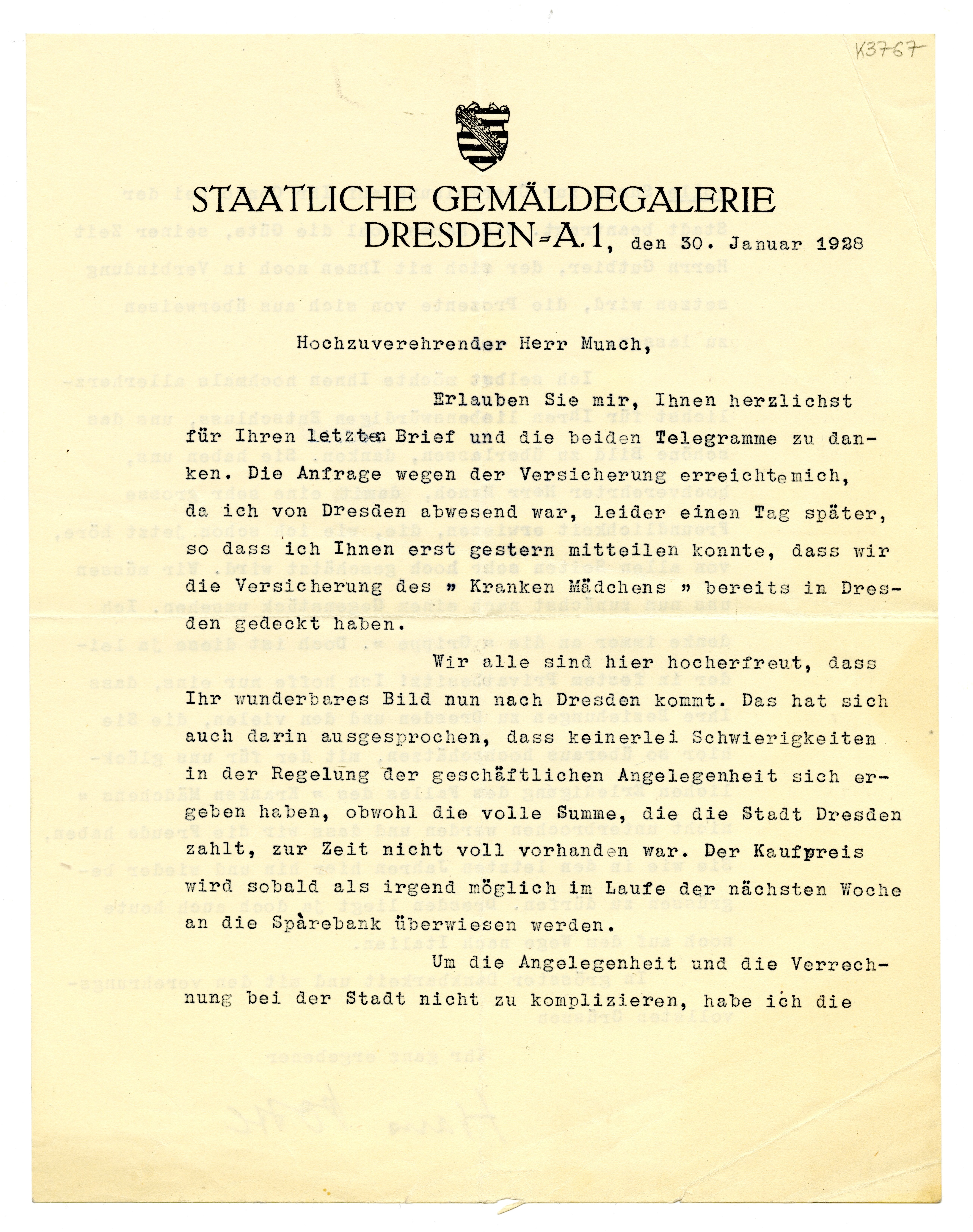 MM K 3767, Munchmuseet. Datert 30.01.1928. Brev fra Hans Posse, Staatliche Gemäldegalerie og Internationale Kunstausstellung 1926.