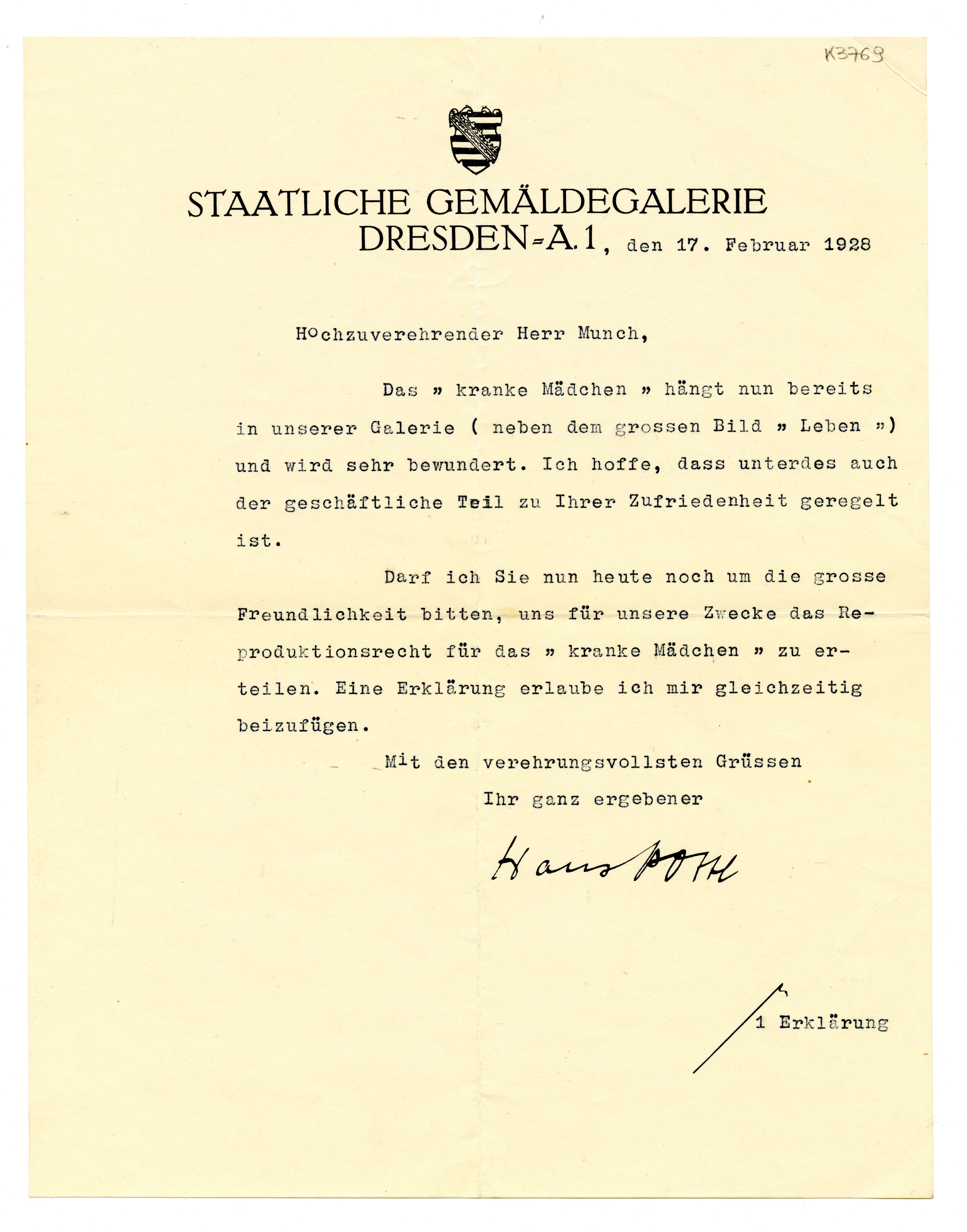 MM K 3769, Munchmuseet. Datert 17.02.1928. Brev fra Hans Posse, Staatliche Gemäldegalerie og Internationale Kunstausstellung 1926.