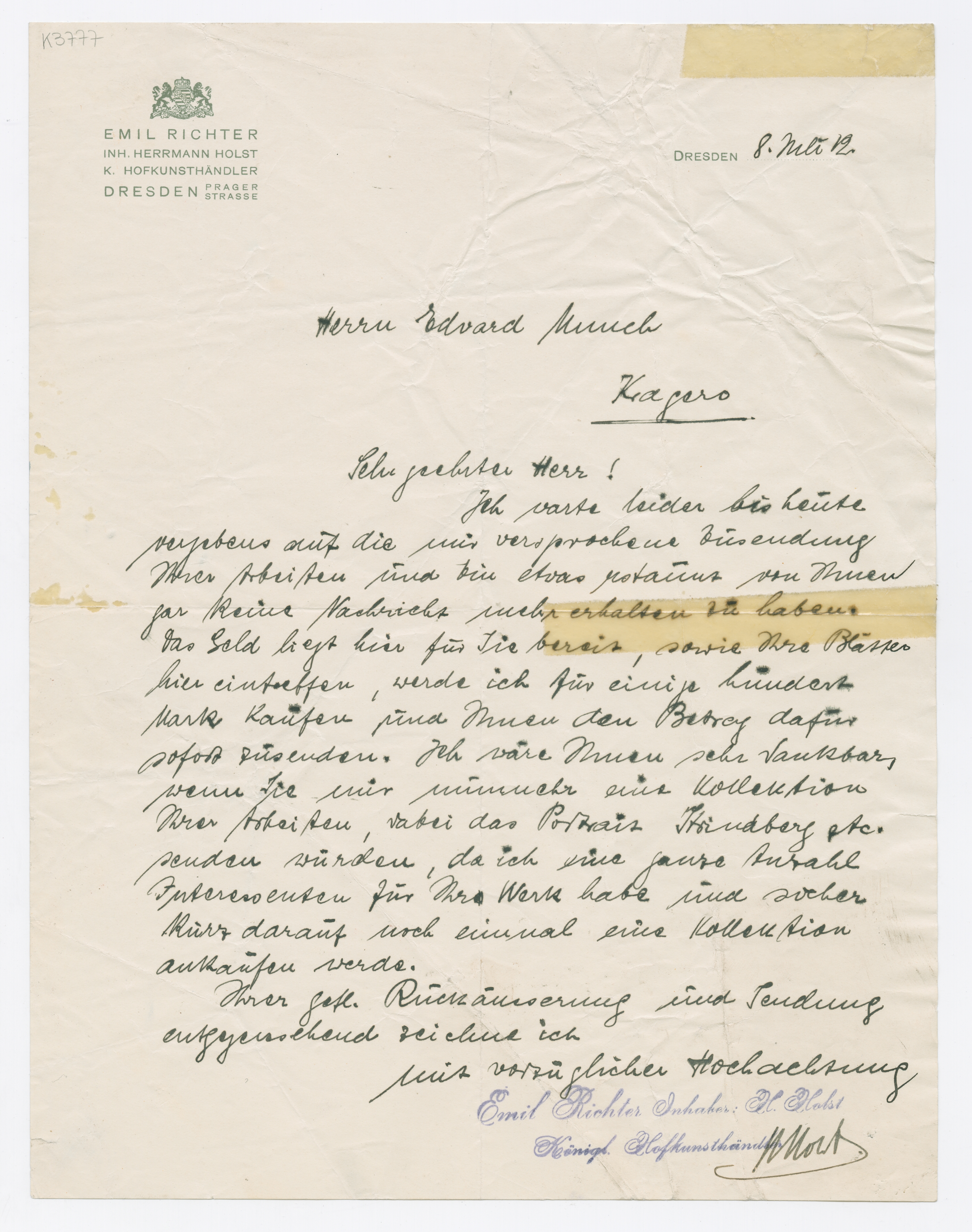 MM K 3777, Munchmuseet. Datert 08.07.1912. Brev fra Hofkunsthändler Emil Richter Herrmann Holst.