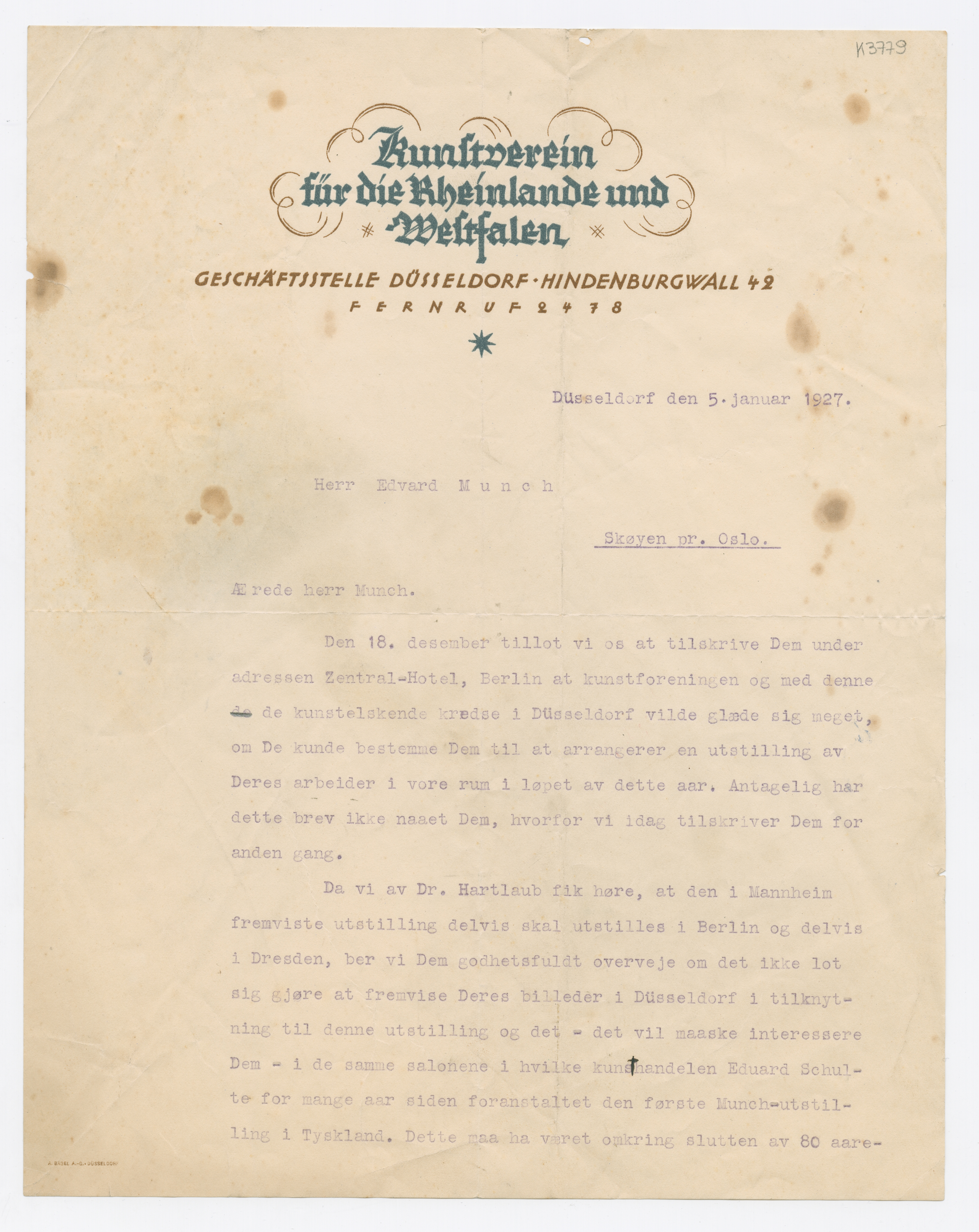 MM K 3779, Munchmuseet. Datert 05.01.1927. Brev fra Kunstverein für die Rheinlande und Weltfalen.