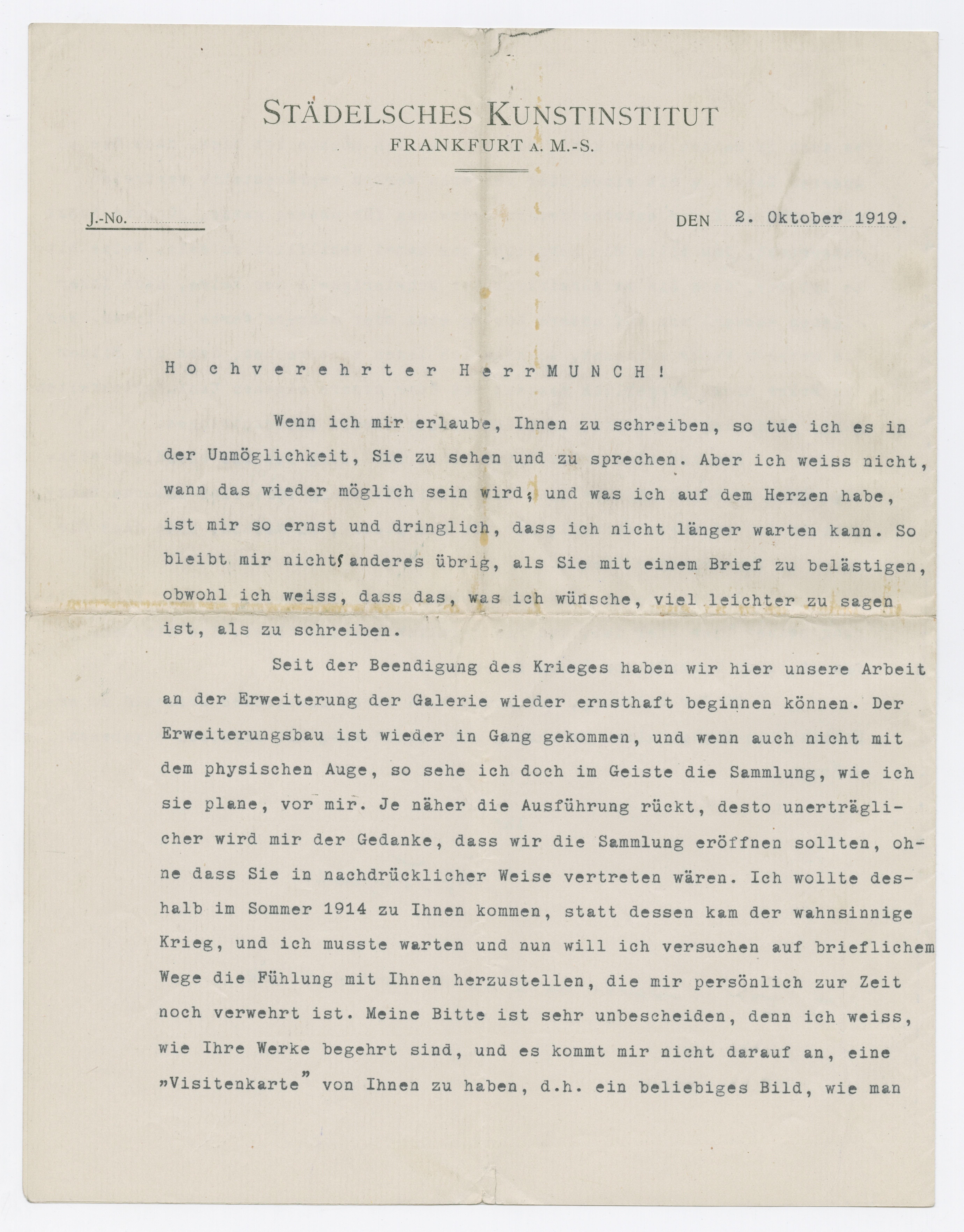 MM K 3796, Munchmuseet. Datert 02.10.1919. Brev fra Georg Swarzenski, Städelsches Kunstinstitut og Städtische Galerie.