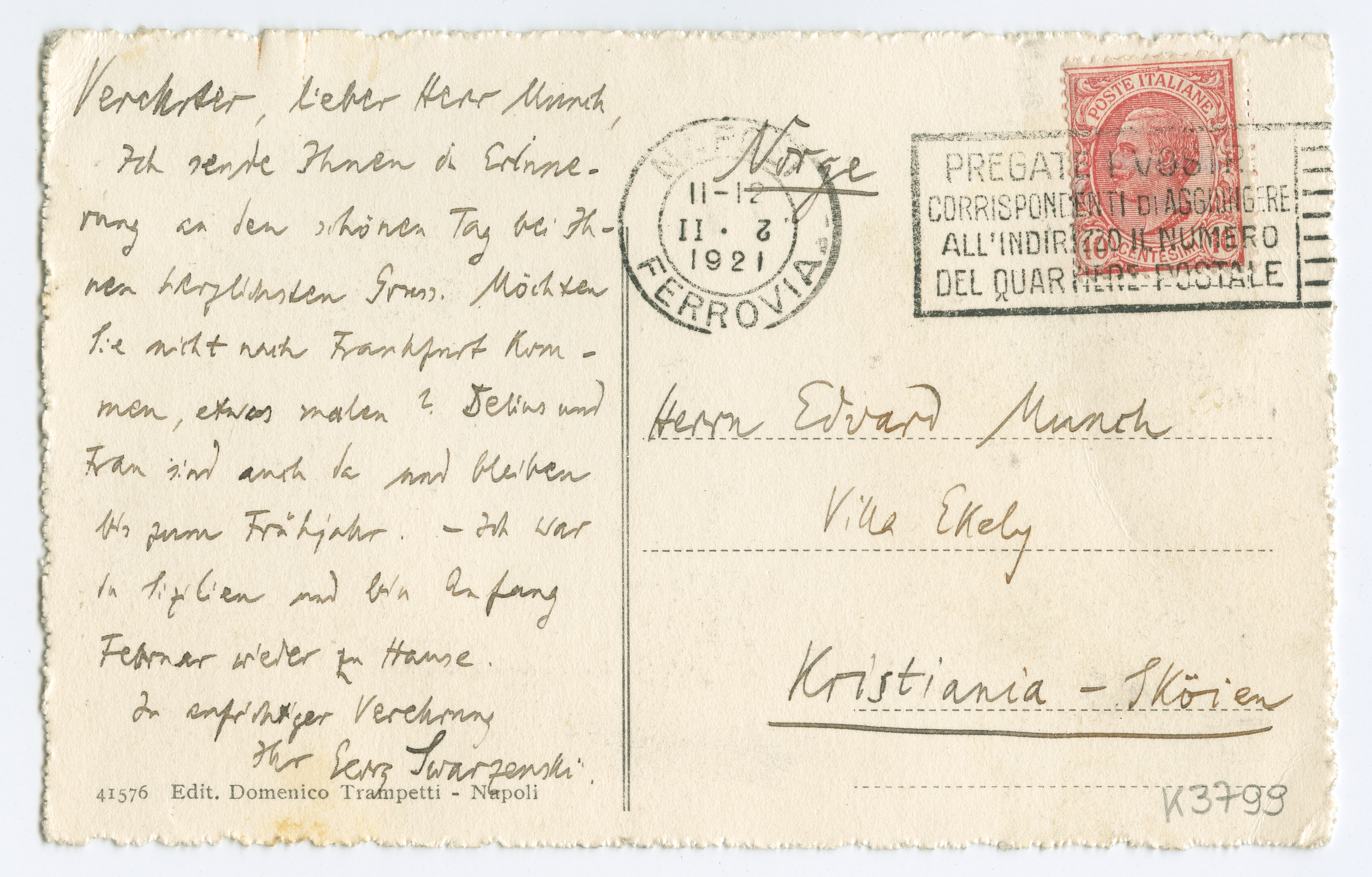 MM K 3799, Munchmuseet. Datert 11.12.1921. Brev fra Georg Swarzenski, Städelsches Kunstinstitut og Städtische Galerie.