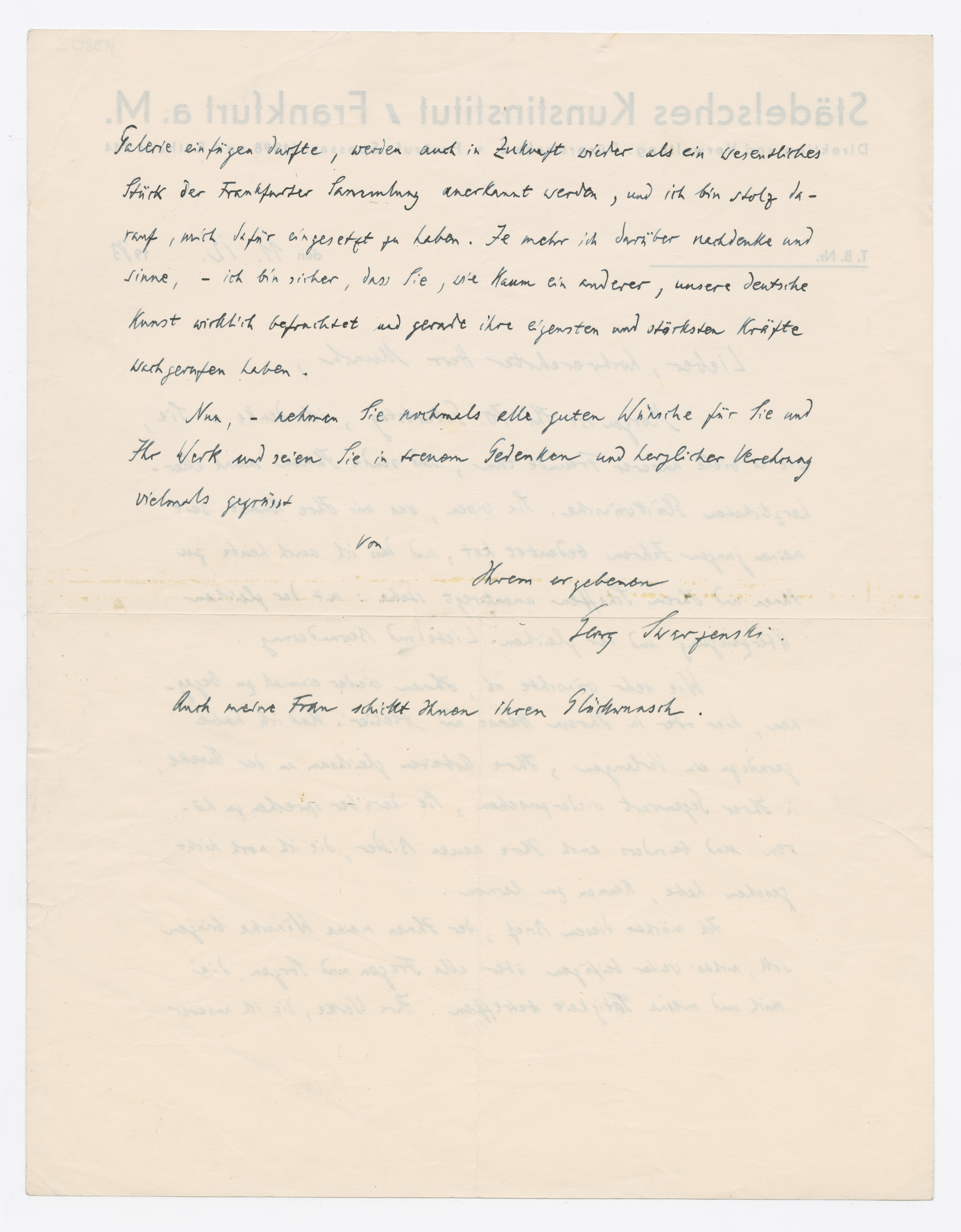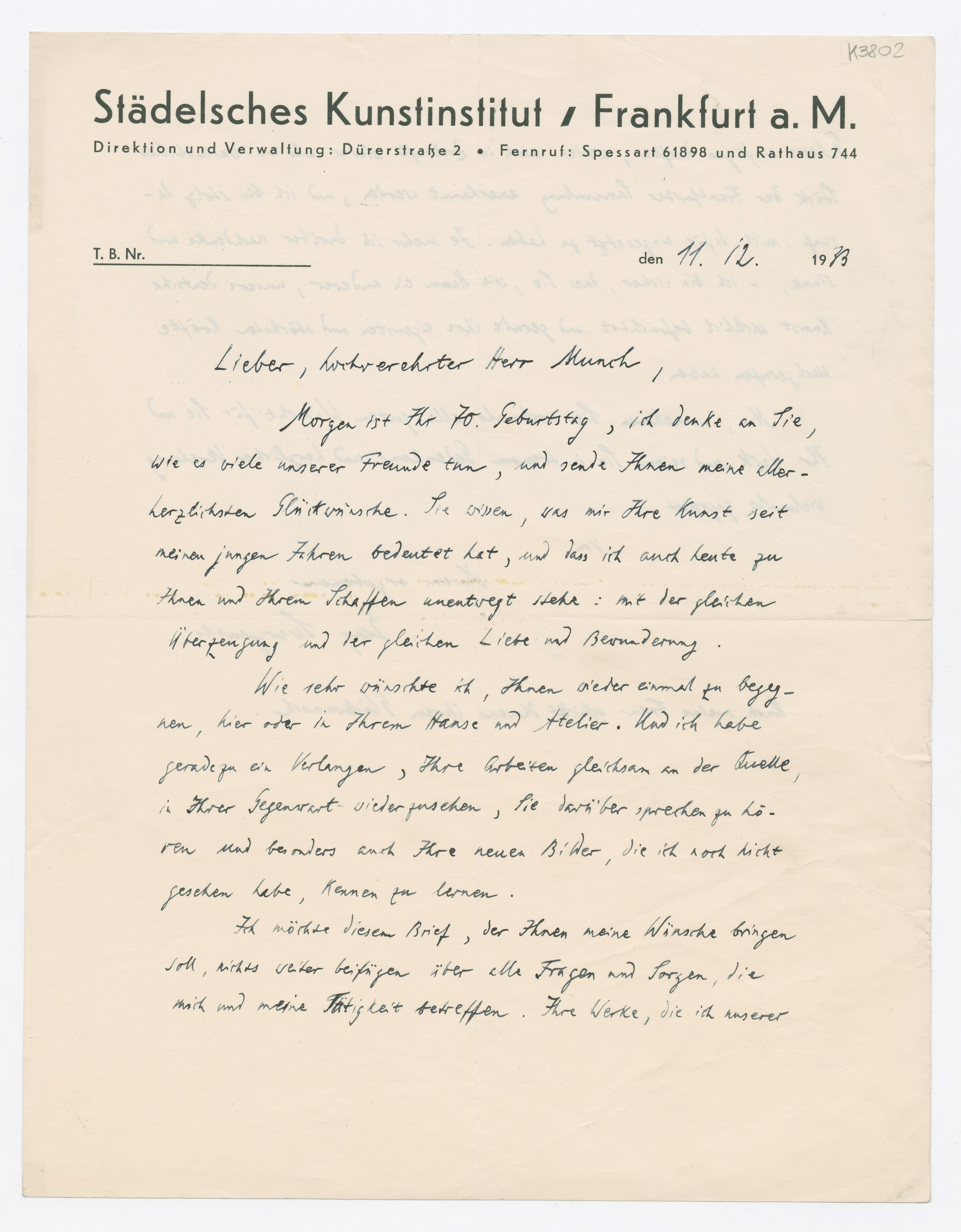 MM K 3802, Munchmuseet. Datert 11.12.1933. Brev fra Georg Swarzenski, Städelsches Kunstinstitut og Städtische Galerie.
