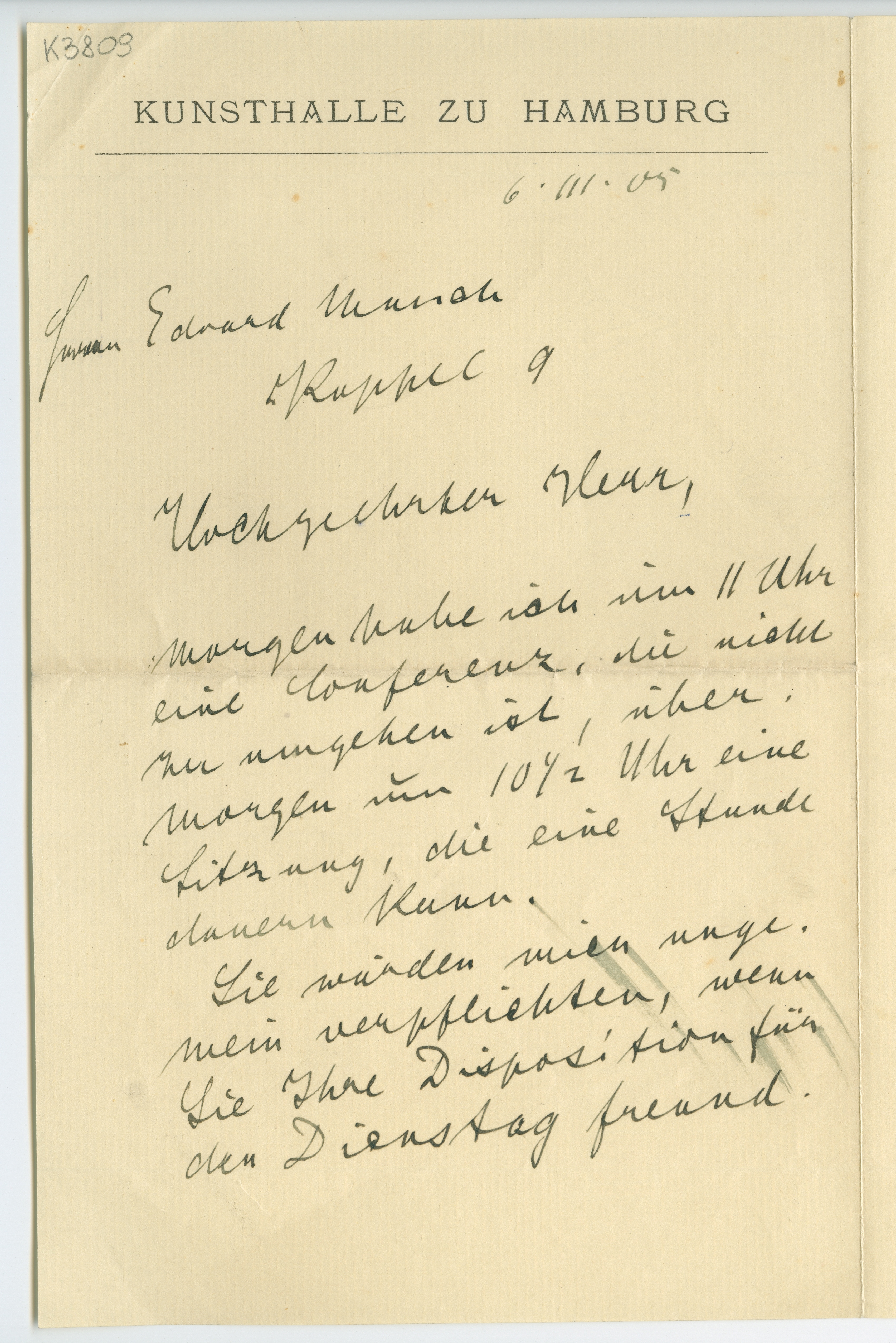 MM K 3809, Munchmuseet. Datert 06.03.1905. Brev fra Alfred Lichtwark, Kunsthalle zu Hamburg.