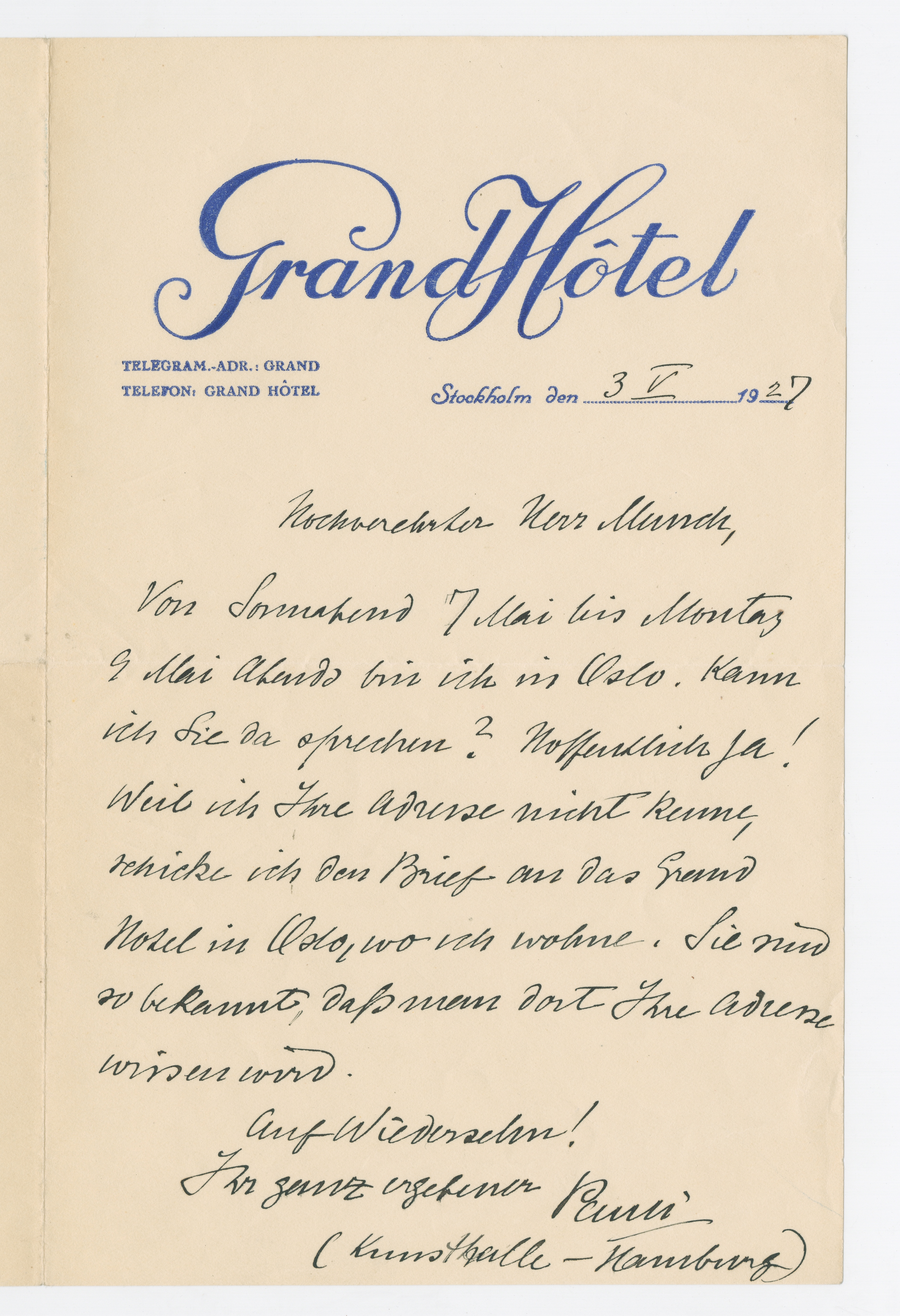 MM K 3810, Munchmuseet. Datert 03.05.1927. Brev fra Gustav Pauli, Kunsthalle zu Hamburg.