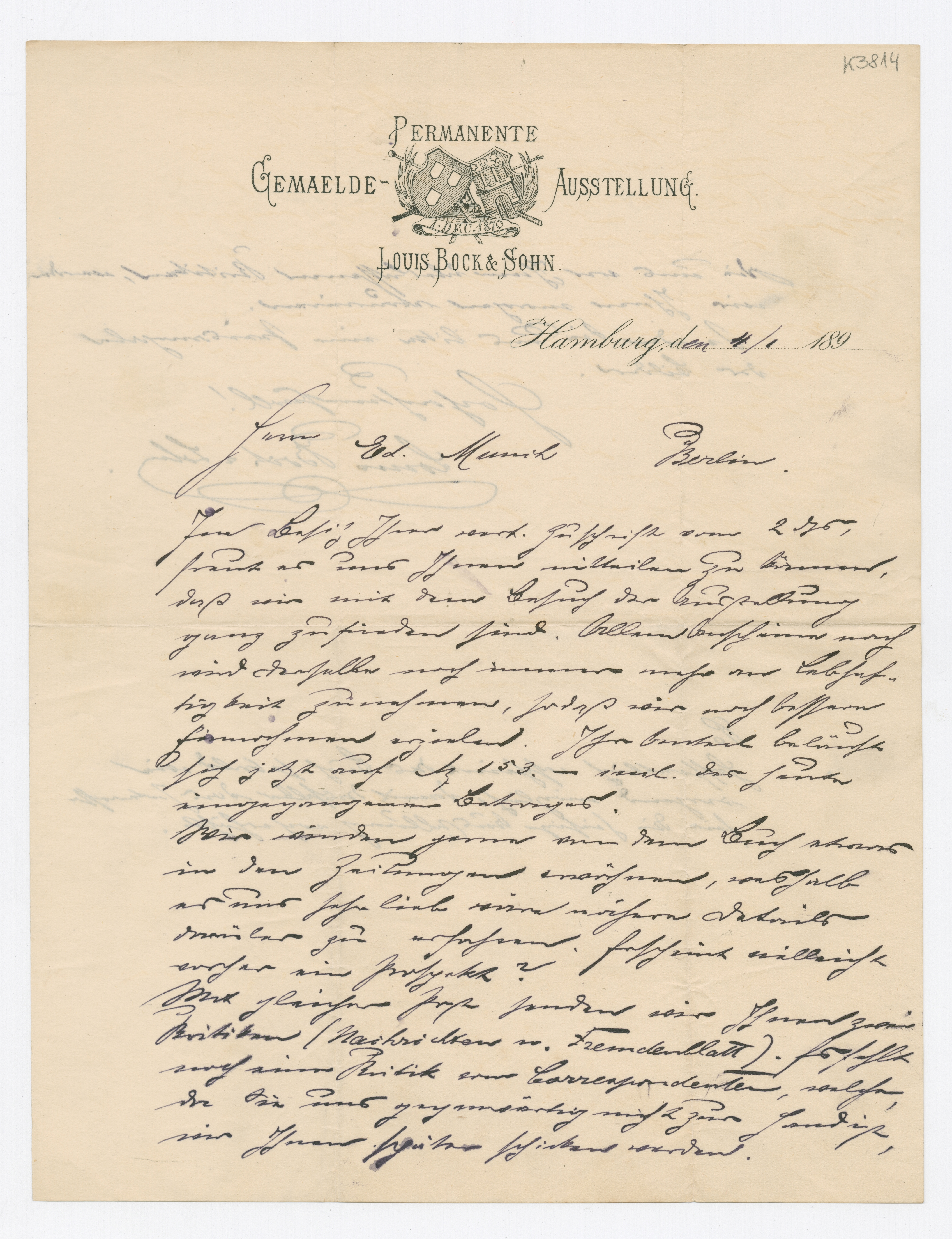 MM K 3814, Munchmuseet. Datert 04.01.189[?]. Brev fra Kunstsalon Louis Bock & Sohn.