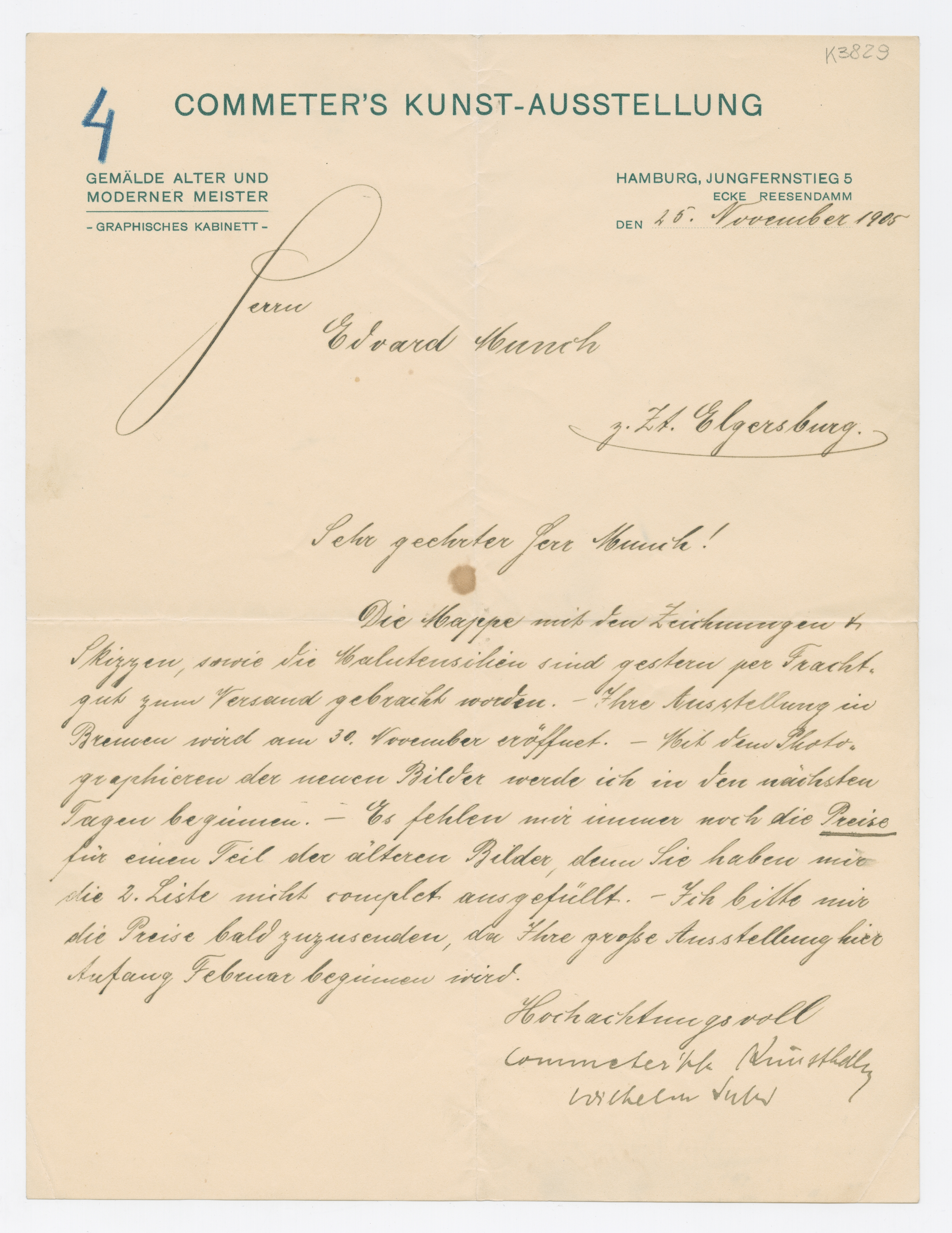 MM K 3829, Munchmuseet. Datert 25.11.1905. Brev fra Wilhelm Suhr, Commeter'sche Kunsthandlung.