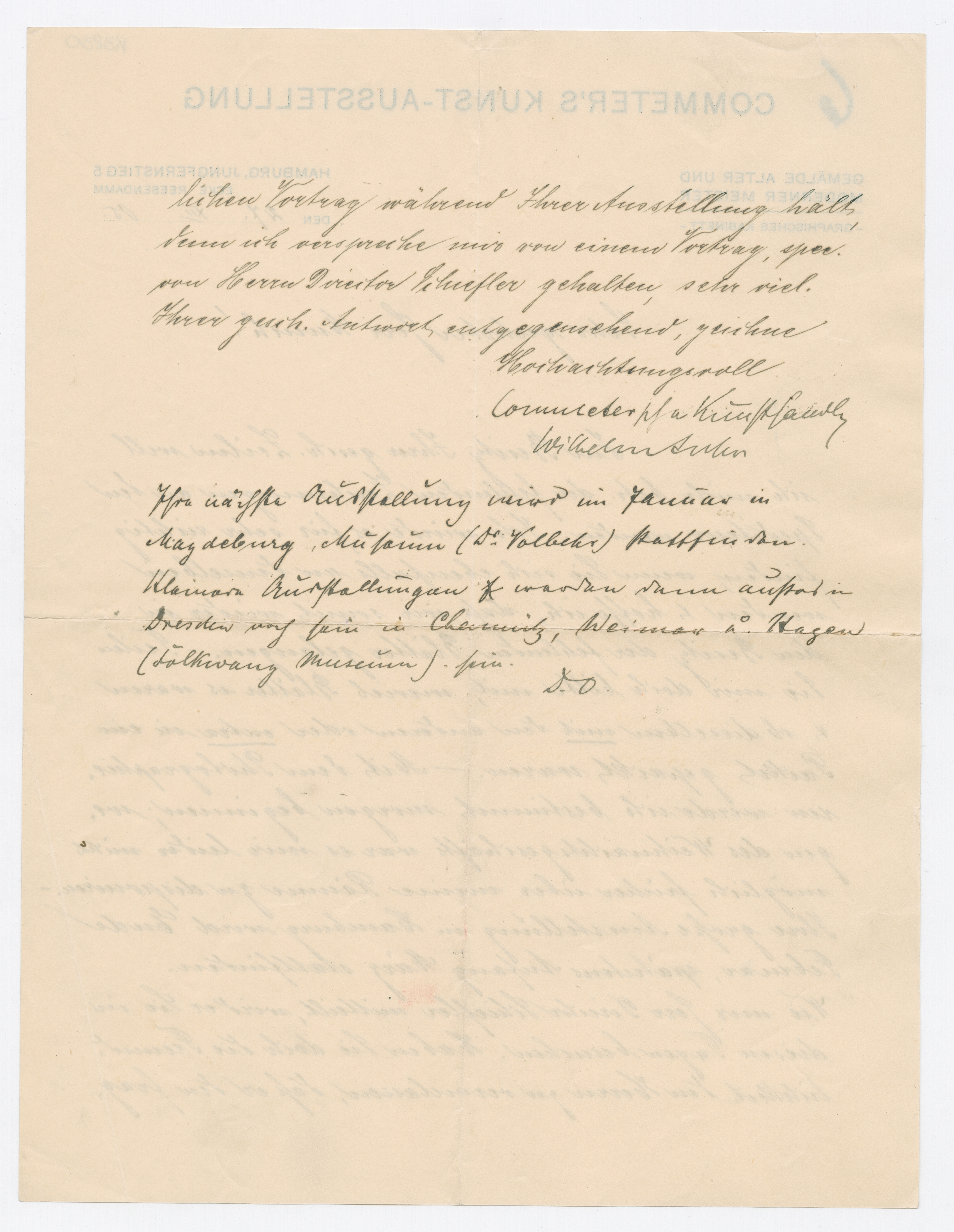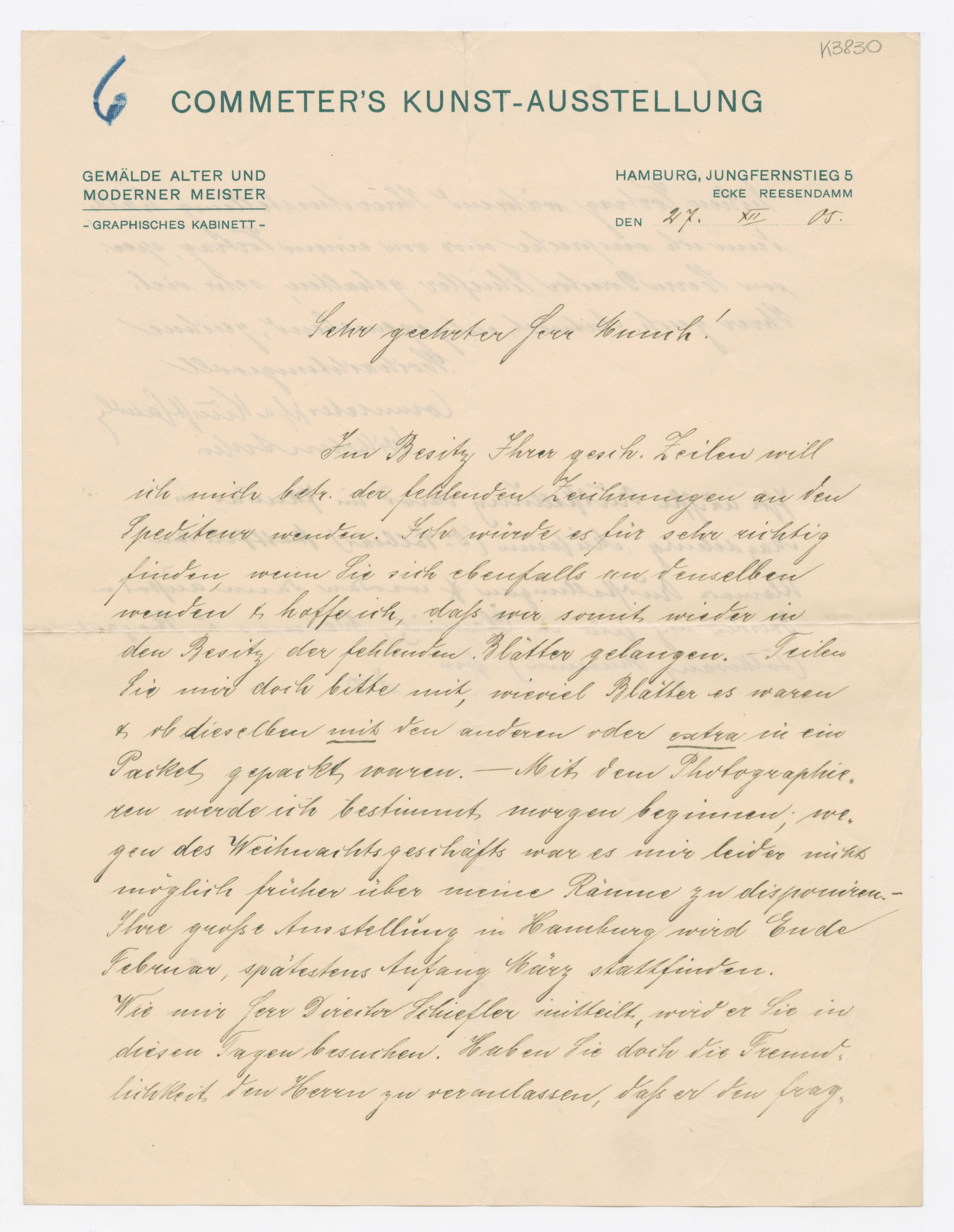 MM K 3830, Munchmuseet. Datert 27.12.1905. Brev fra Wilhelm Suhr, Commeter'sche Kunsthandlung.