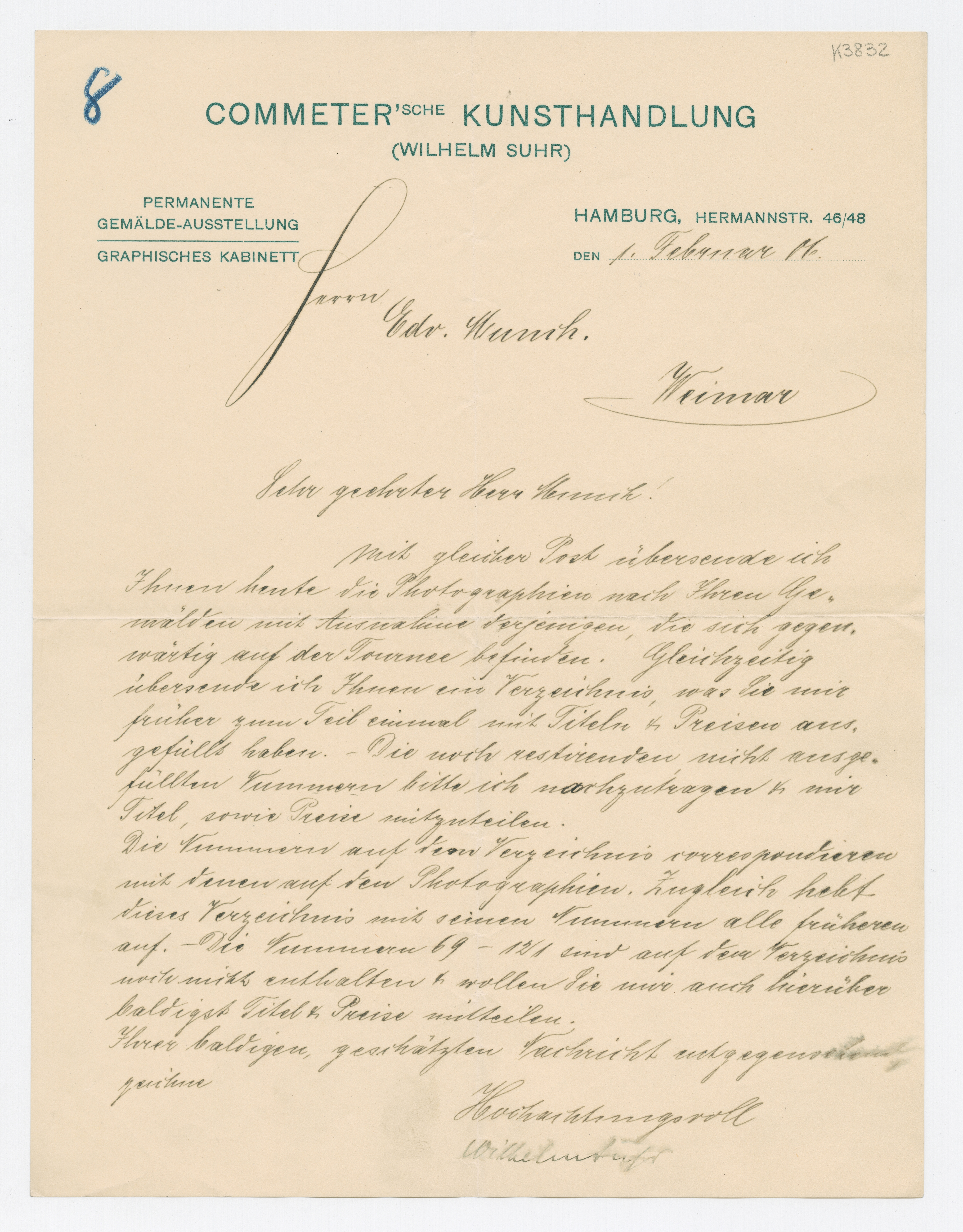 MM K 3832, Munchmuseet. Datert 01.02.1906. Brev fra Wilhelm Suhr, Commeter'sche Kunsthandlung.