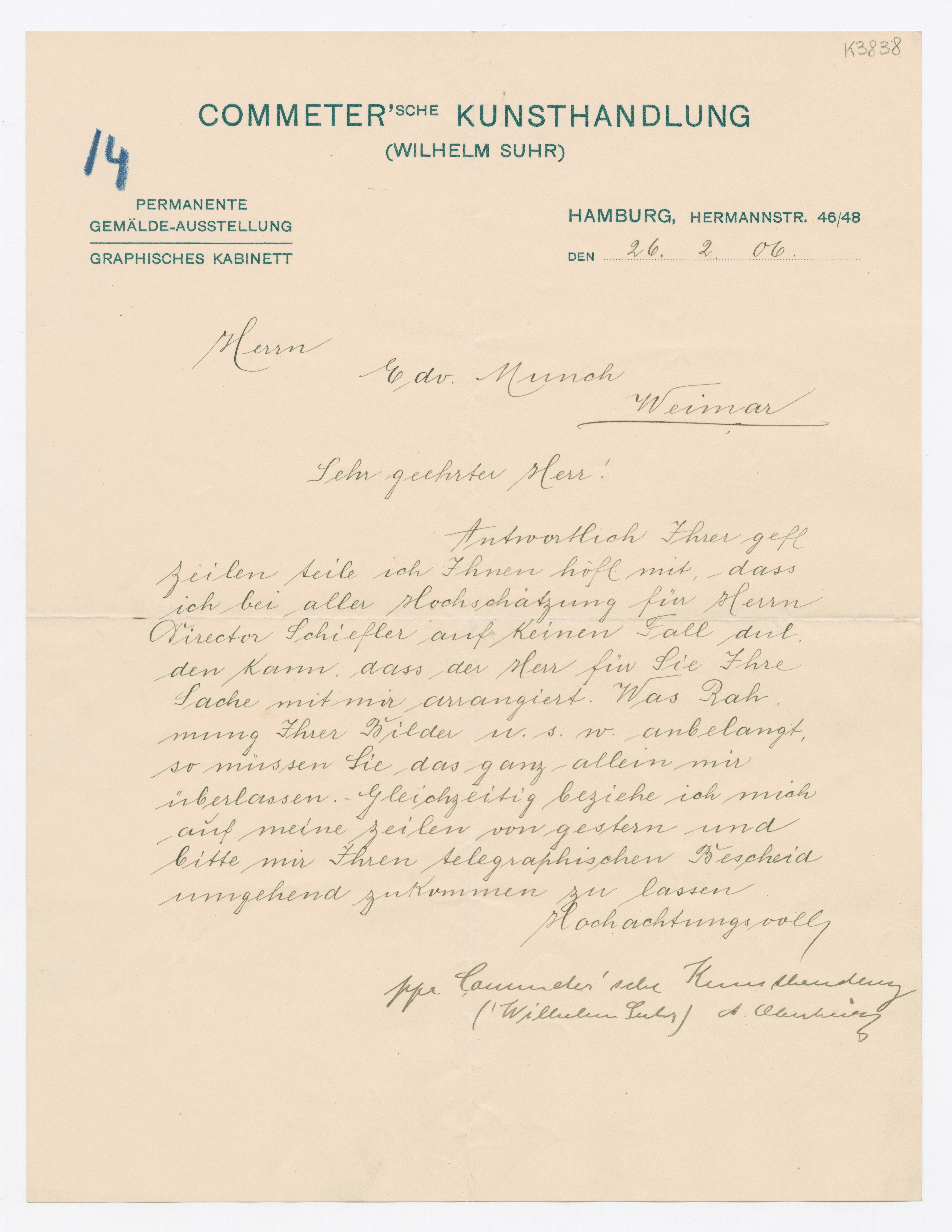 MM K 3838, Munchmuseet. Datert 26.02.1906. Brev fra Albert Oberheide, Commeter'sche Kunsthandlung.