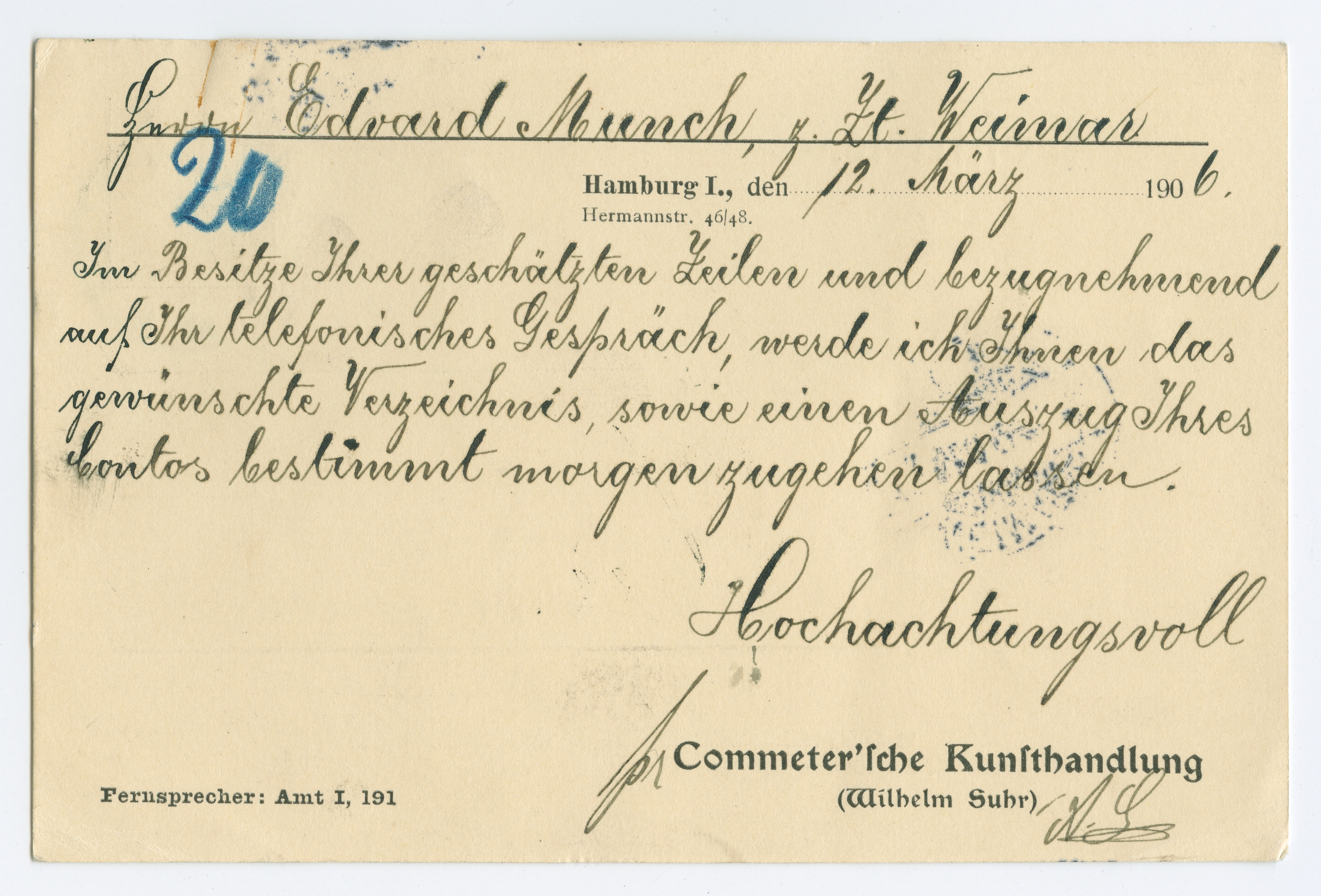 MM K 3842, Munchmuseet. Datert 12.03.1906. Brev fra Albert Oberheide, Commeter'sche Kunsthandlung.
