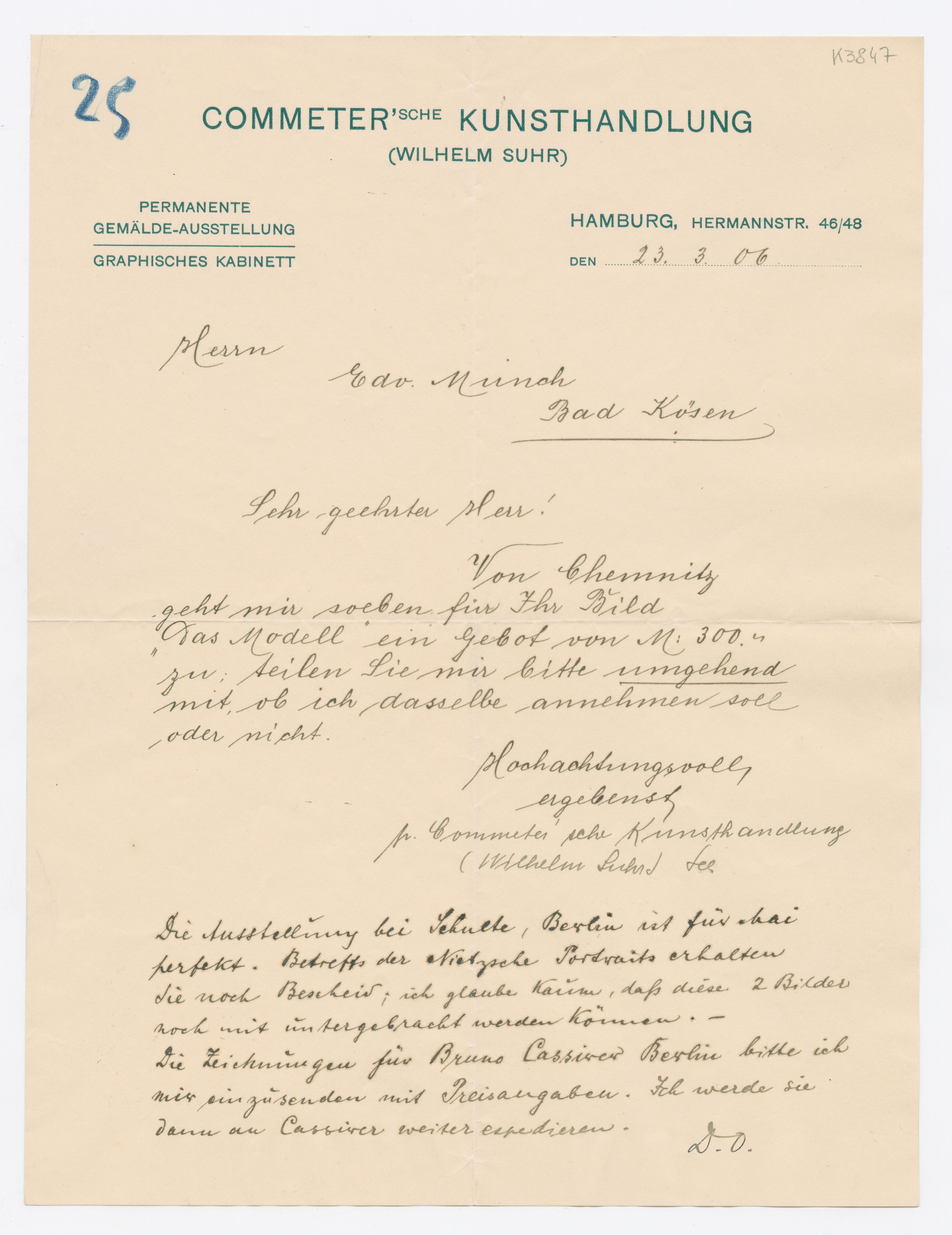 MM K 3847, Munchmuseet. Datert 23.03.1906. Brev fra Wilhelm Suhr, Commeter'sche Kunsthandlung.