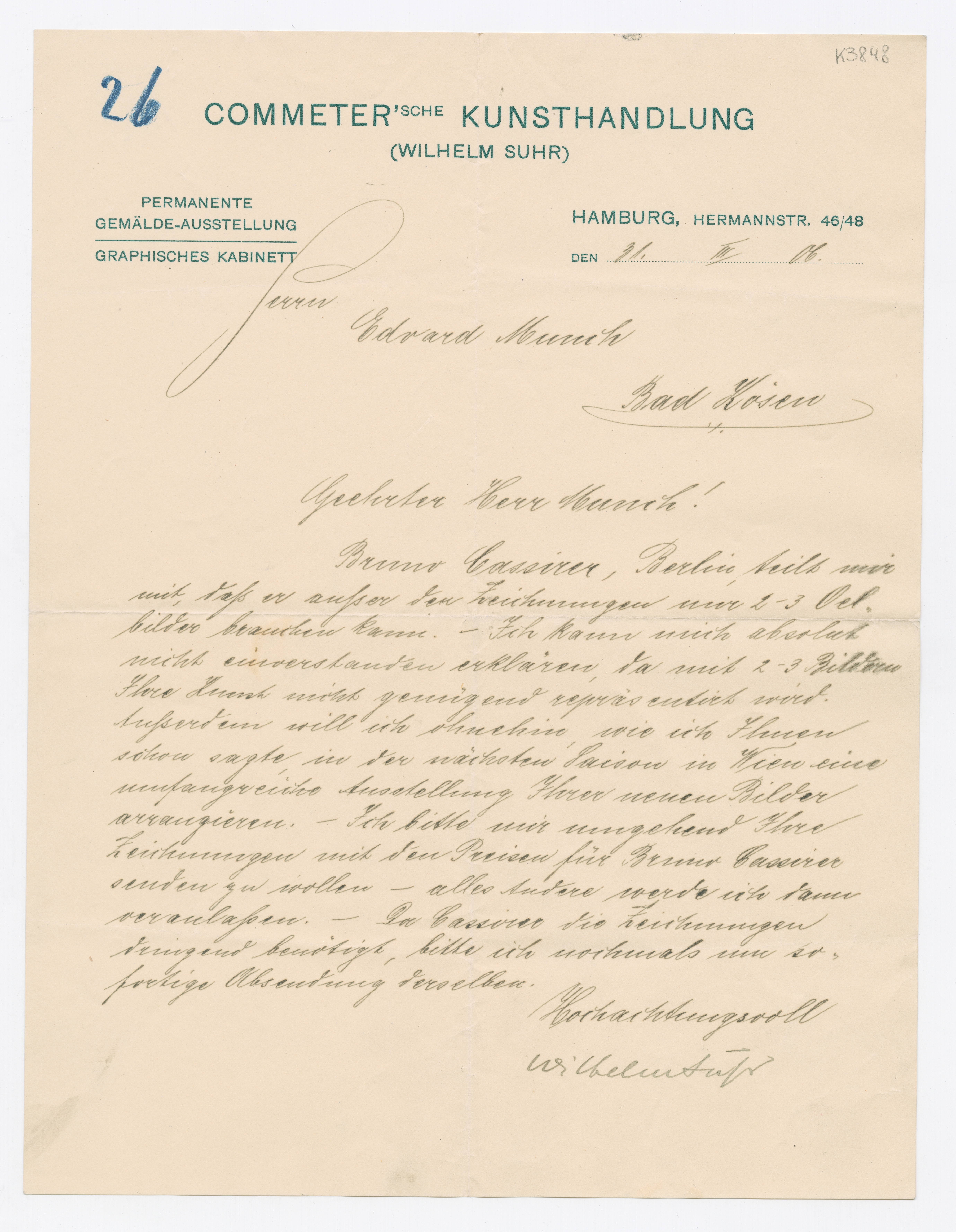 MM K 3848, Munchmuseet. Datert 31.03.1906. Brev fra Wilhelm Suhr, Commeter'sche Kunsthandlung.