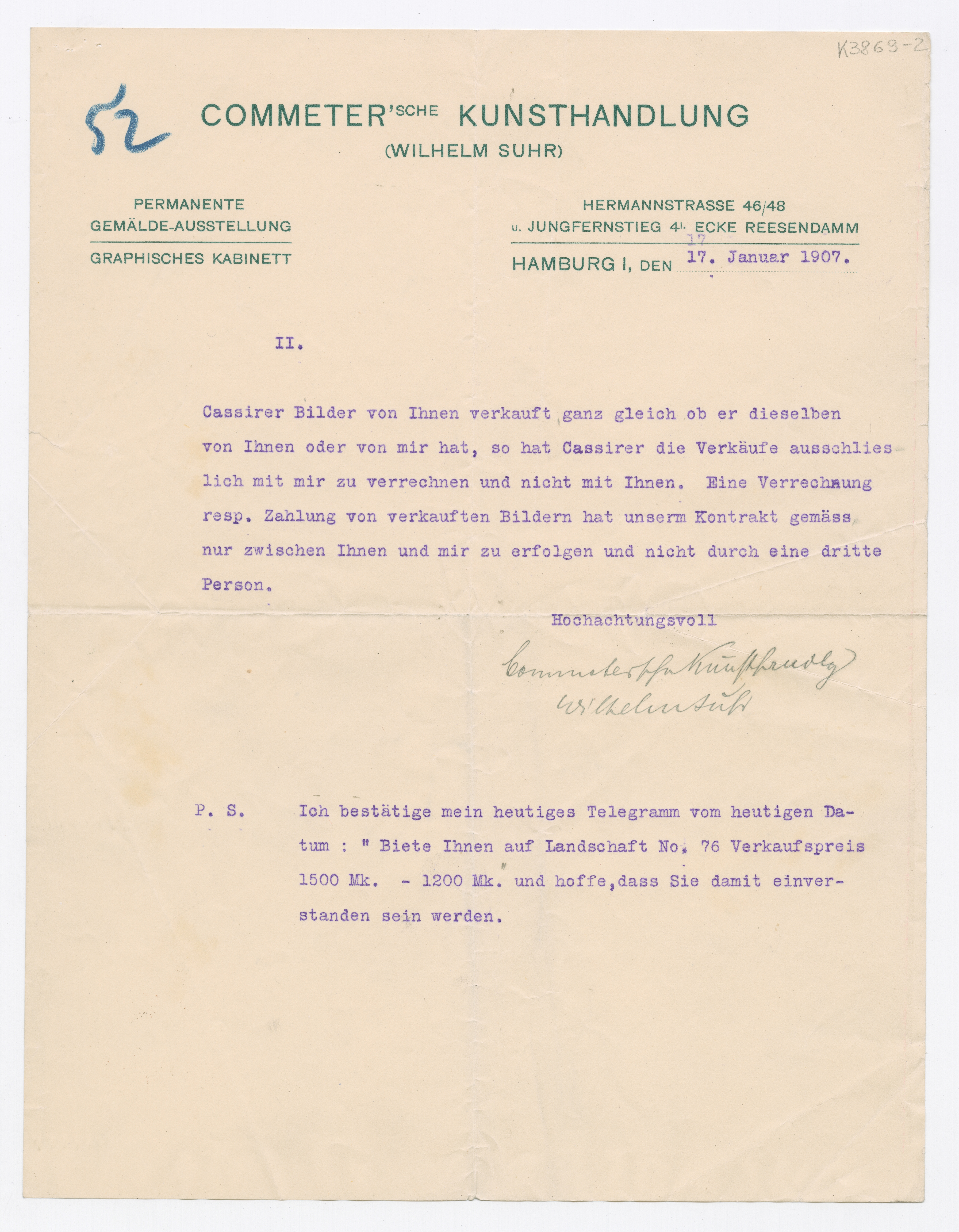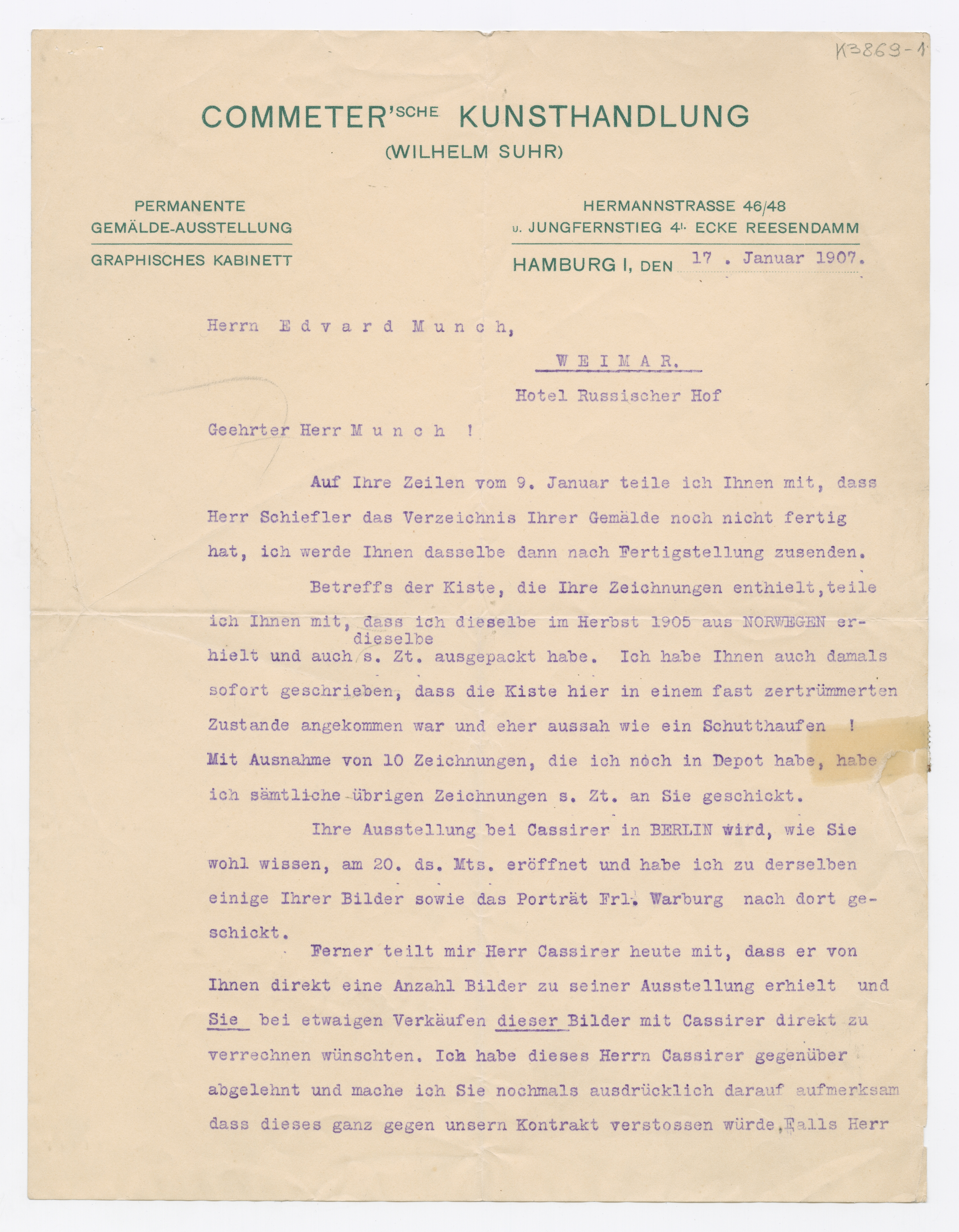 MM K 3869, Munchmuseet. Datert 17.01.1907. Brev fra Wilhelm Suhr, Commeter'sche Kunsthandlung.