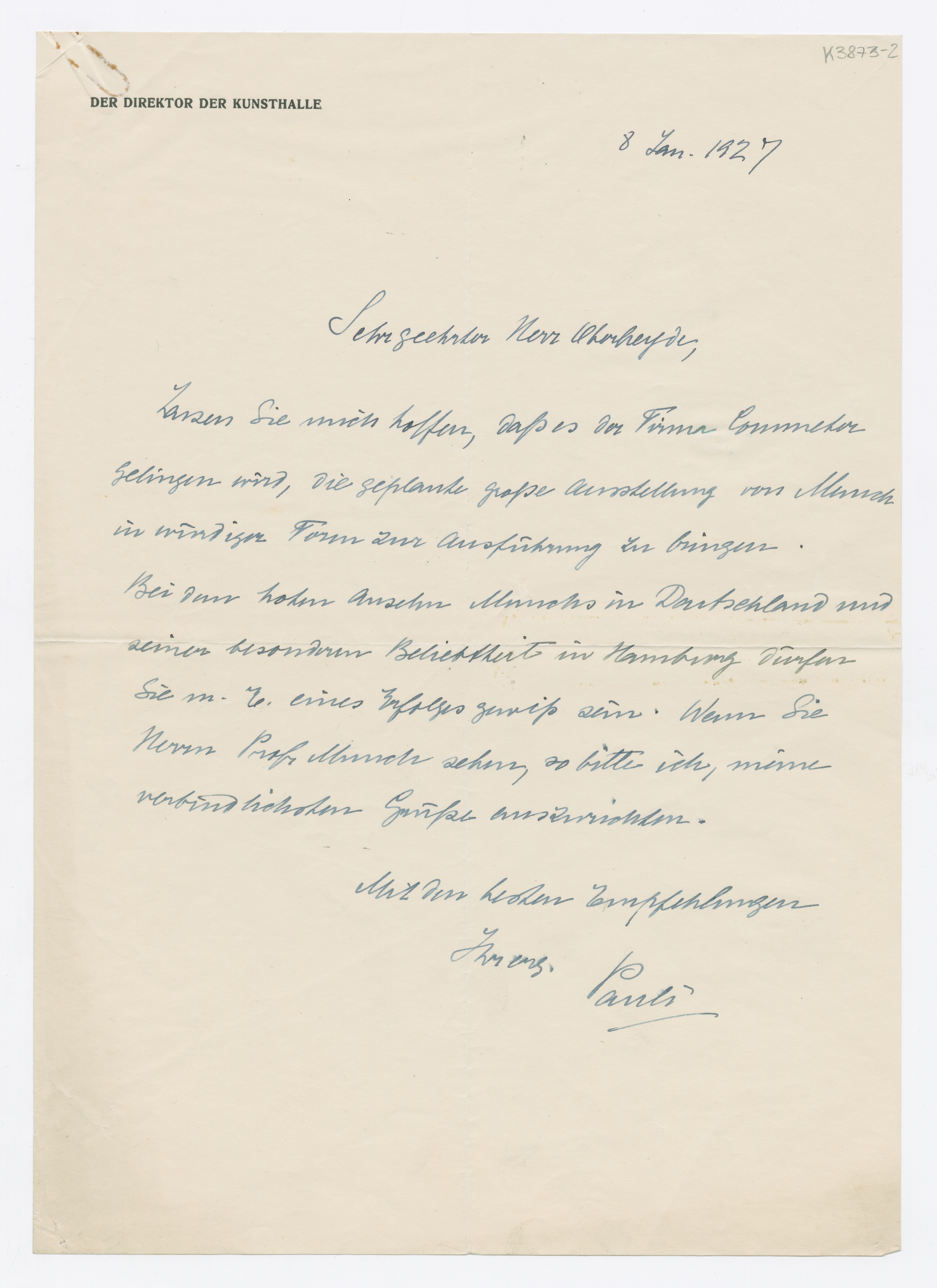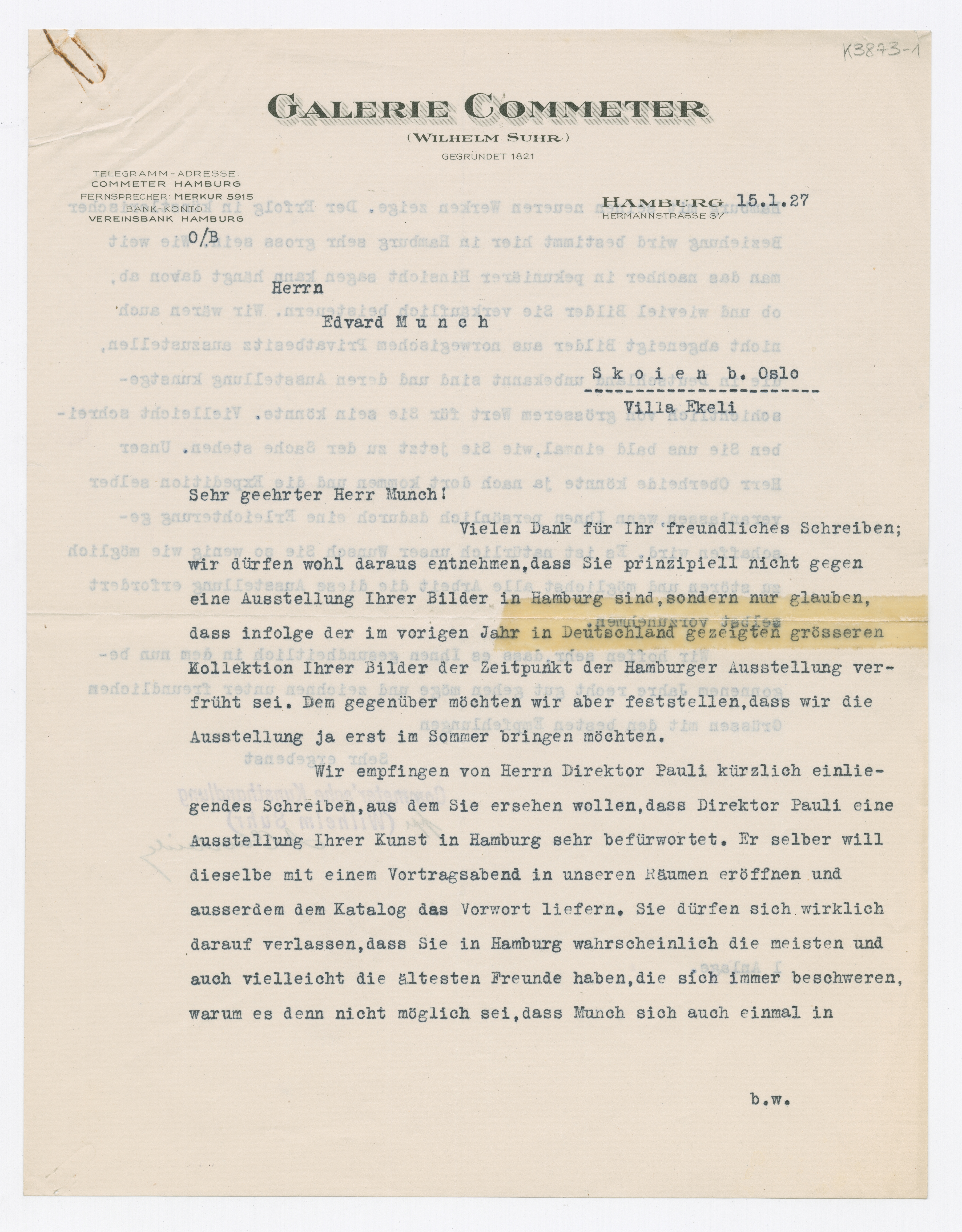 MM K 3873, Munchmuseet. Datert 15.01.1927. Brev fra Albert Oberheide, Gustav Pauli, Commeter'sche Kunsthandlung.