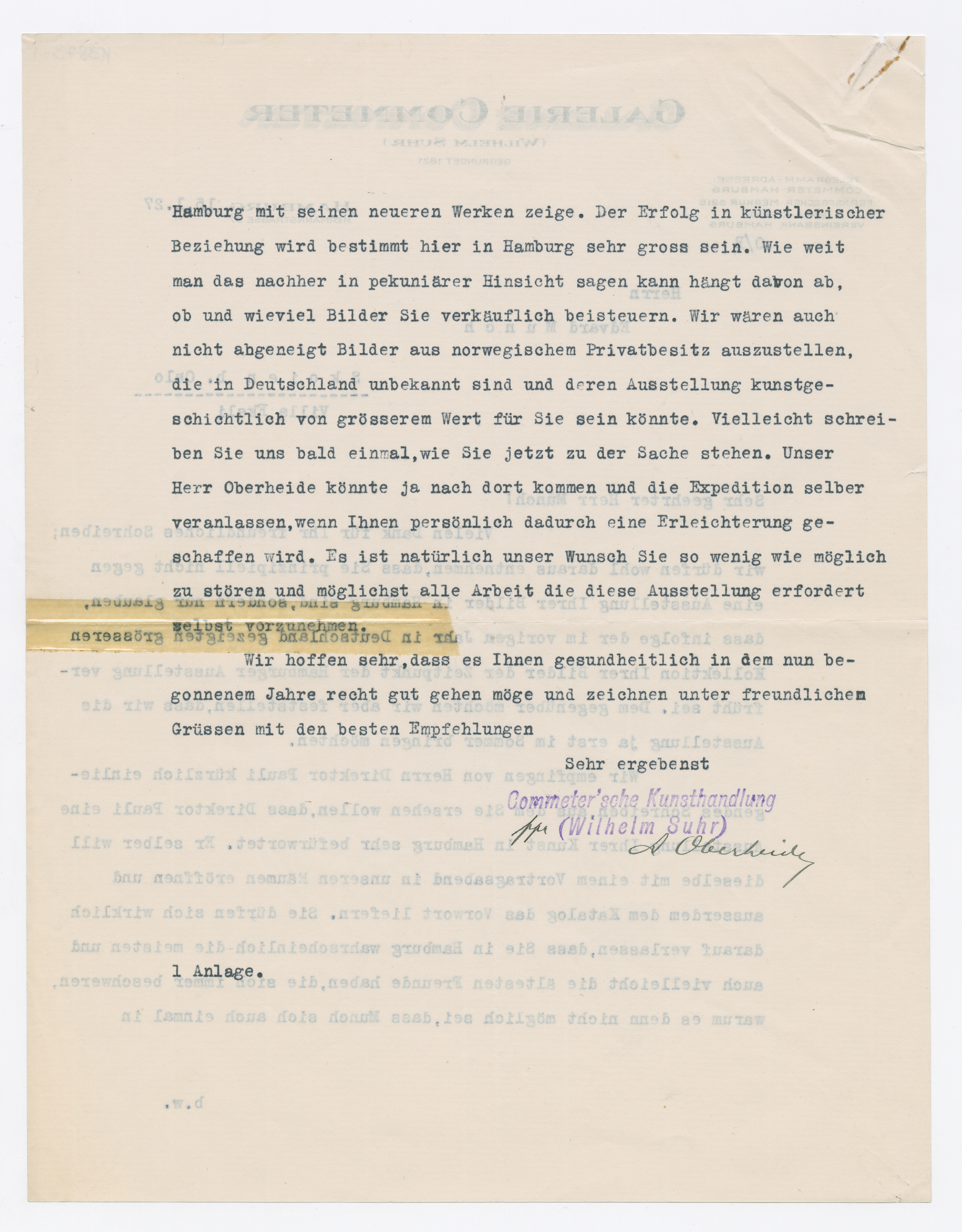 Brev fra Albert Oberheide, Gustav Pauli, Commeter'sche Kunsthandlung.
