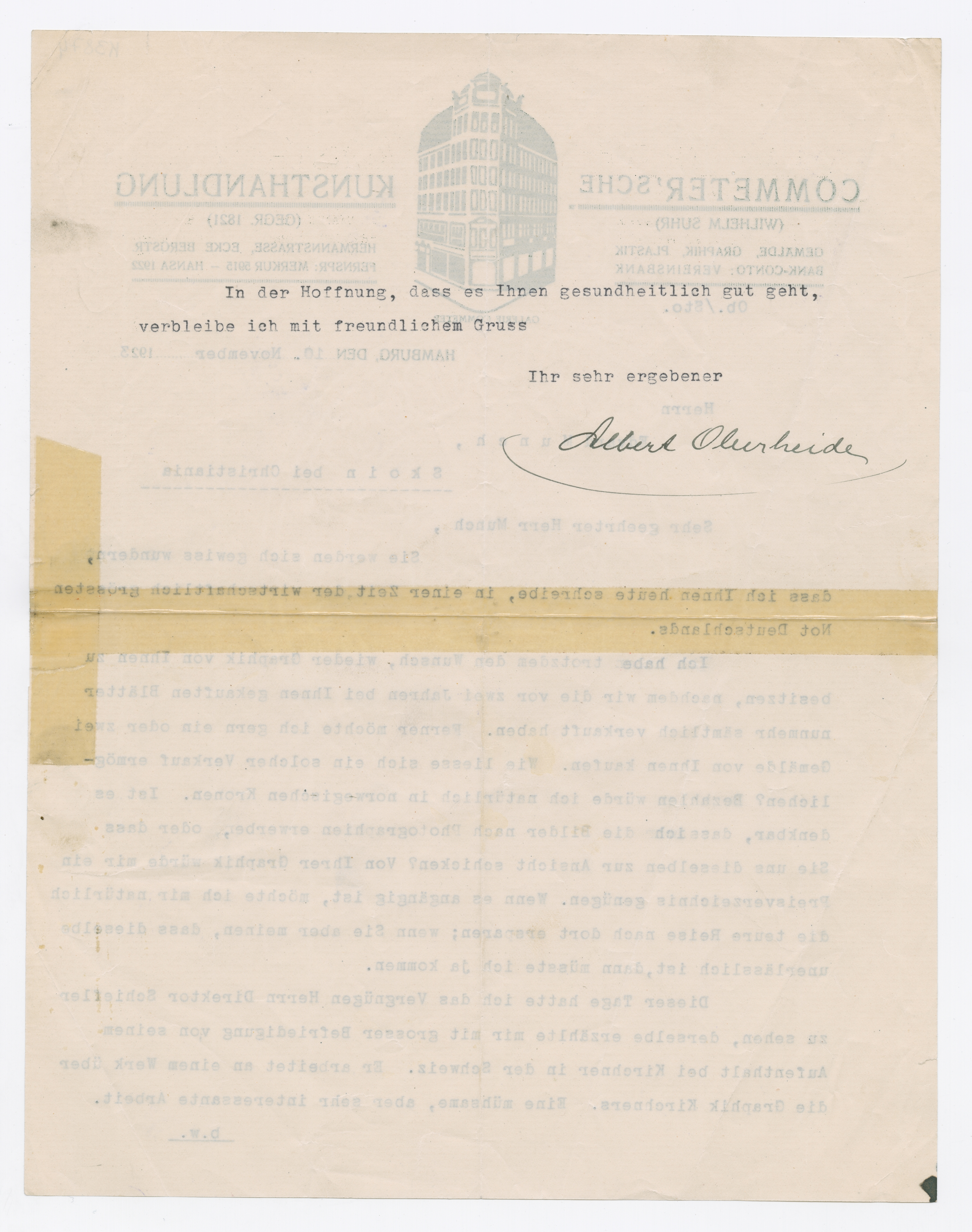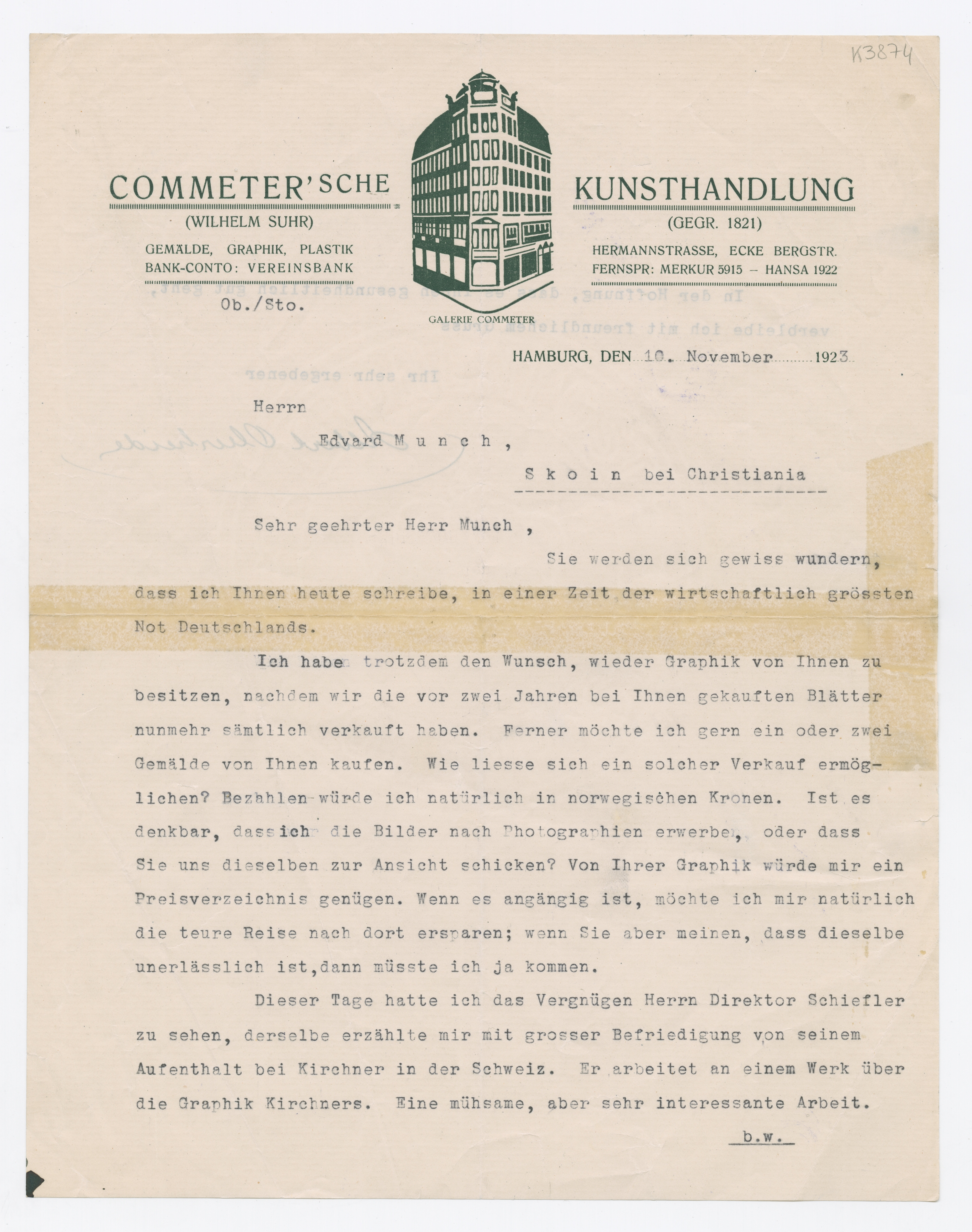 MM K 3874, Munchmuseet. Datert 10.11.1923. Brev fra Albert Oberheide, Commeter'sche Kunsthandlung.