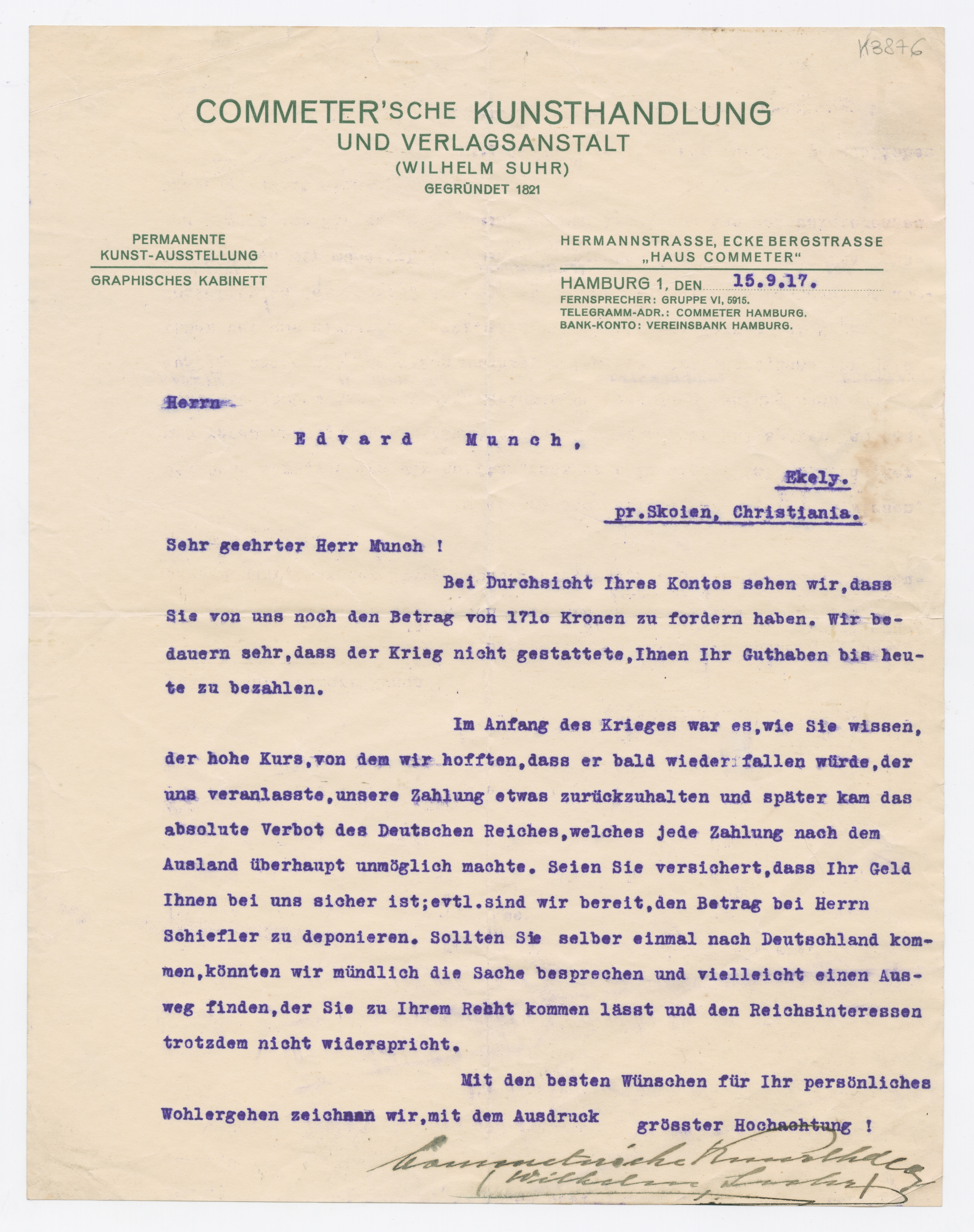 MM K 3876, Munchmuseet. Datert 15.09.1917. Brev fra Wilhelm Suhr, Commeter'sche Kunsthandlung.
