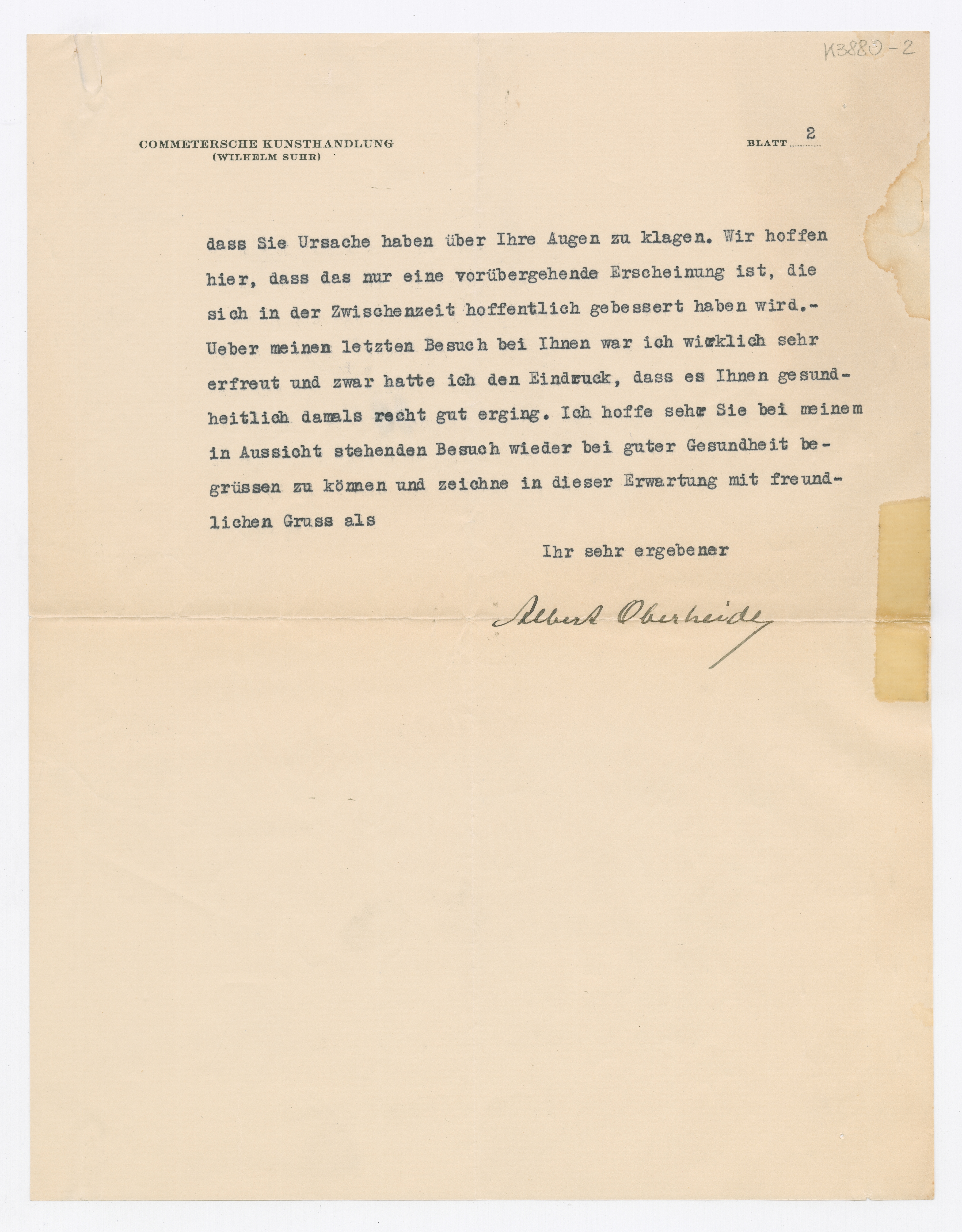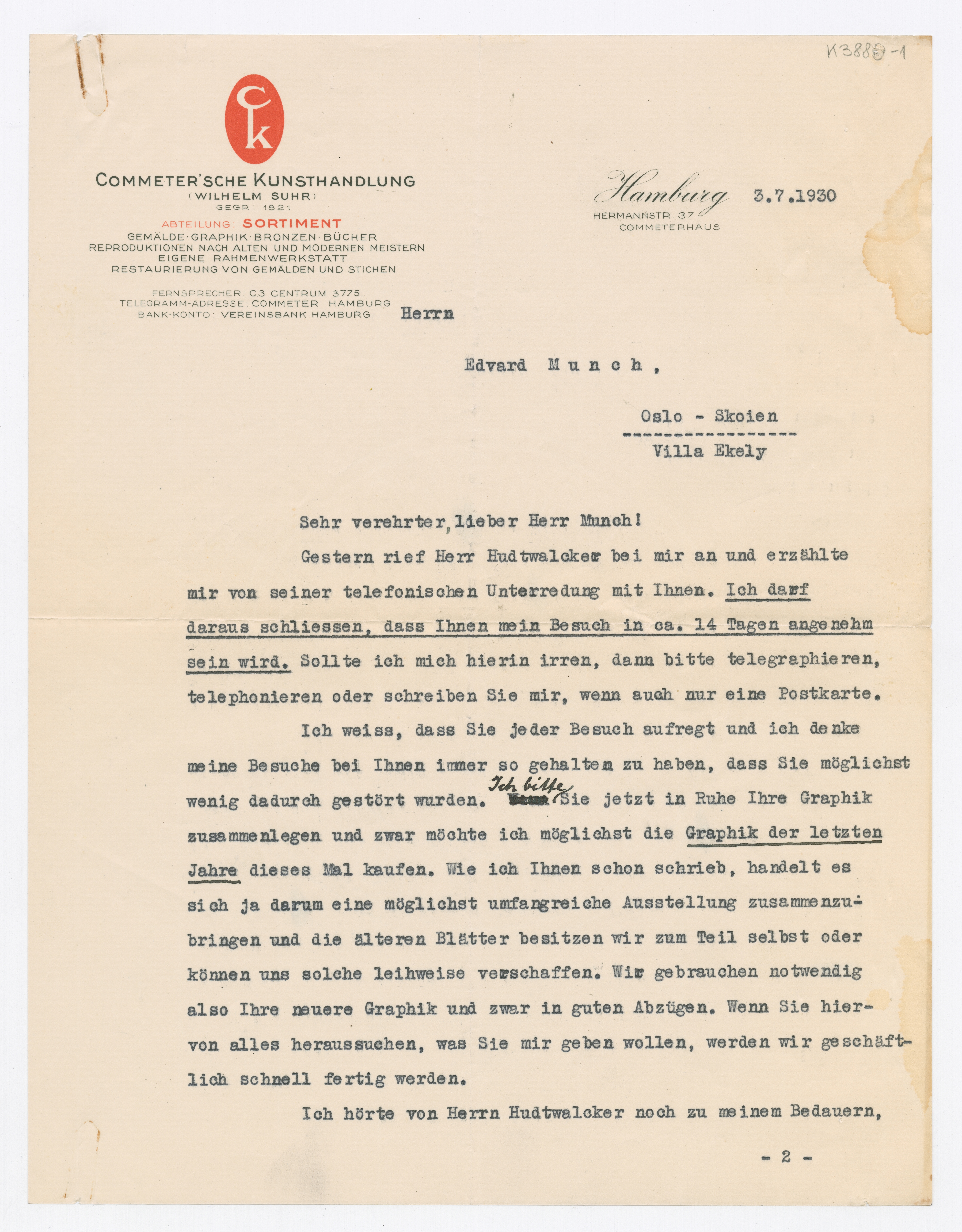 MM K 3880, Munchmuseet. Datert 03.07.1930. Brev fra Albert Oberheide, Commeter'sche Kunsthandlung.